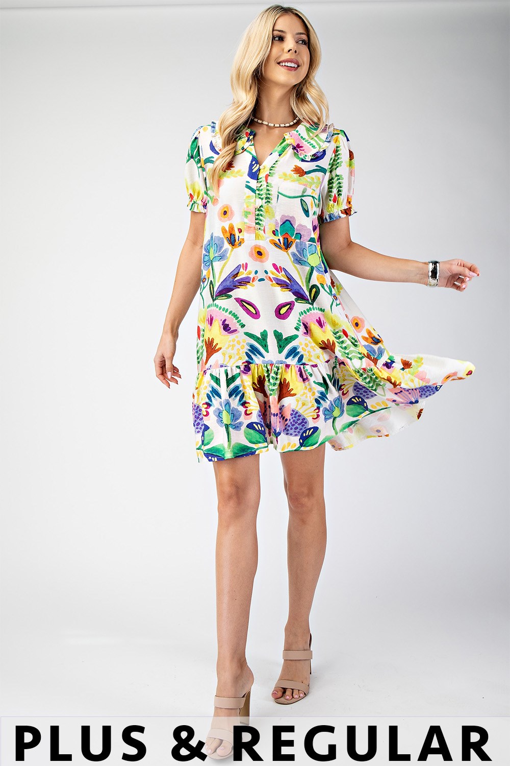 Floral Print Ruffled Neck Mini Dress with Contrasting Stripe Accents and Layered Ruffle Sleeves. The Skirt is Lined