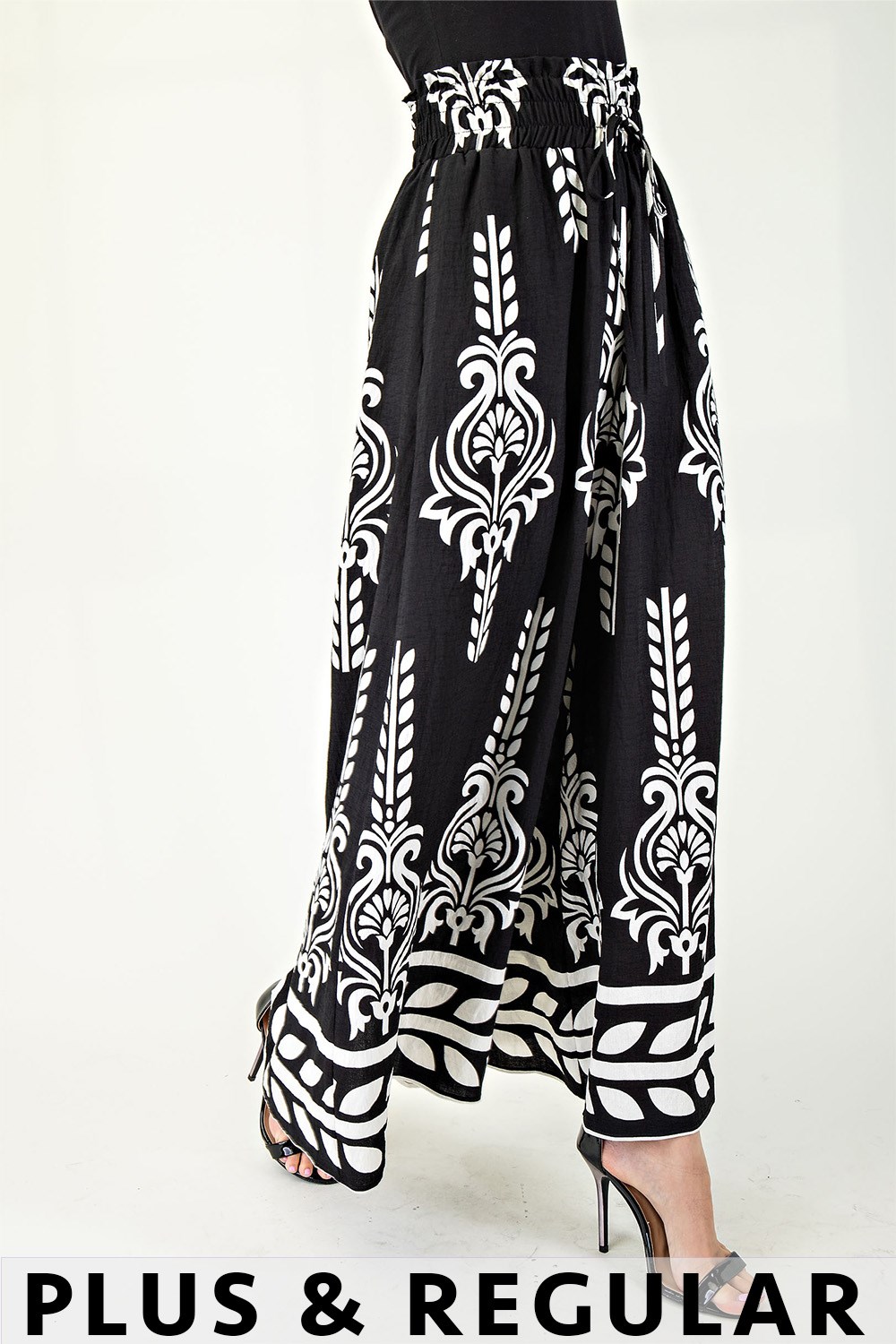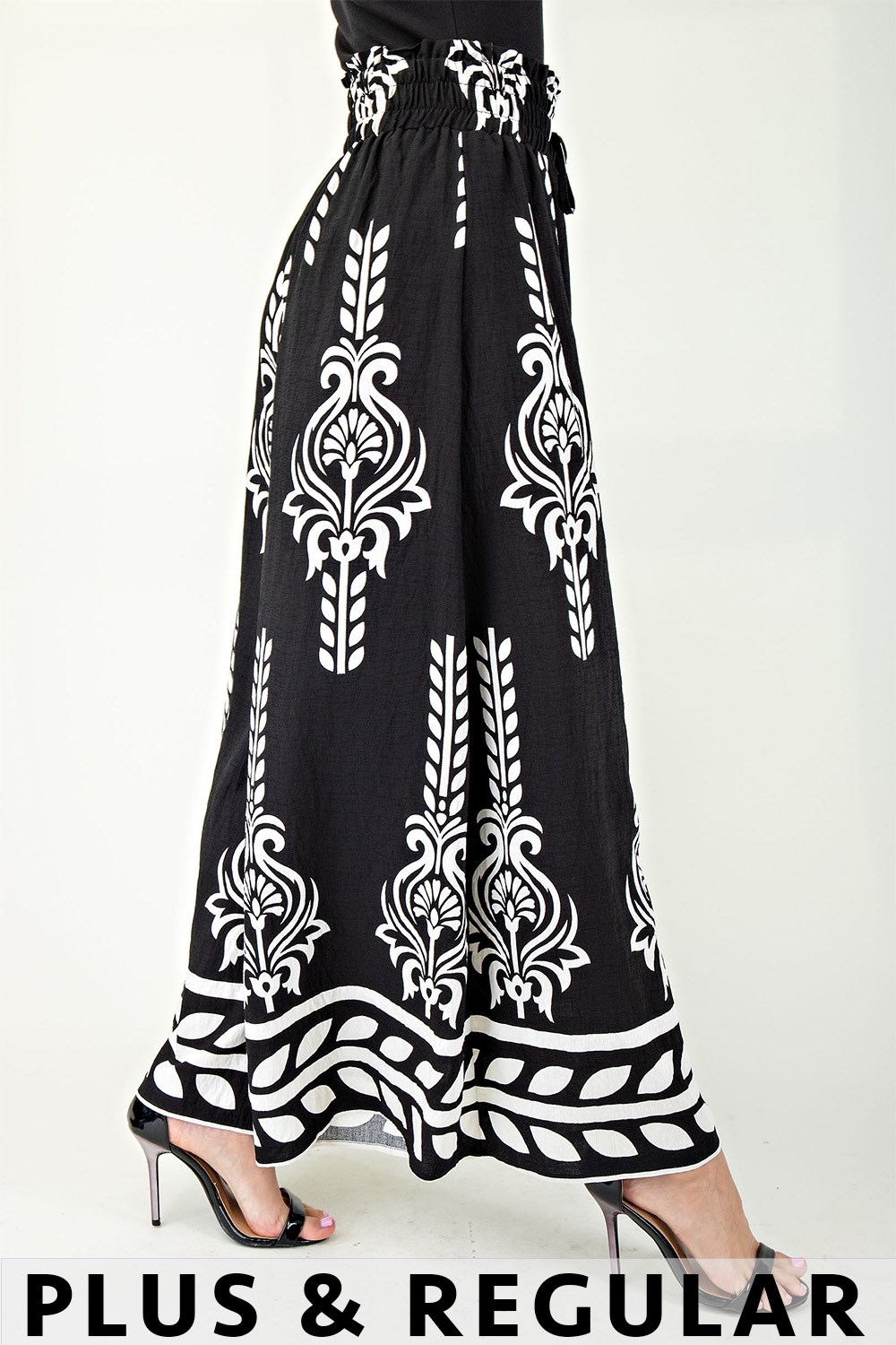 Printed Wide Leg Long Pants with an Elastic Waist and Tie String