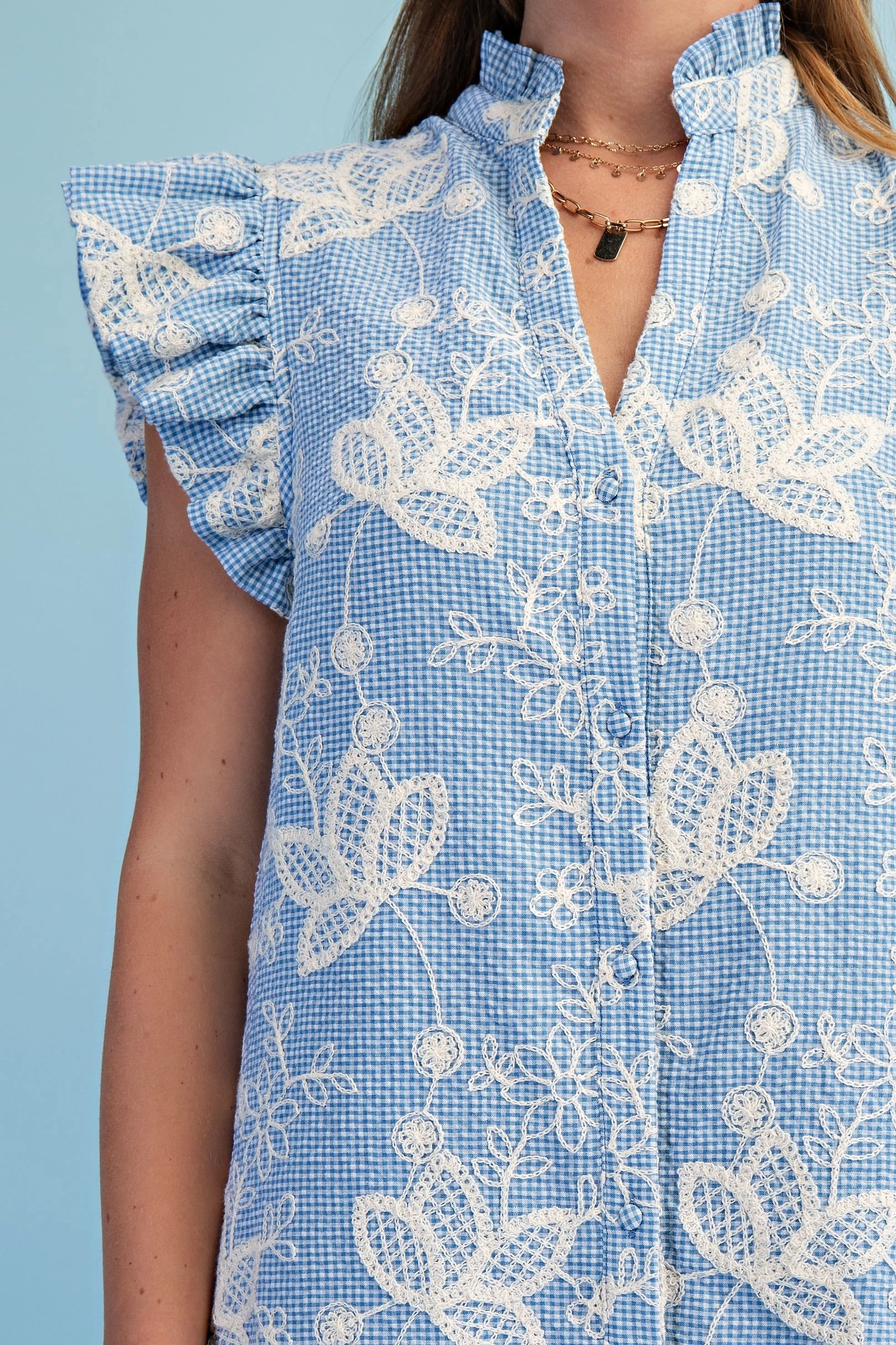 Eyelet V-Neck Mini Dress with a Ruffle Sleeve and Trimmed Neck. The Dress is Lined