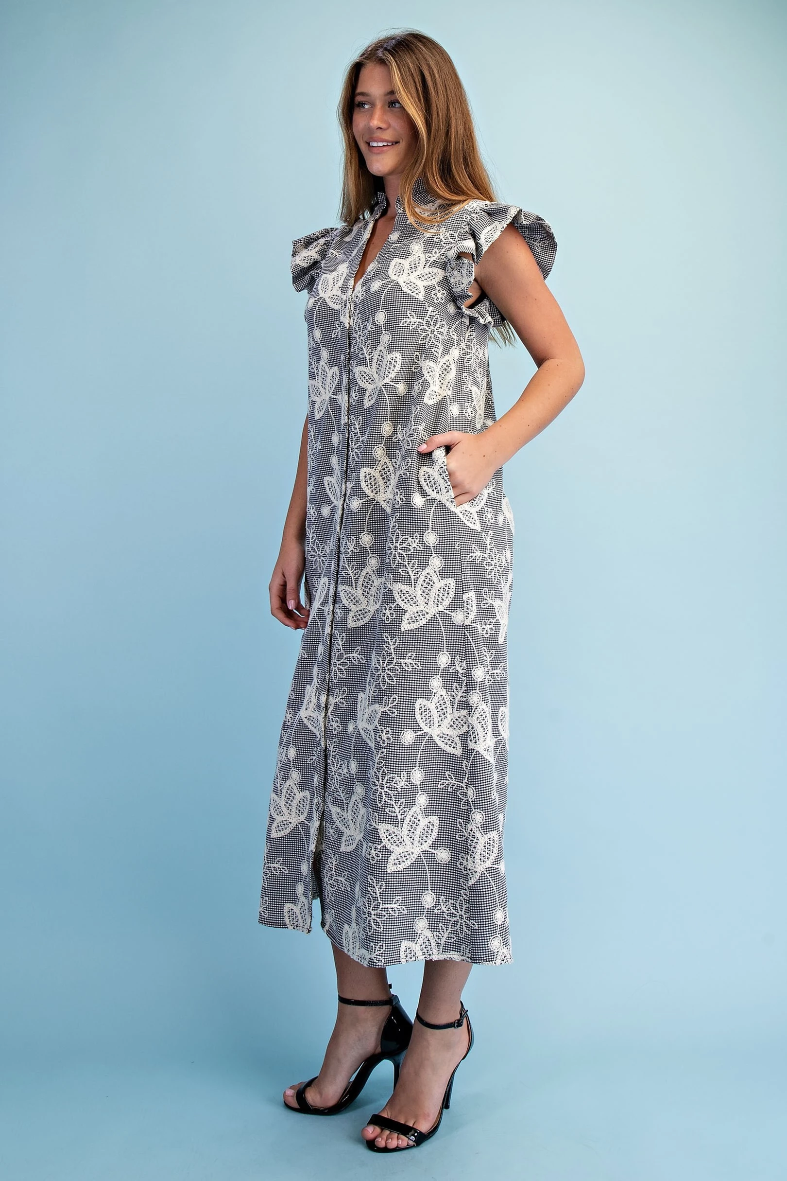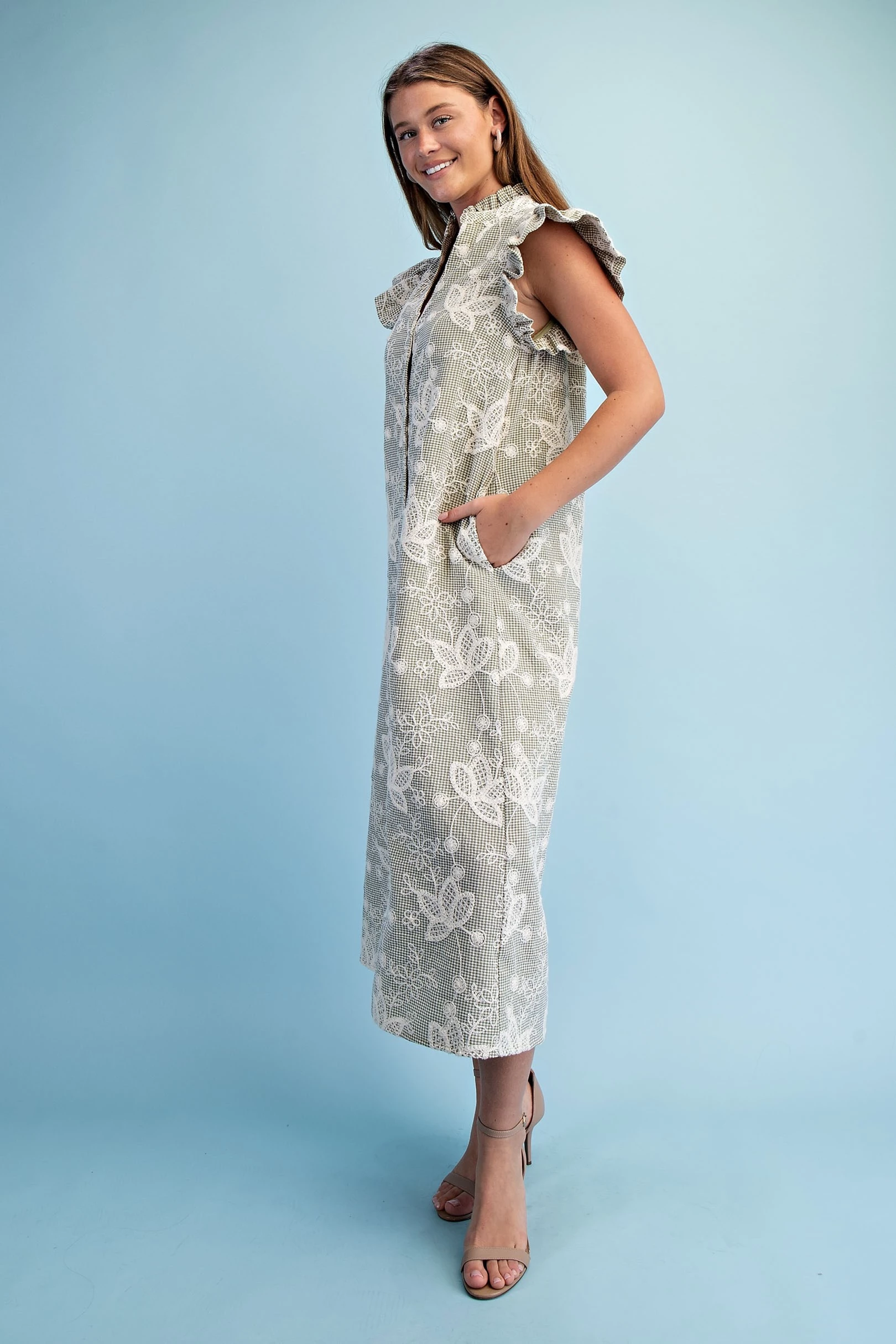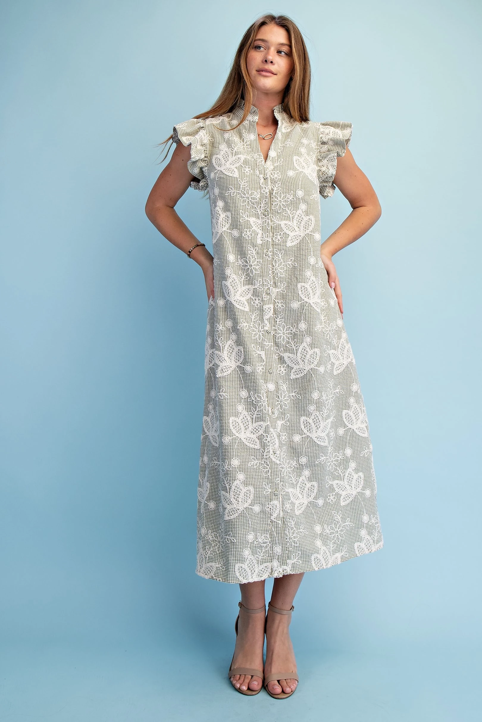 Linen V-Neck Dress with Embroidered AppliquΓ© Design Details. The Dress is Lined