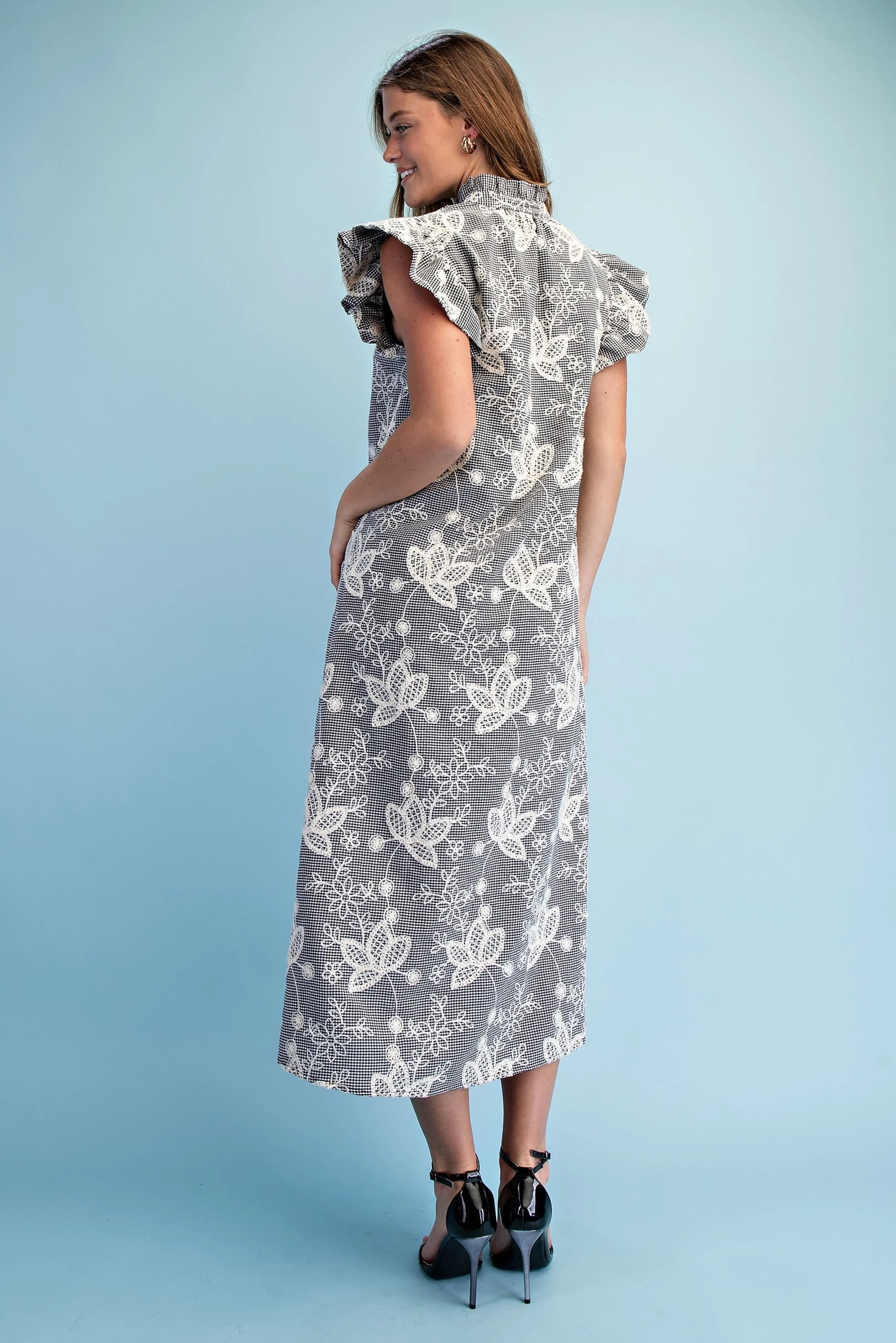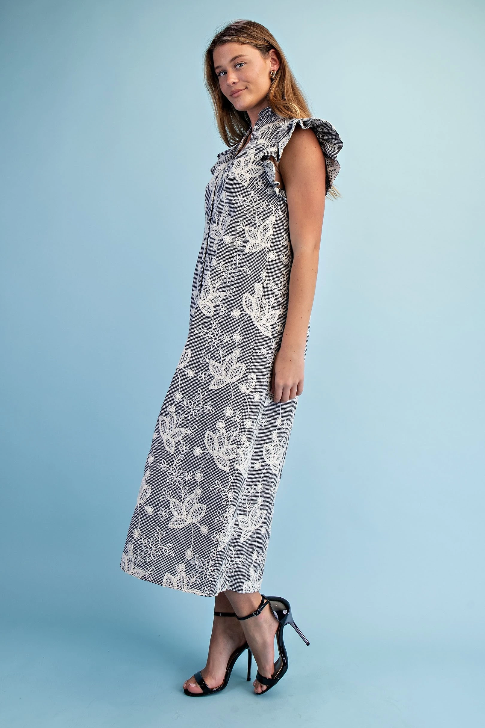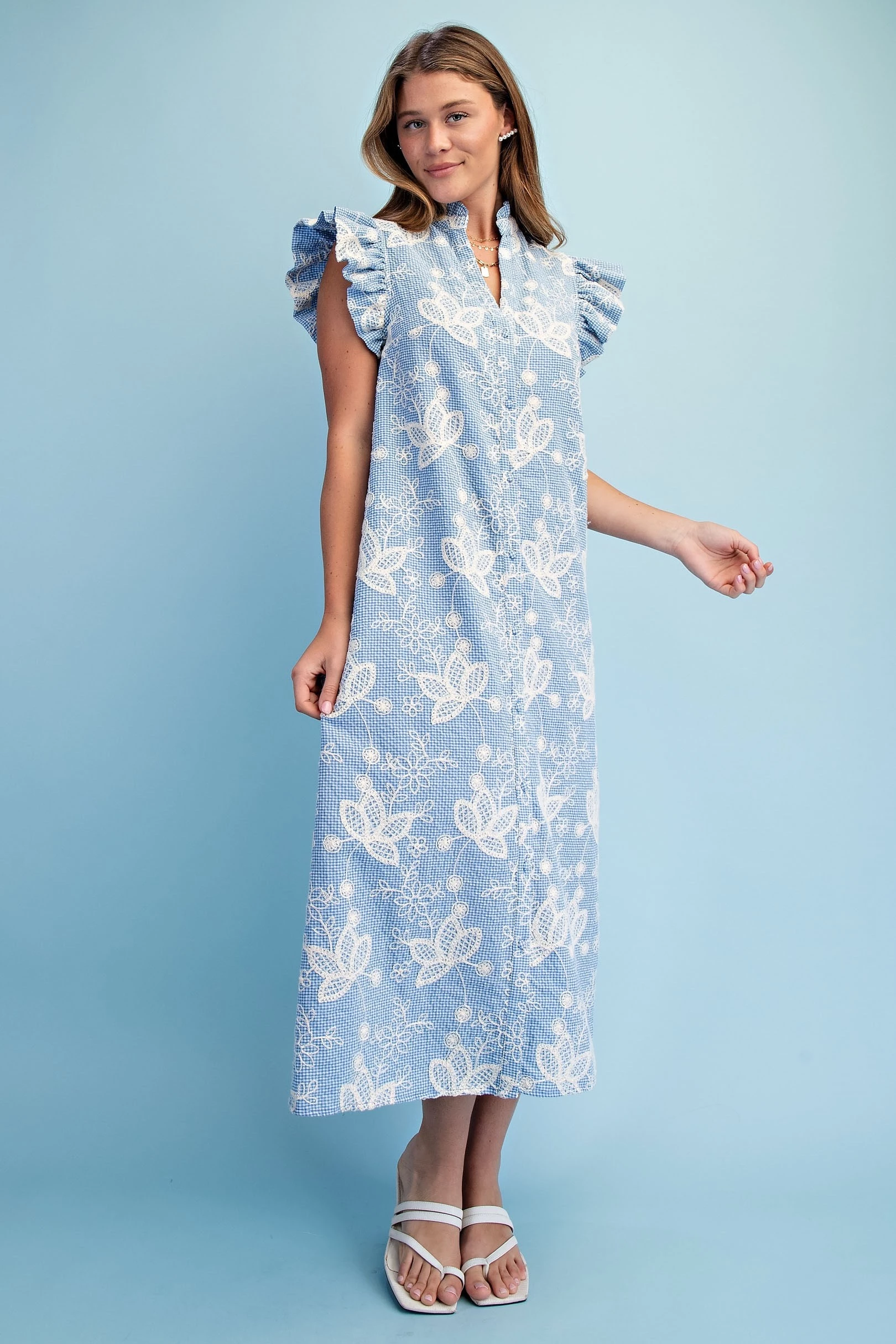 Linen V-Neck Dress with Embroidered AppliquΓ© Design Details. The Dress is Lined