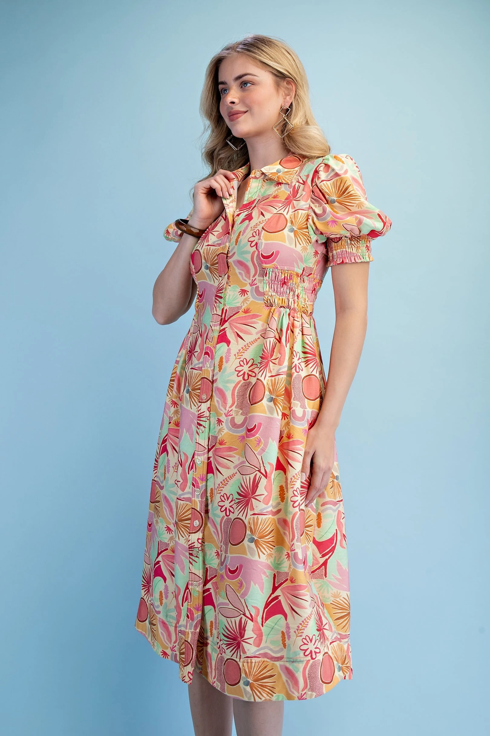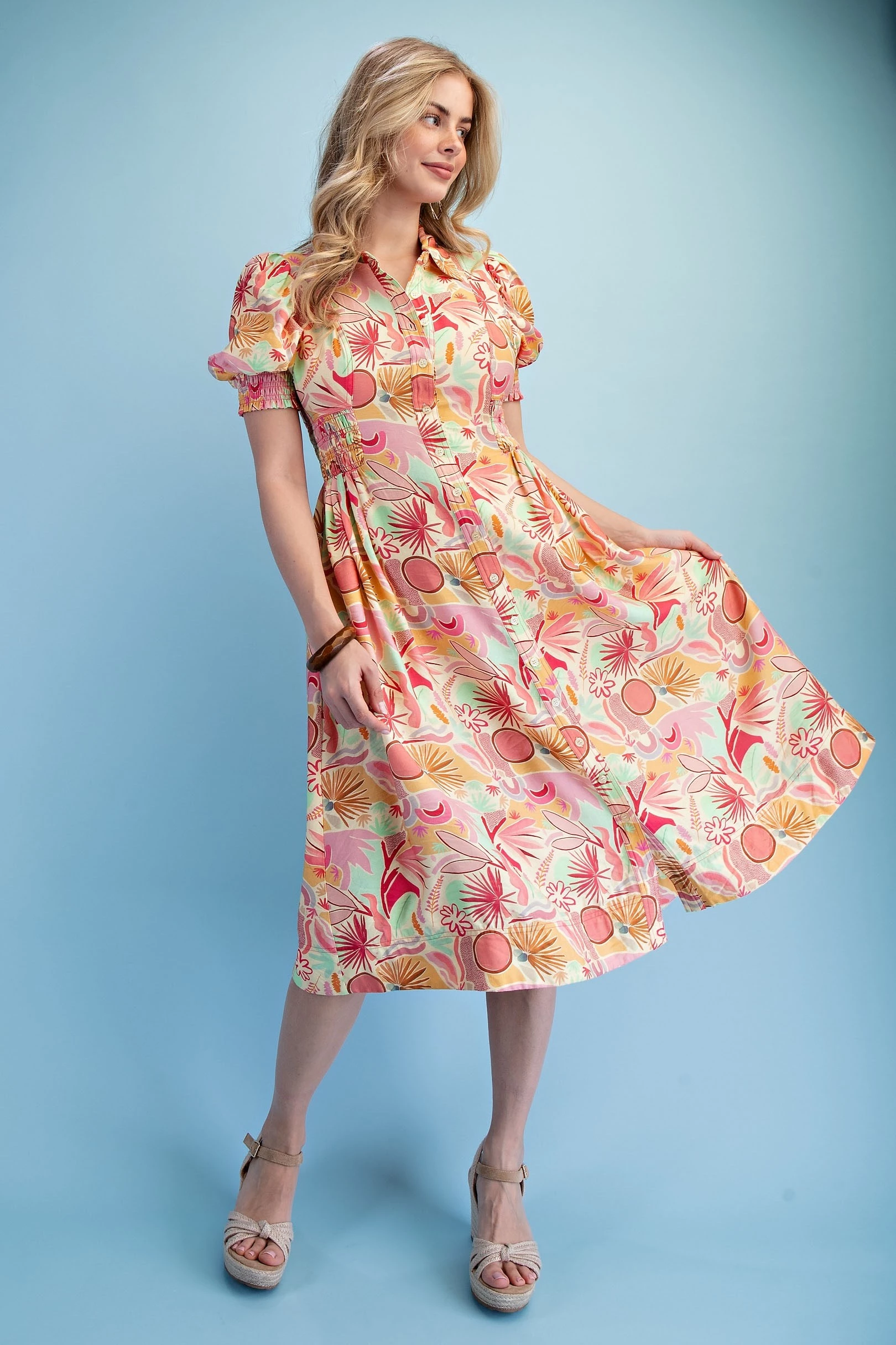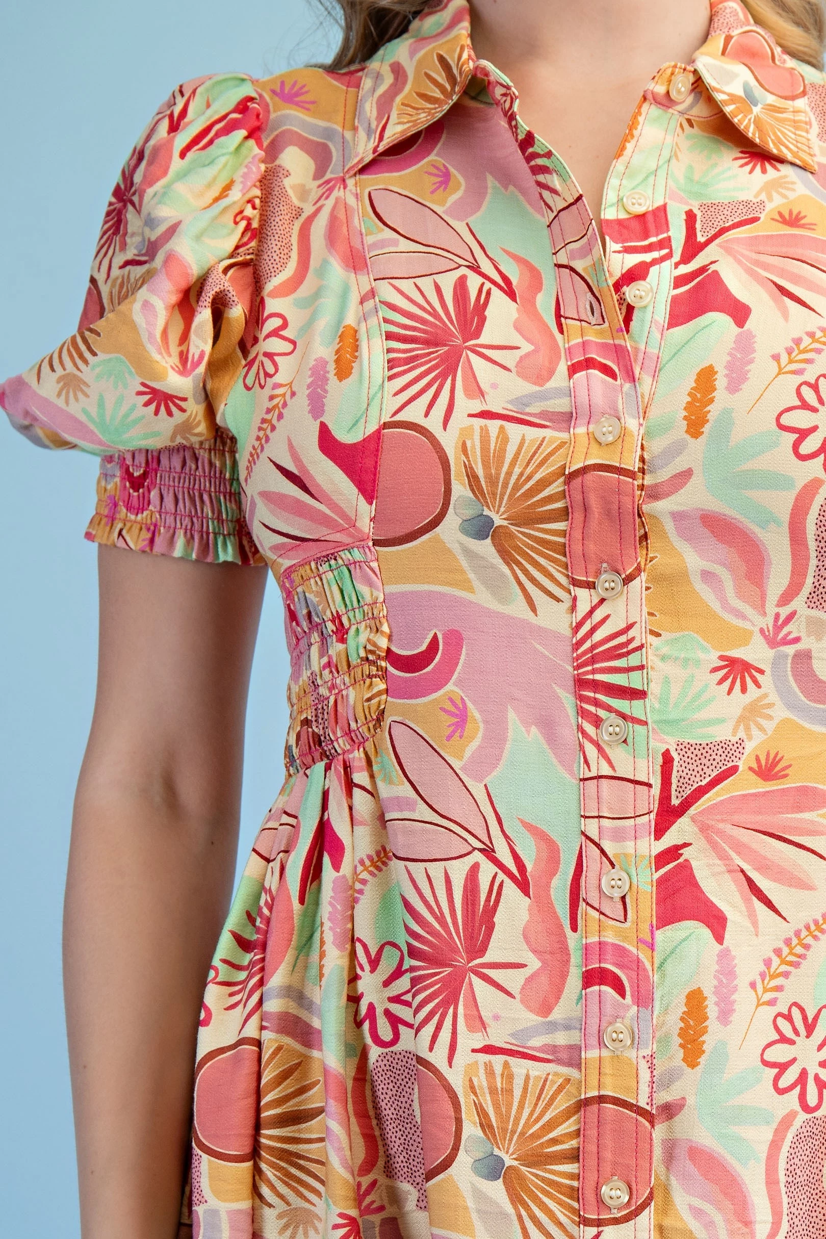 Abstract Midi Shirt Dress with Smocked Side Waist Details and Short Puff Sleeves