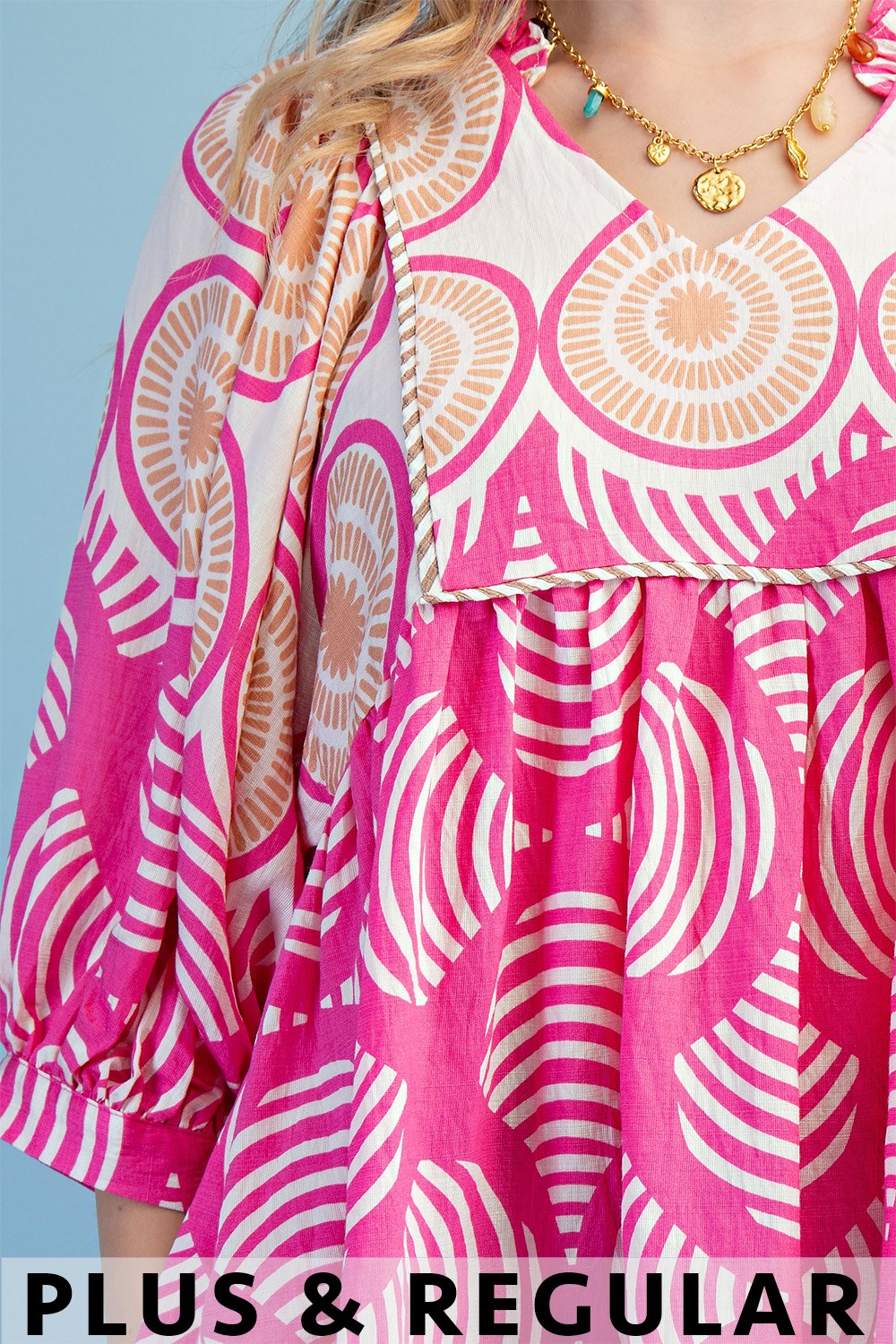 Printed Button Down Top with 3/4 Length Gathered Balloon Sleeves