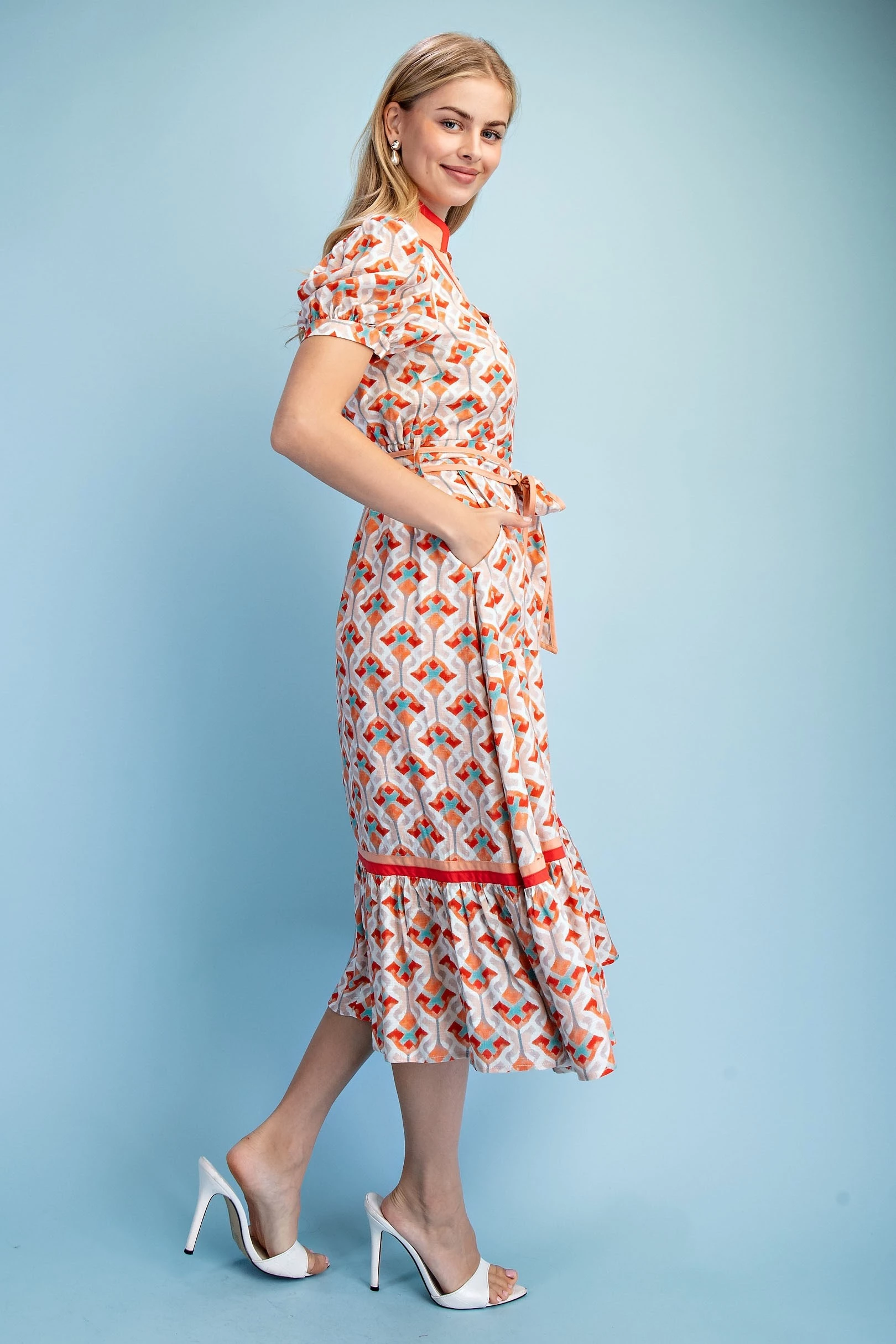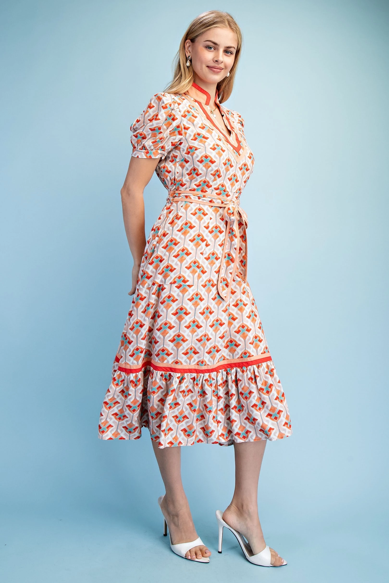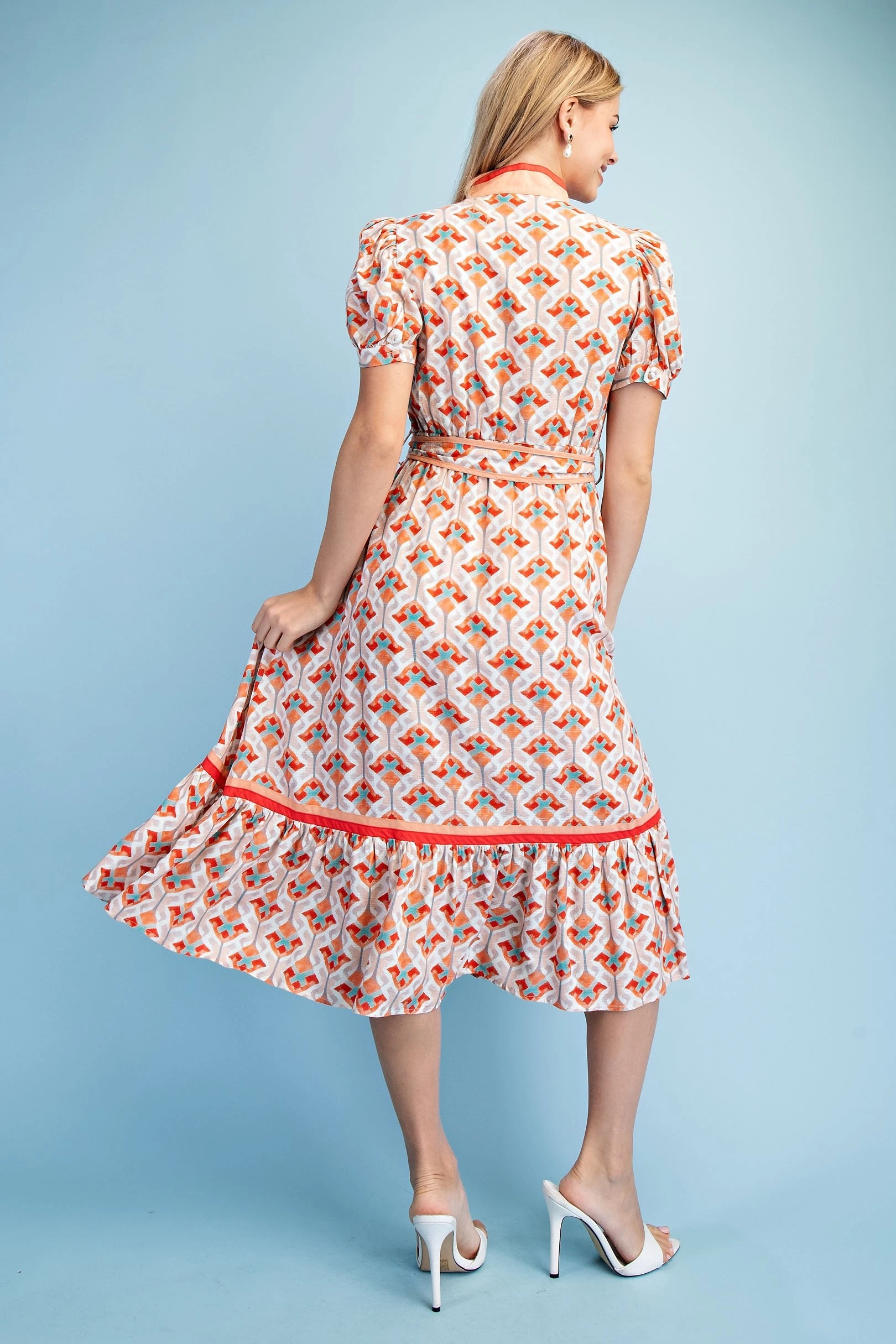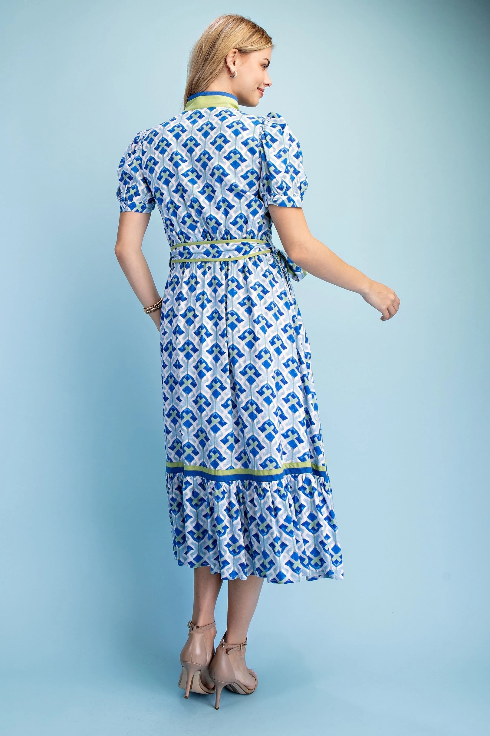 Short Bubble Sleeve Tired Midi Dress with Waist Tie