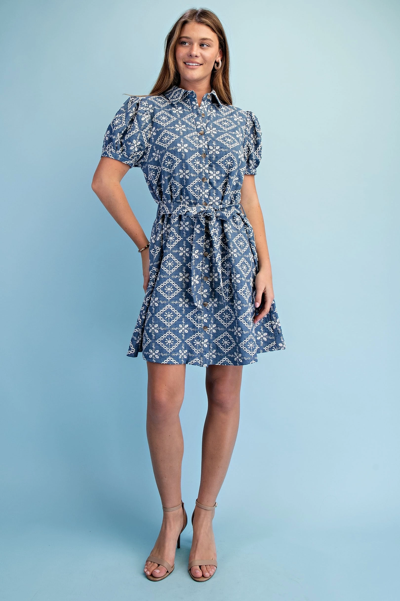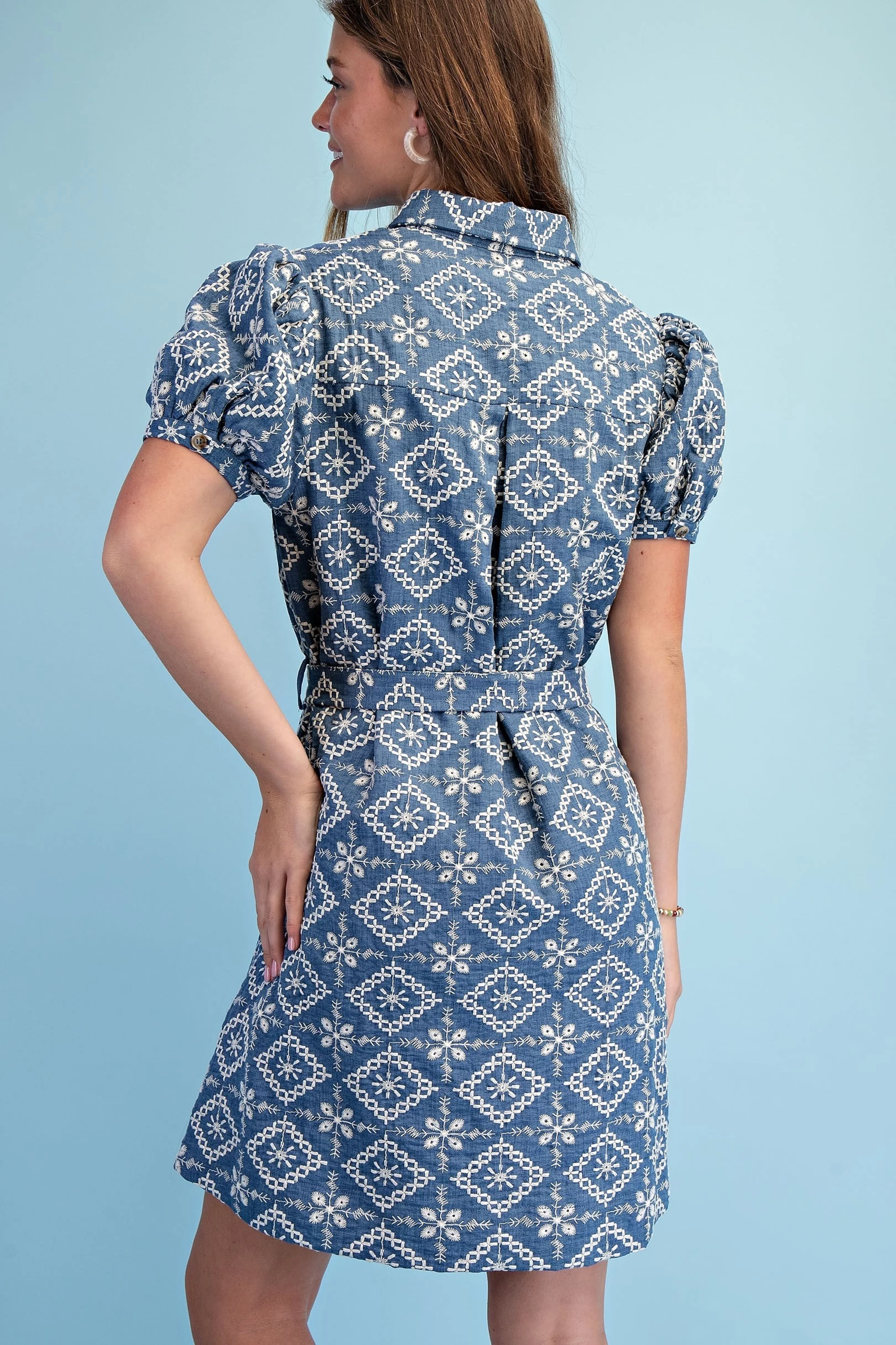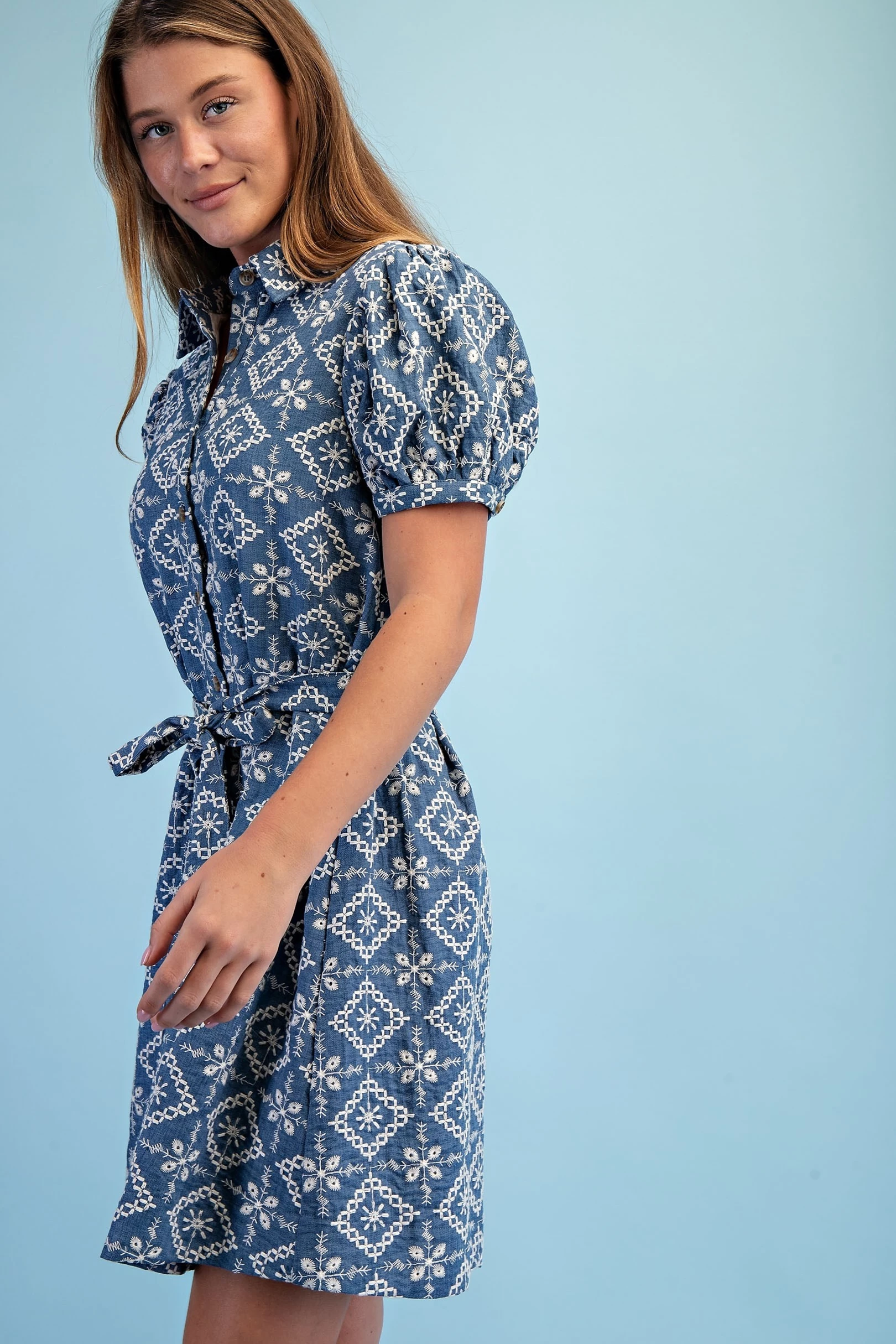 Textured Shirt Dress with Smocked Side Waist Details and Short Puff Sleeves