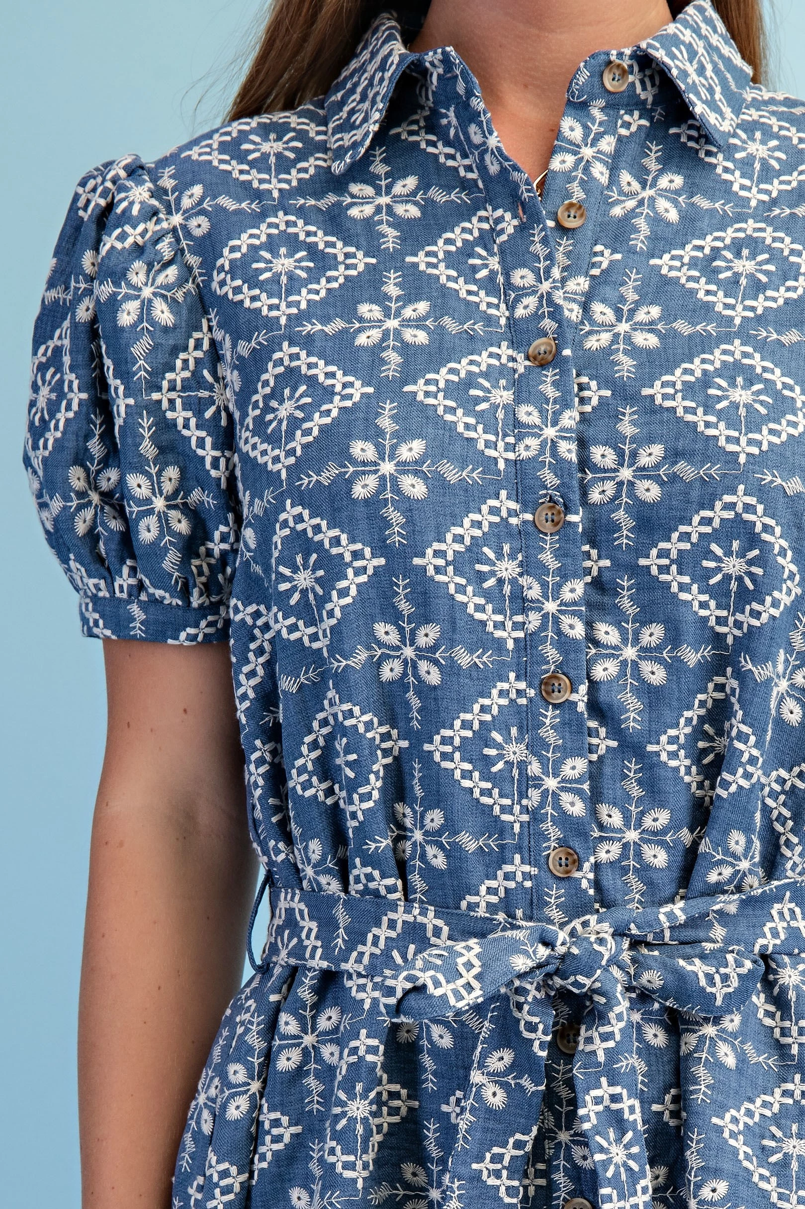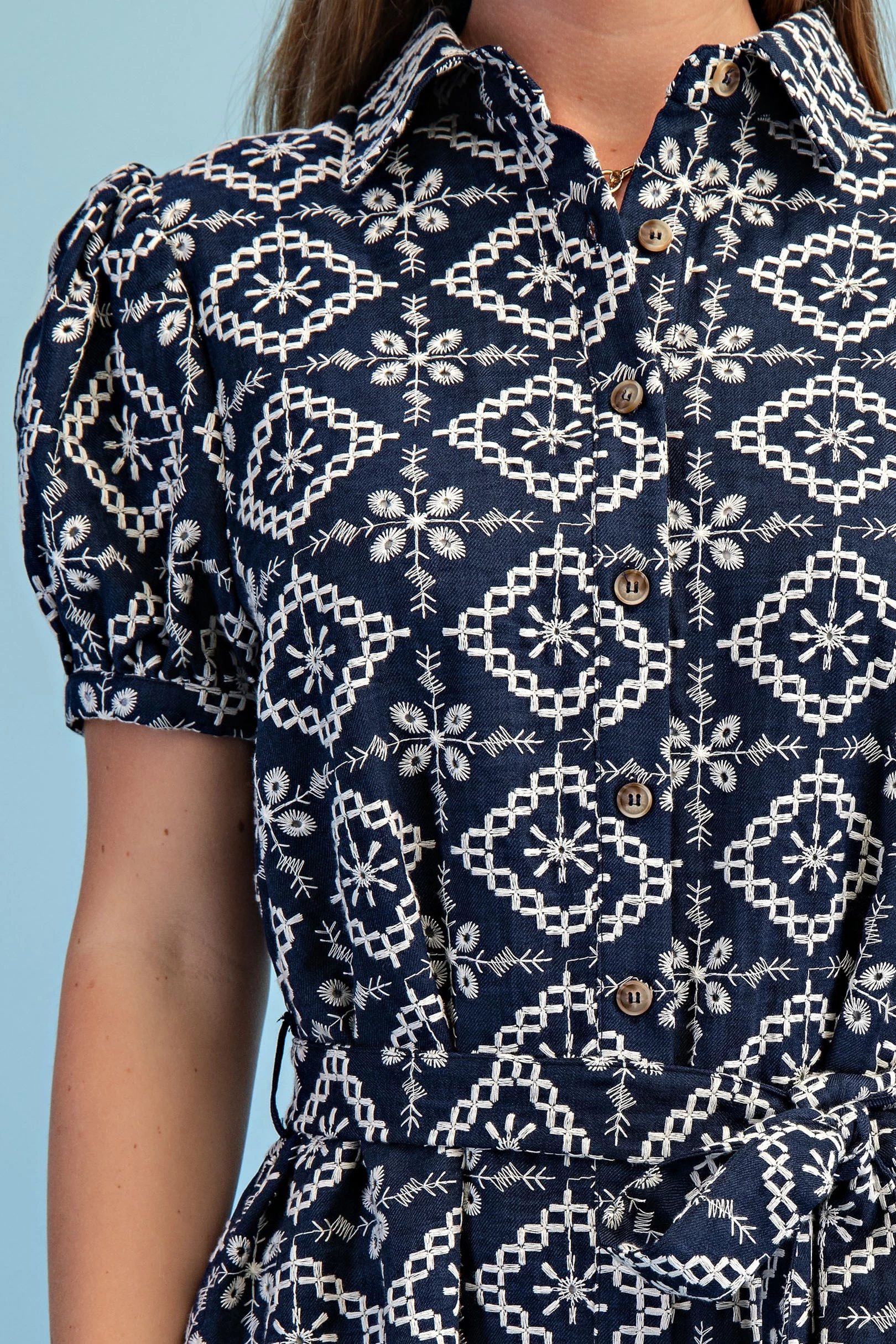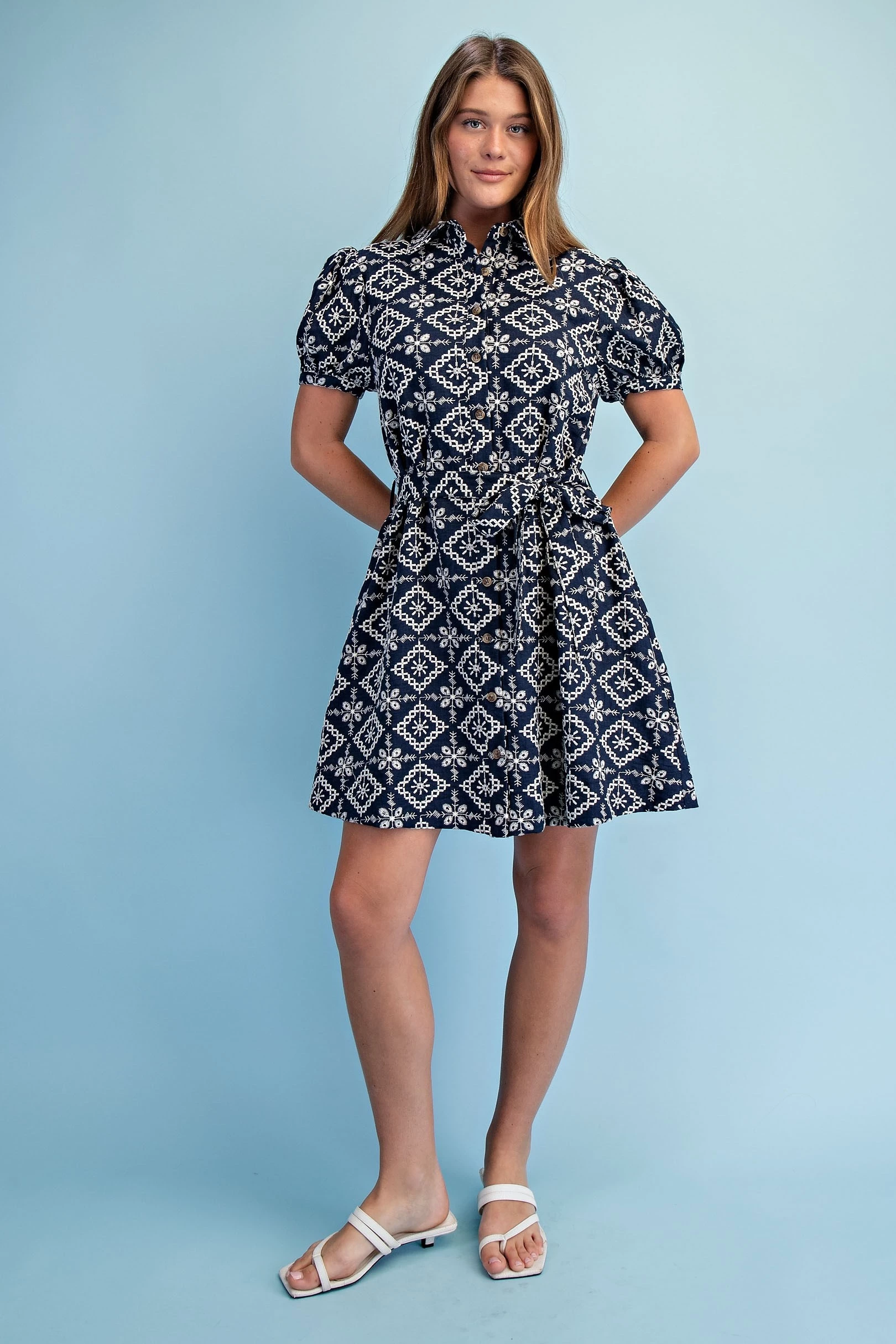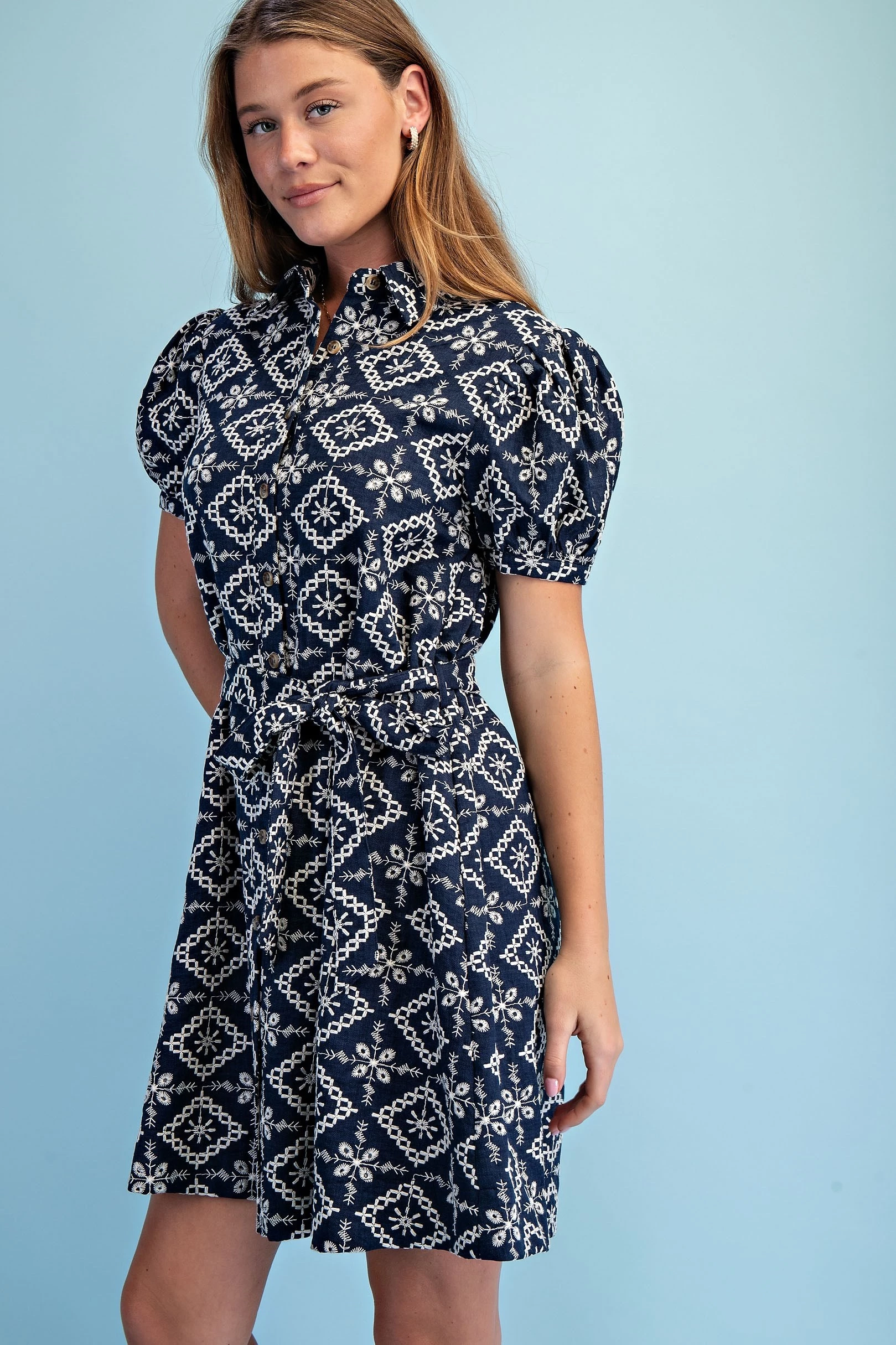 Textured Shirt Dress with Smocked Side Waist Details and Short Puff Sleeves