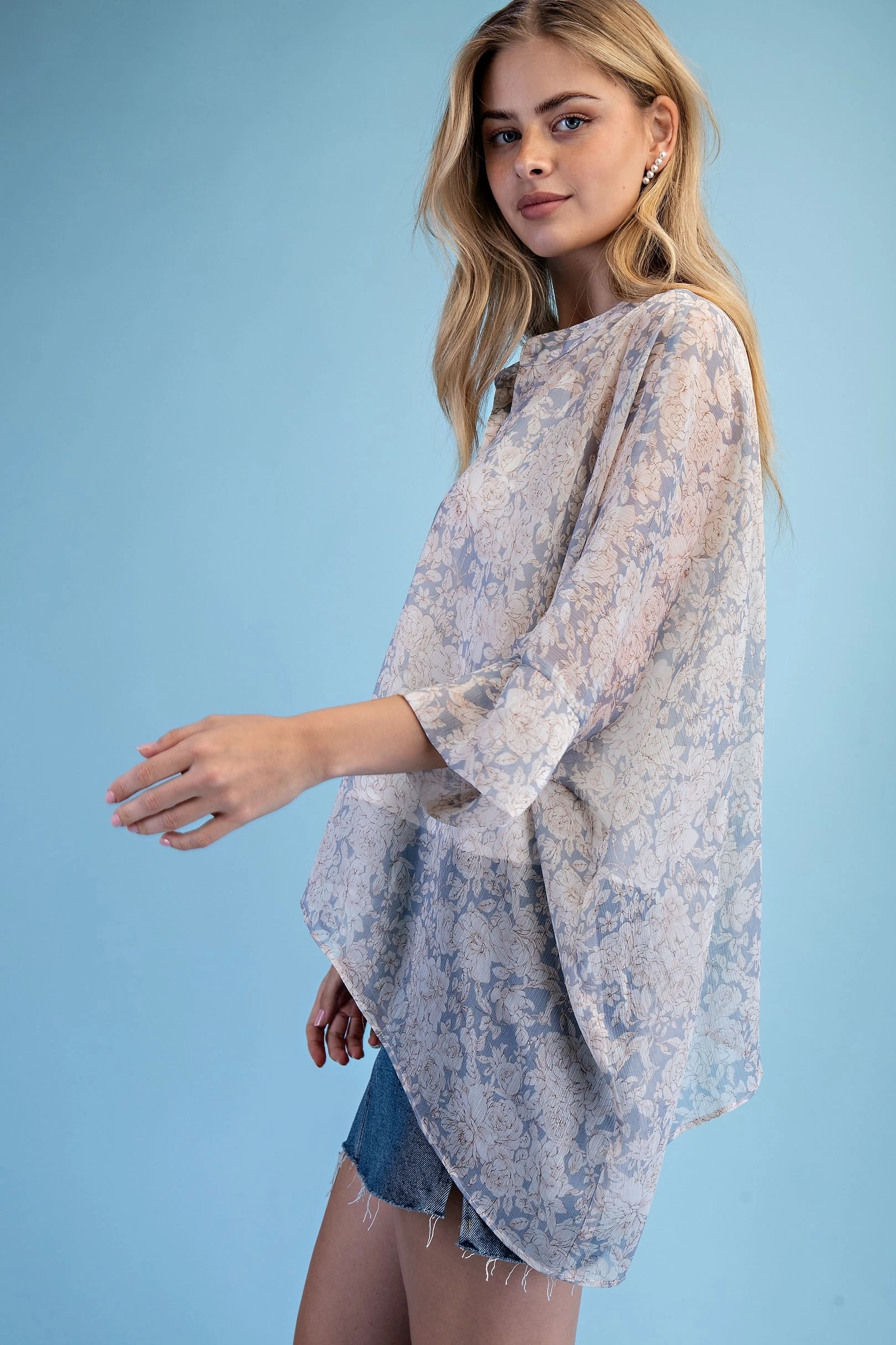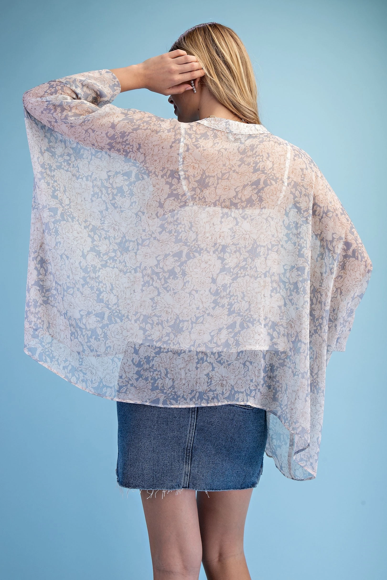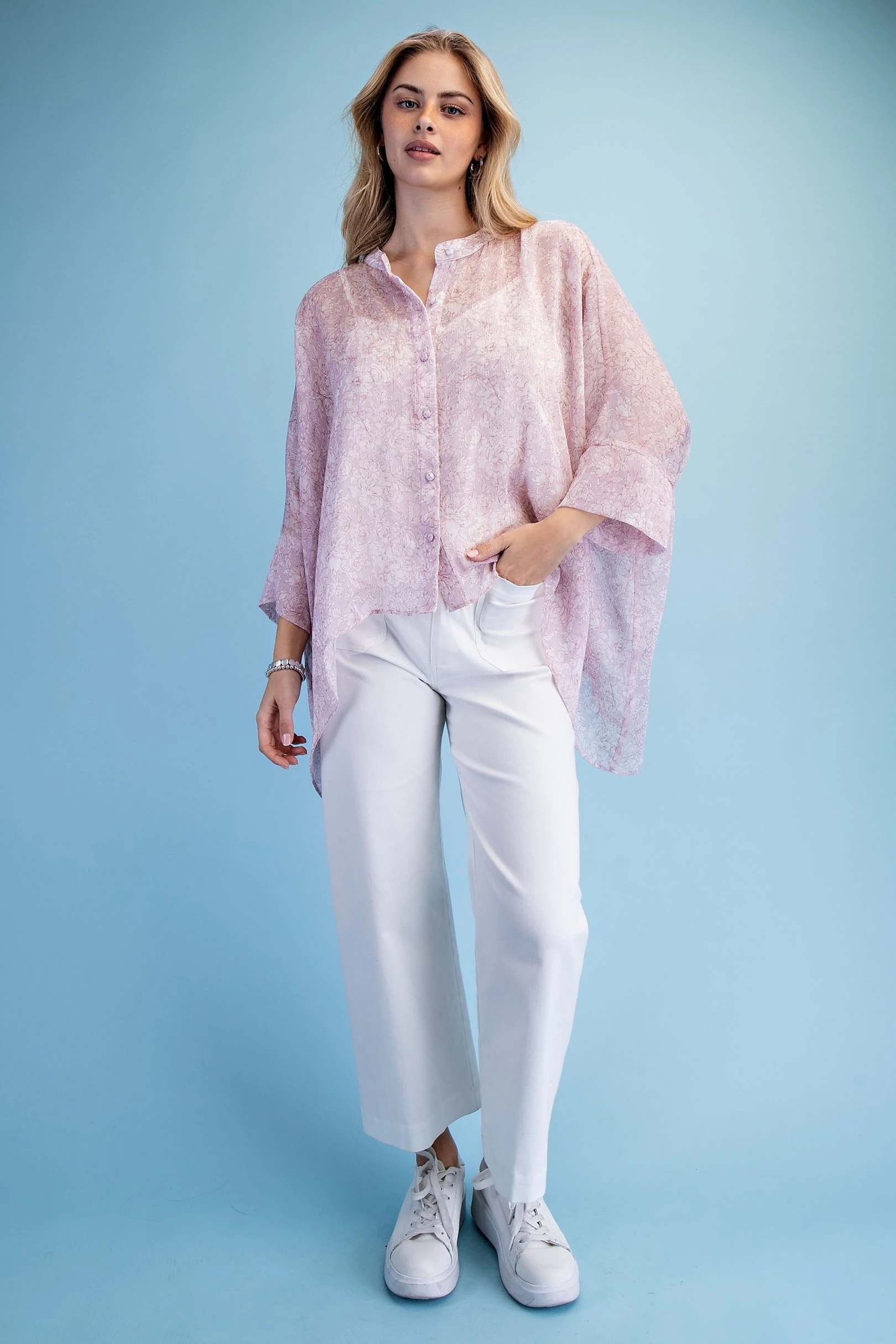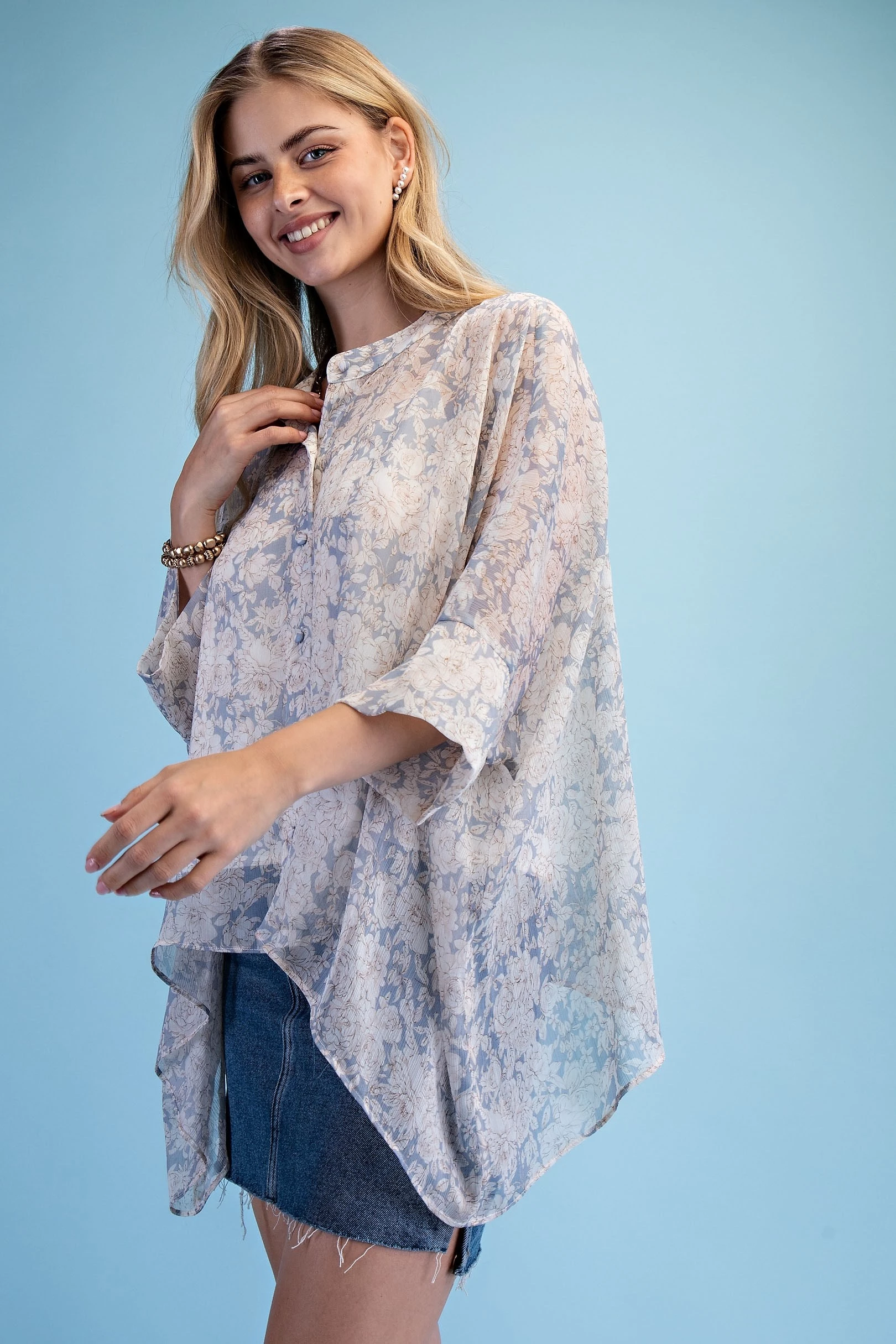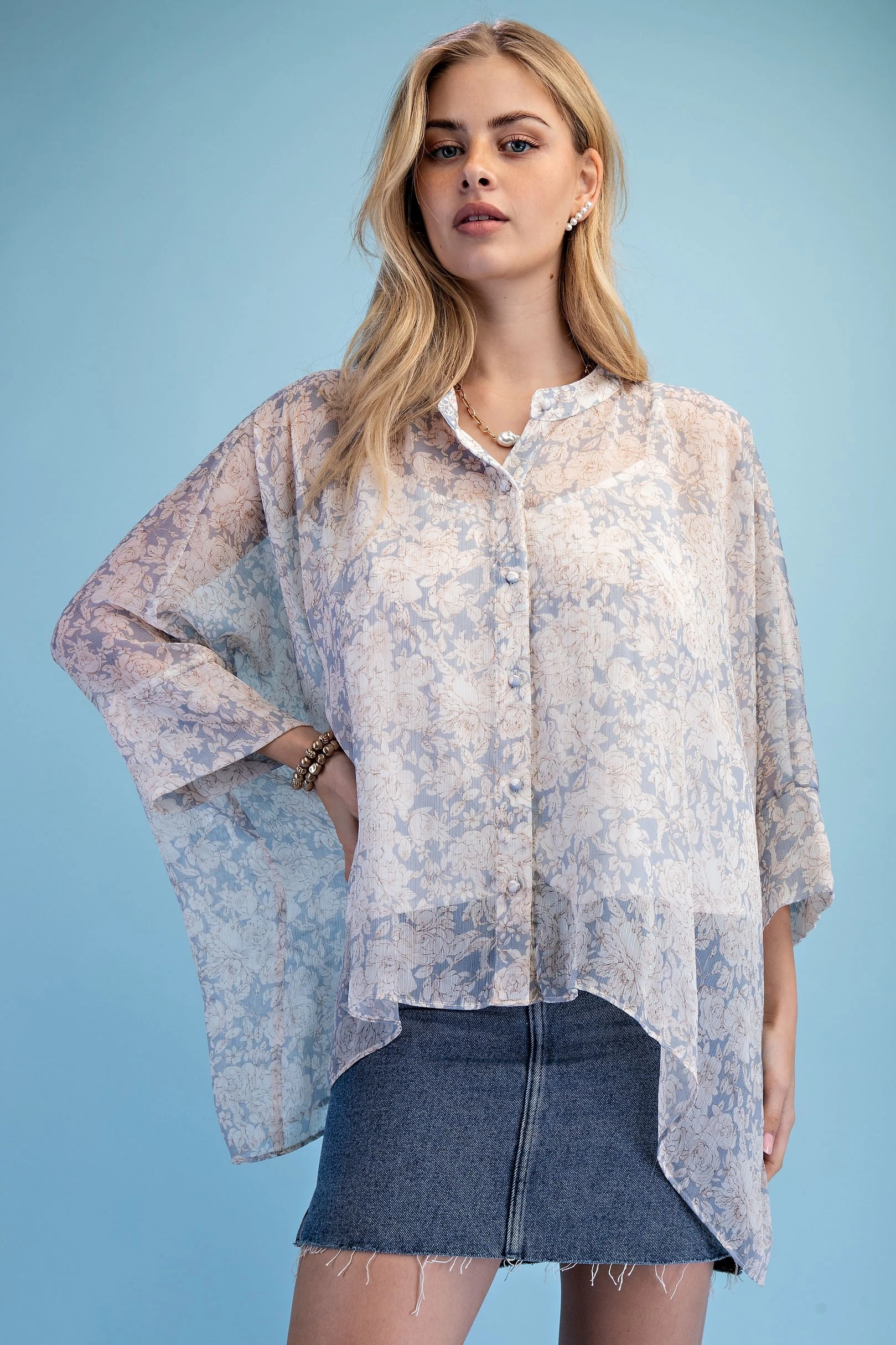 Rose Print Sheer Button Down Blouse with a Handkerchief Hem and a Camisole for Layering