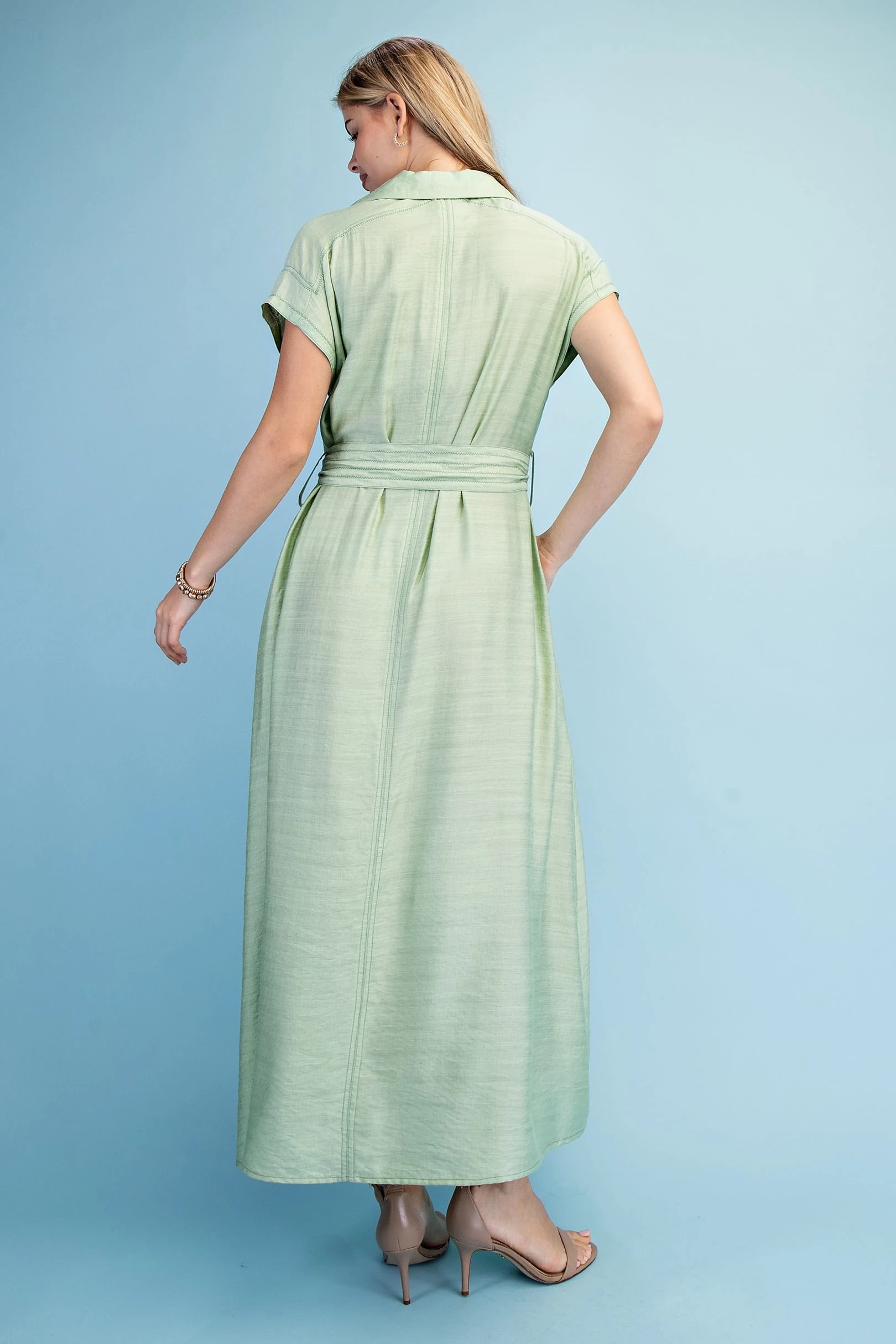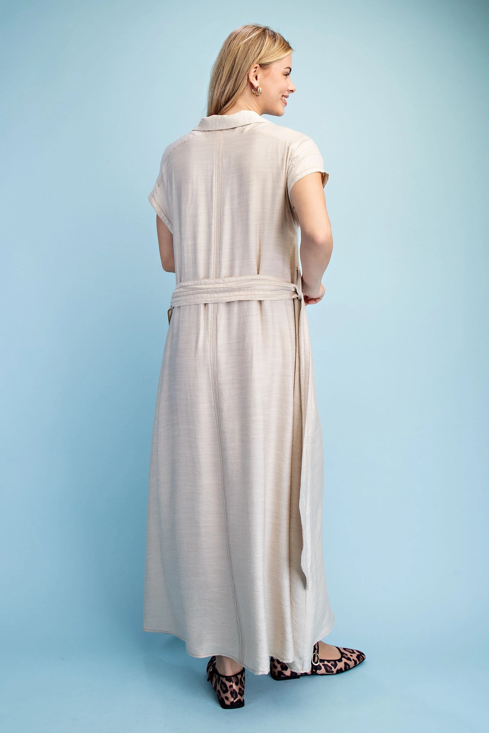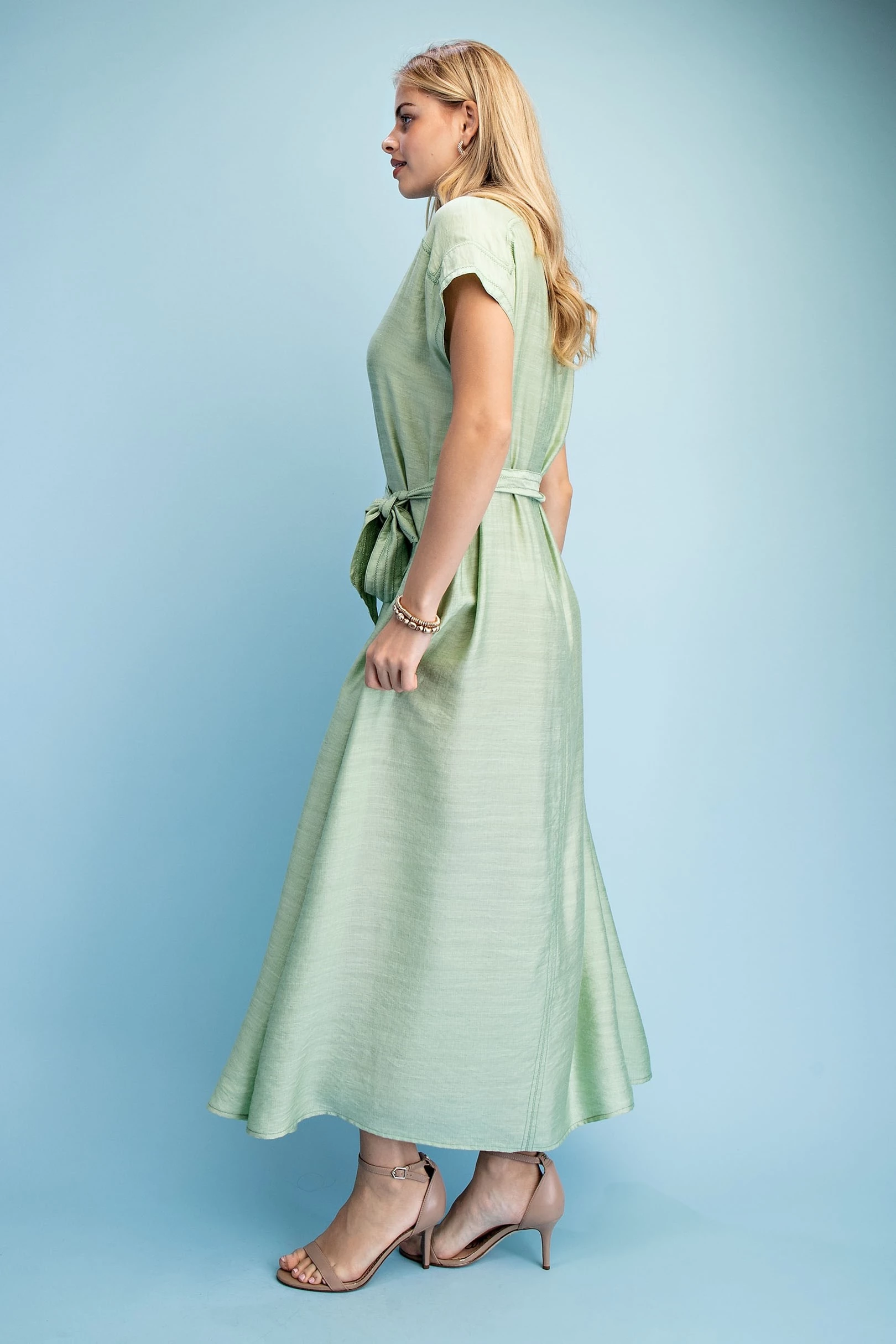 Floral Print V-Neck Midi Dress with Solid Binding Details and Adjustable Side Waist Ties. The Dress is Lined