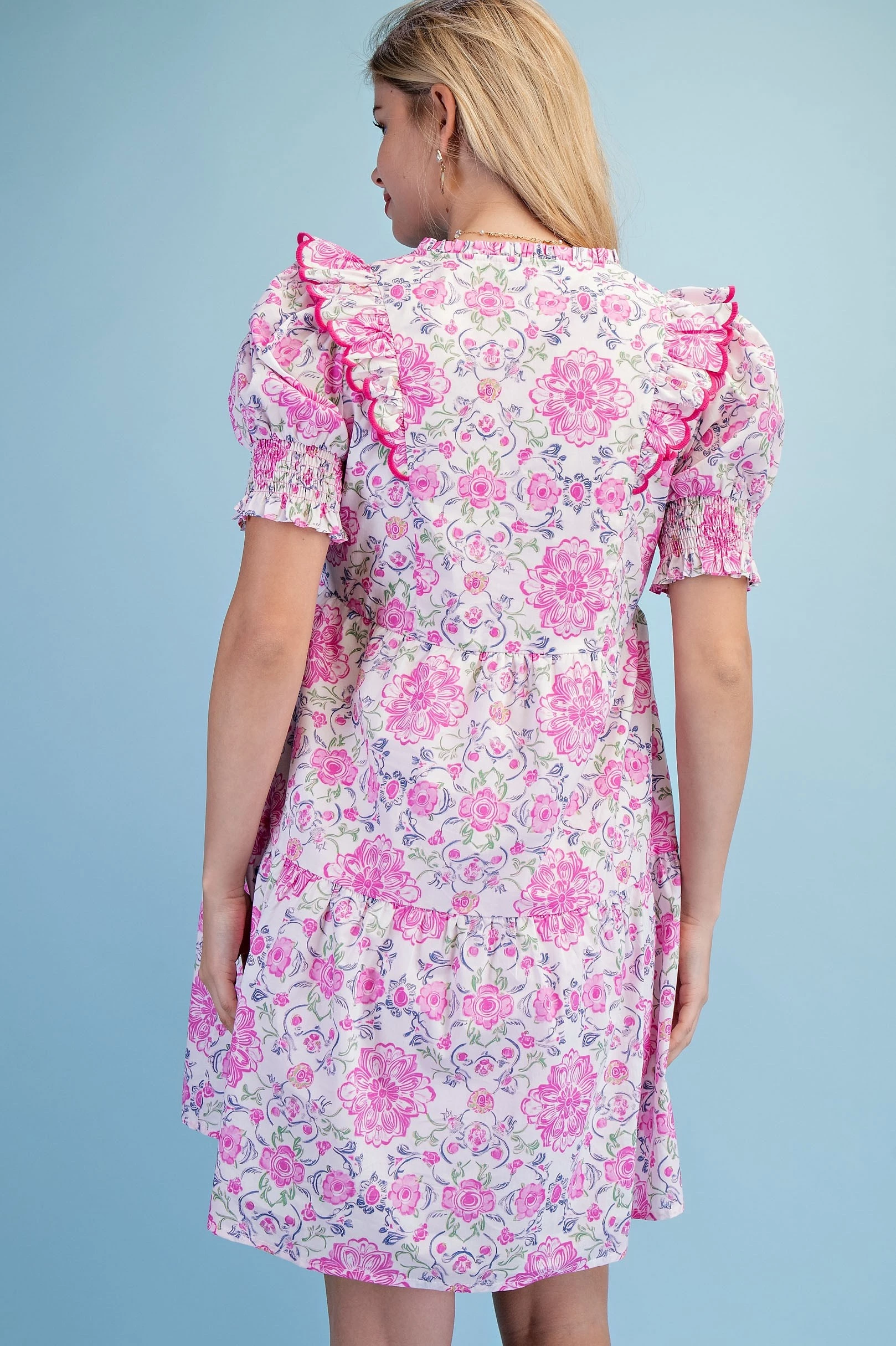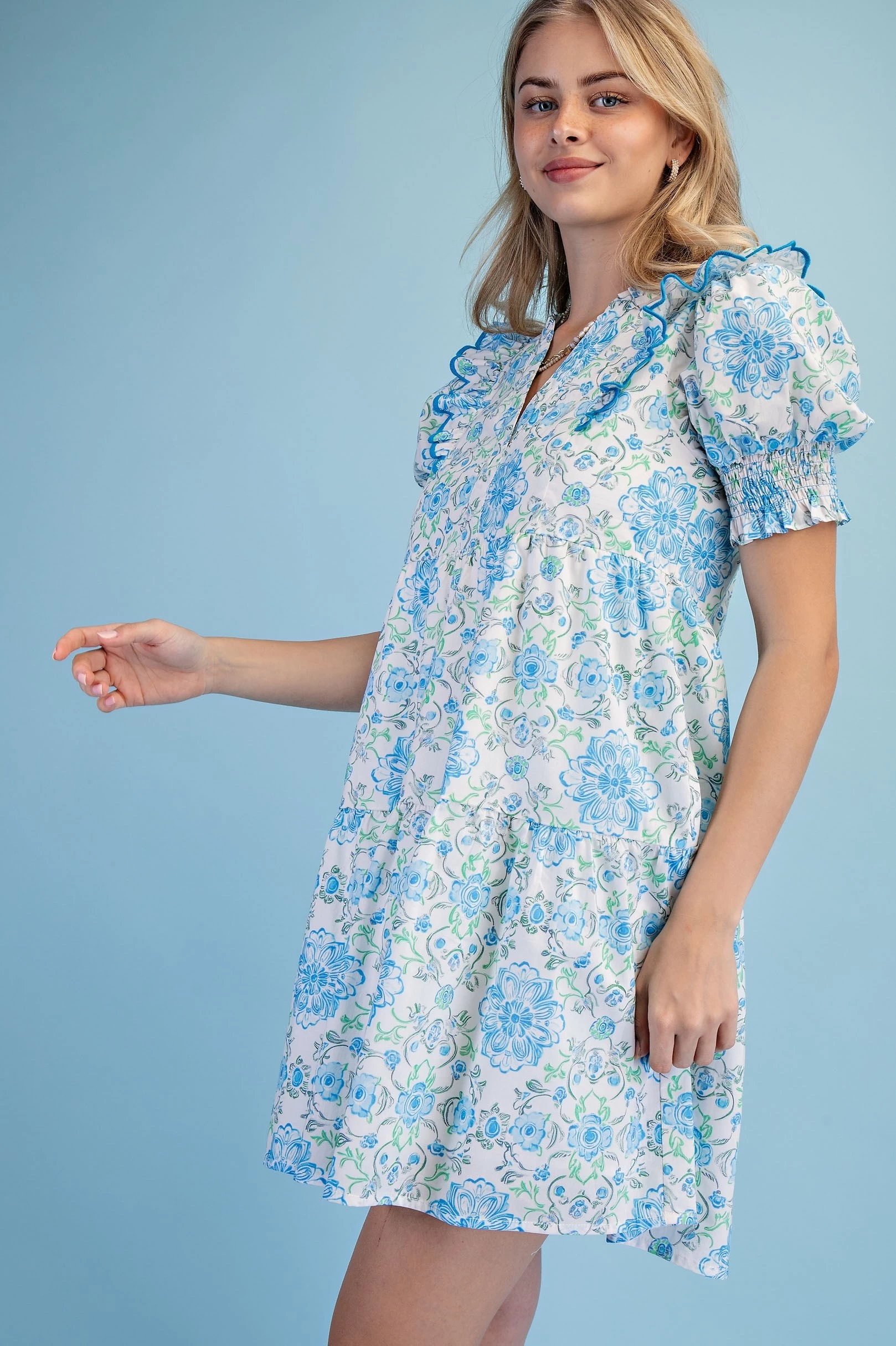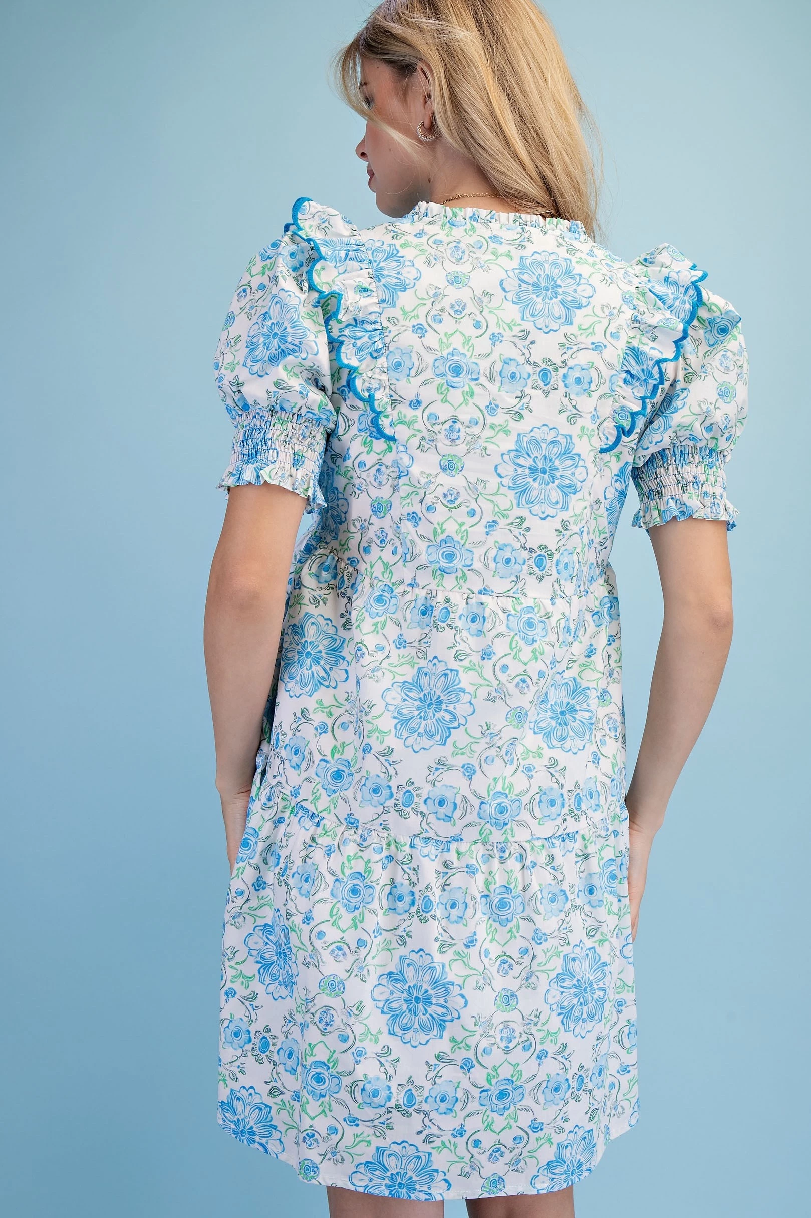 Printed Notch Neck Dress with Gathered Short Balloon Sleeves and Ric-Rac Trim Details.