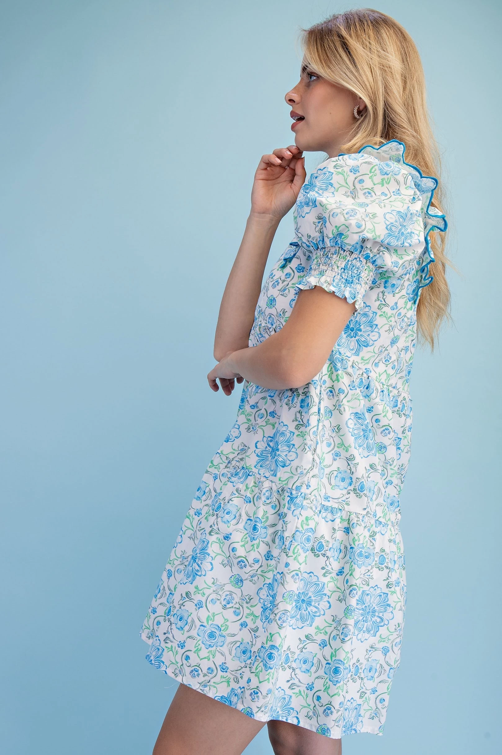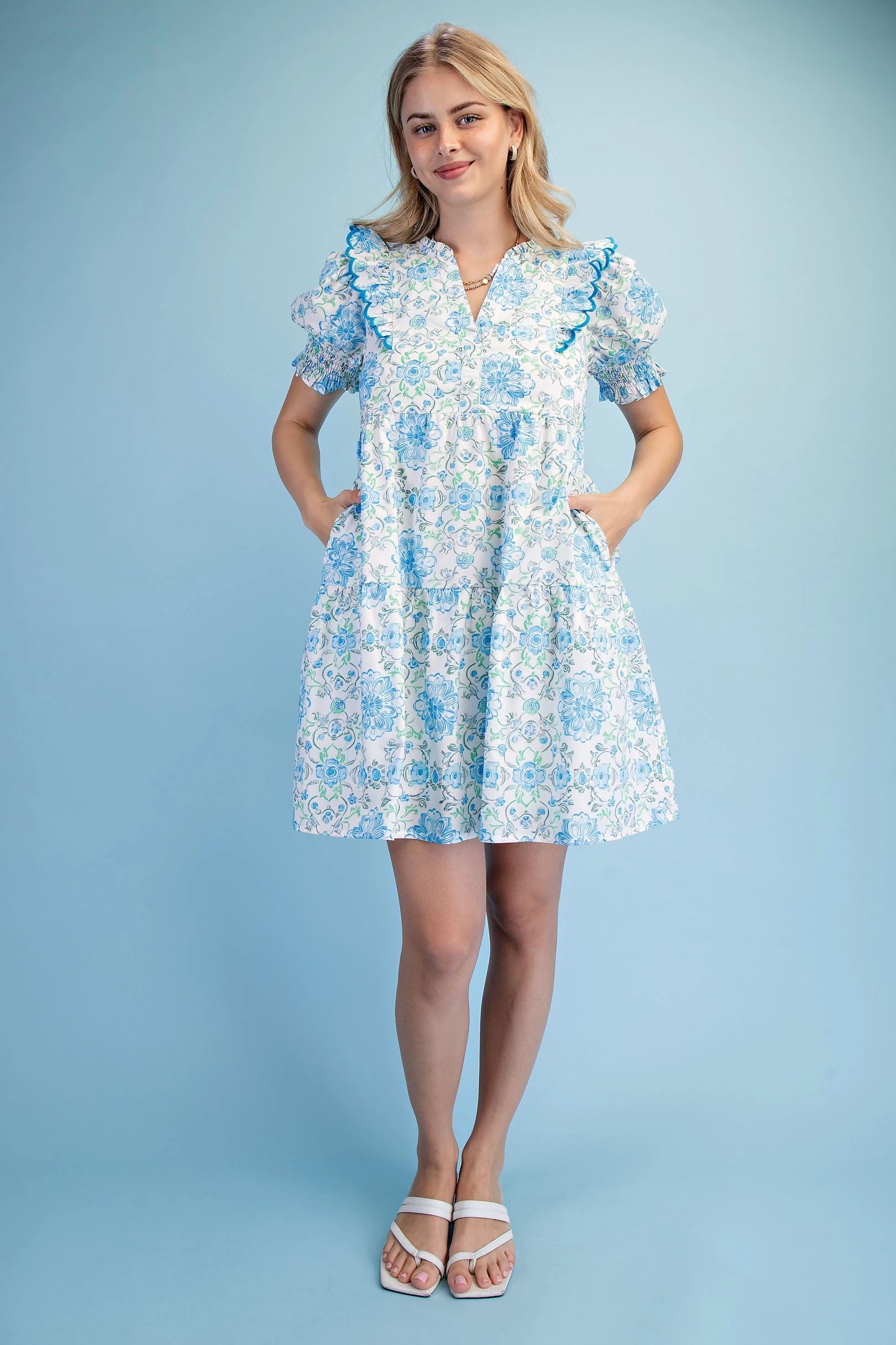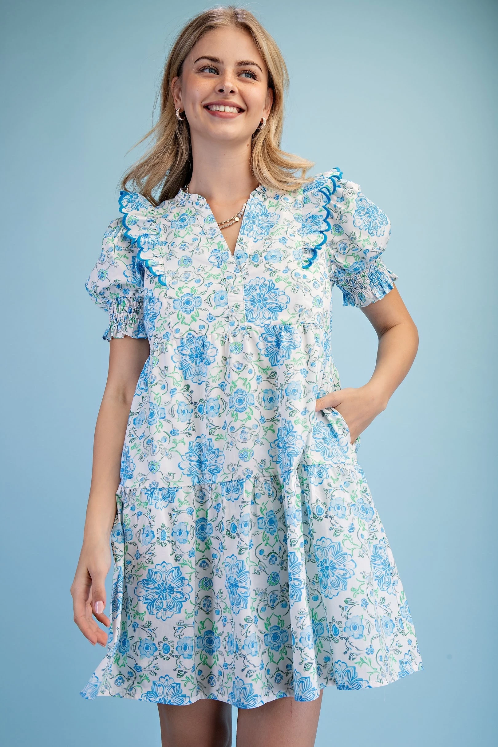 Printed Notch Neck Dress with Gathered Short Balloon Sleeves and Ric-Rac Trim Details.