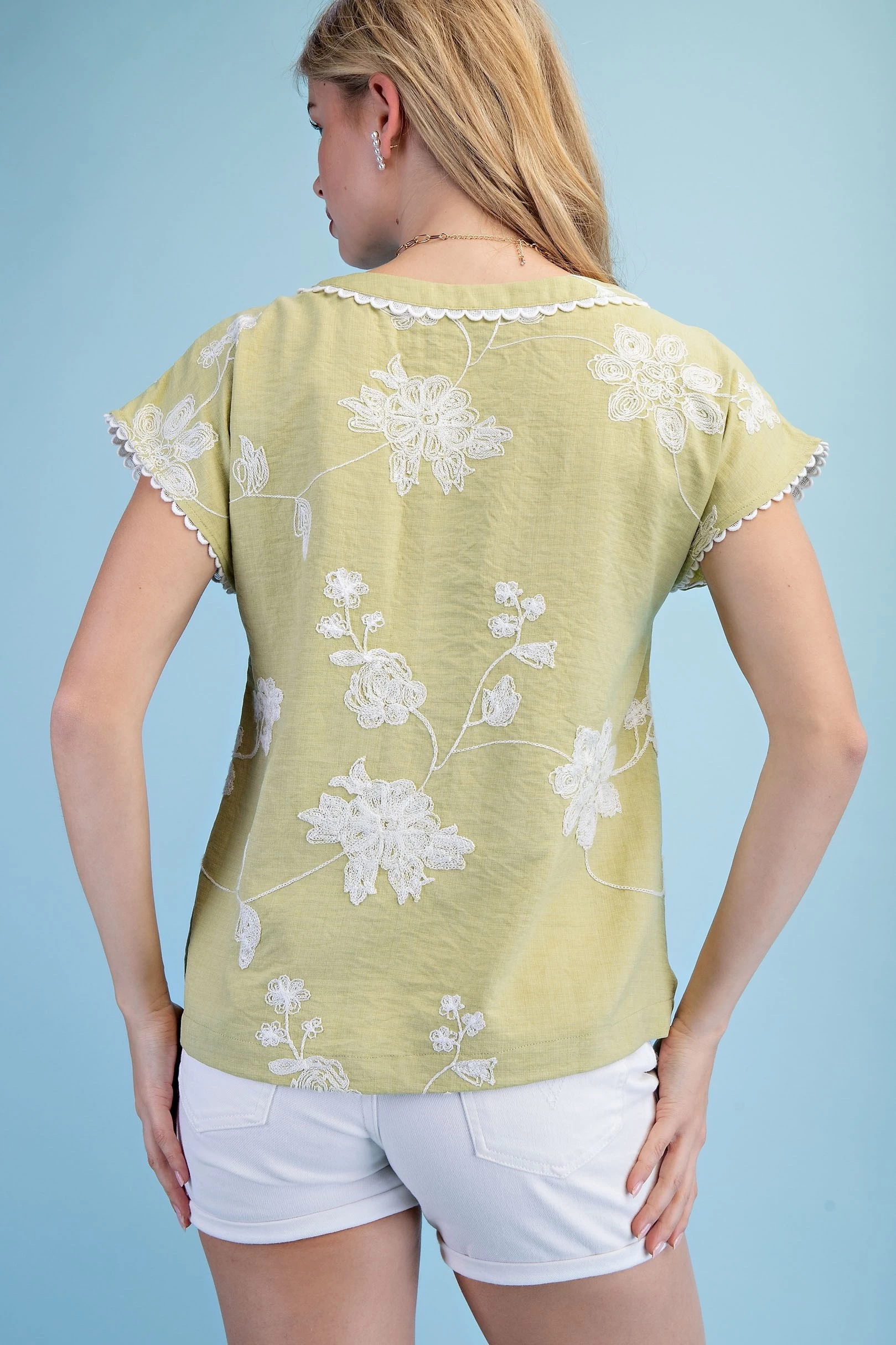 Floral 3D Appliqué and Embroidered V-Neck Top with a Covered Button Placket and Elastic Banded Sleeves