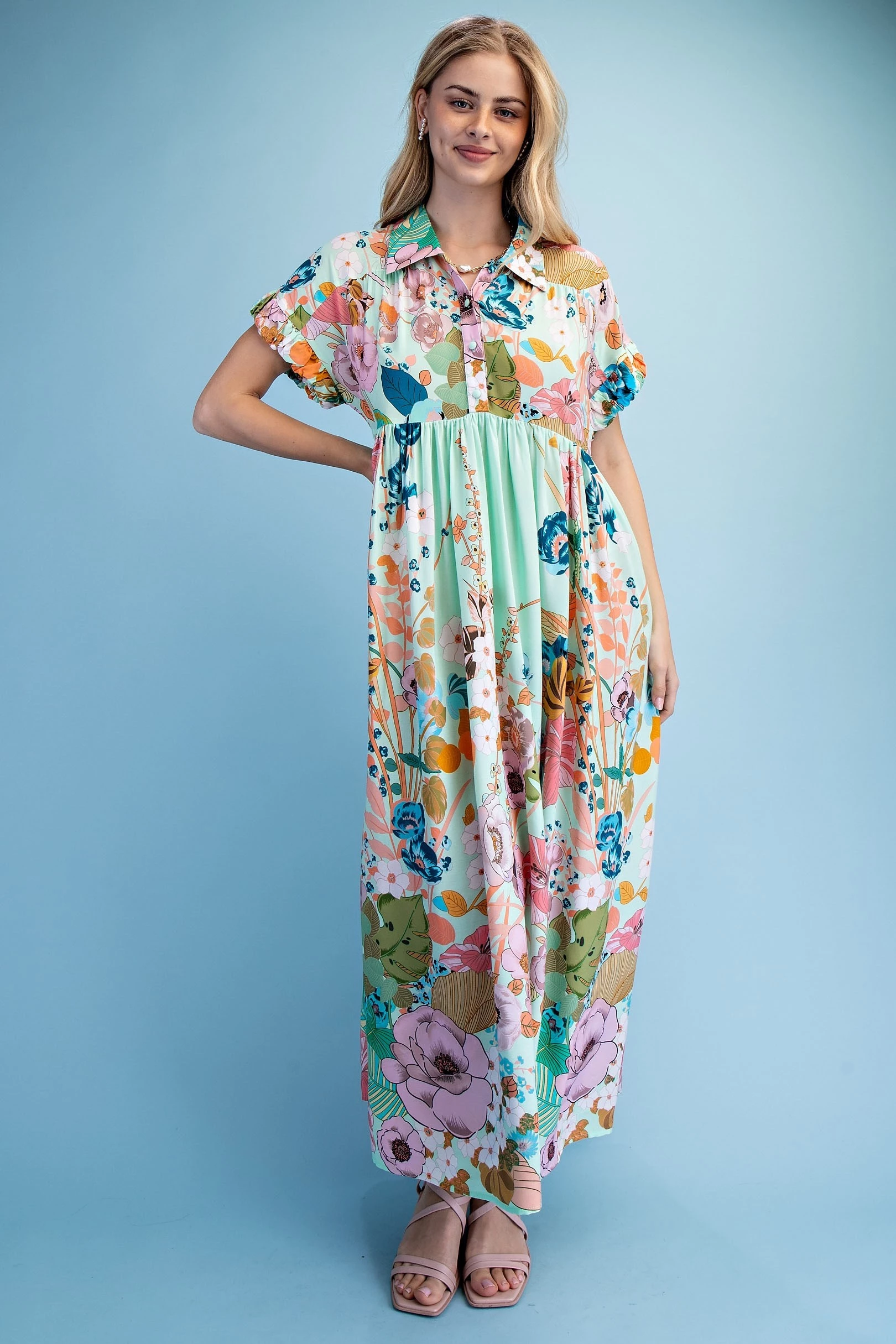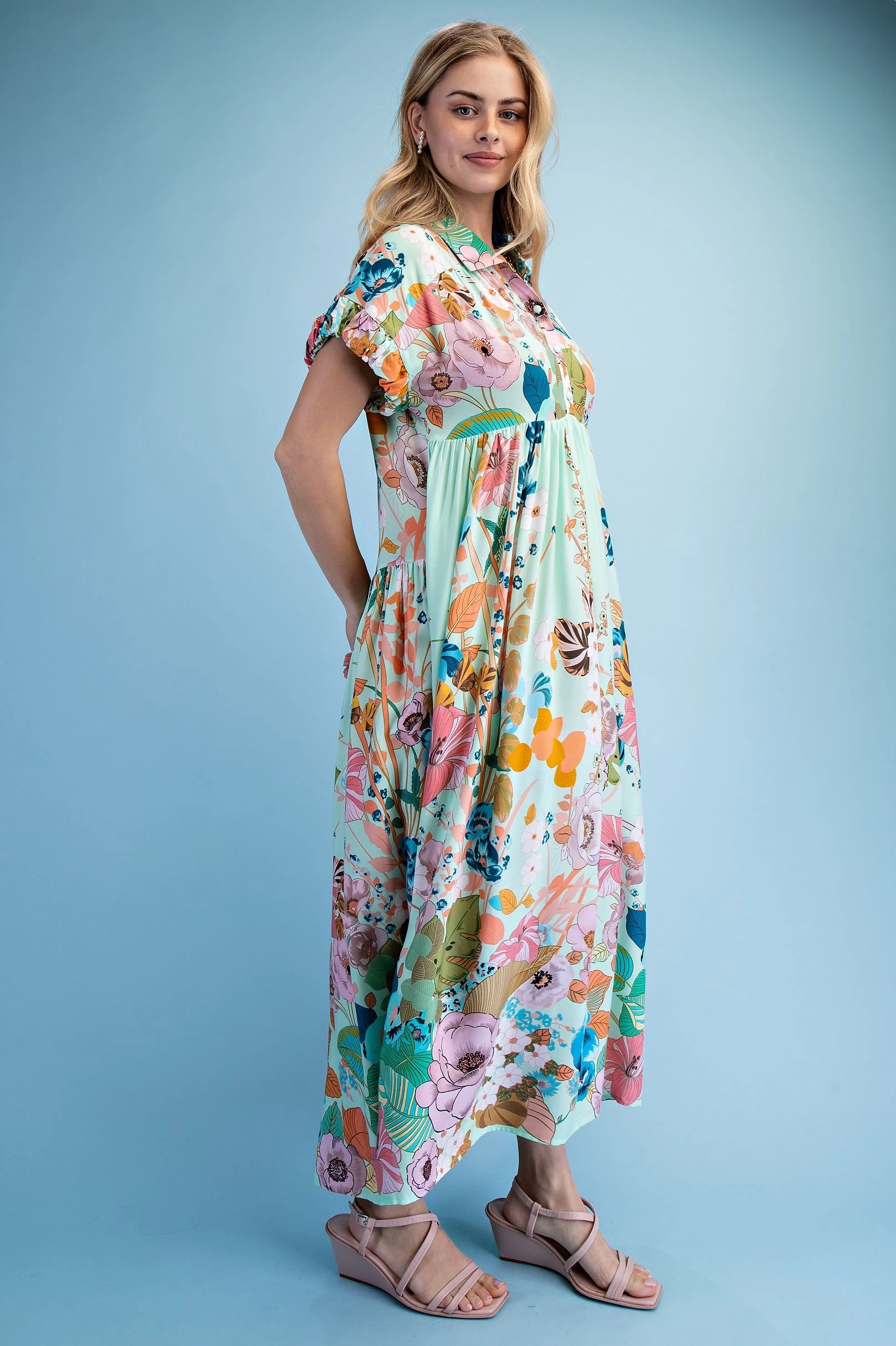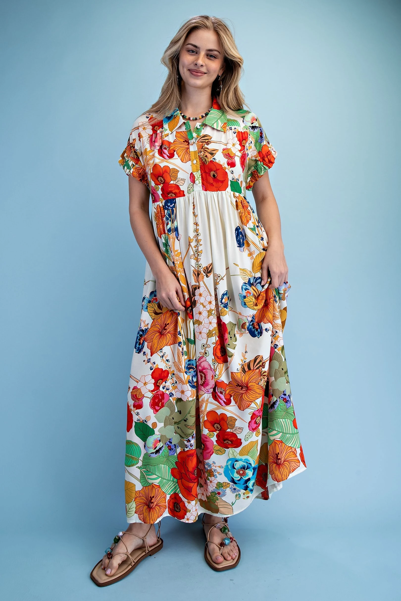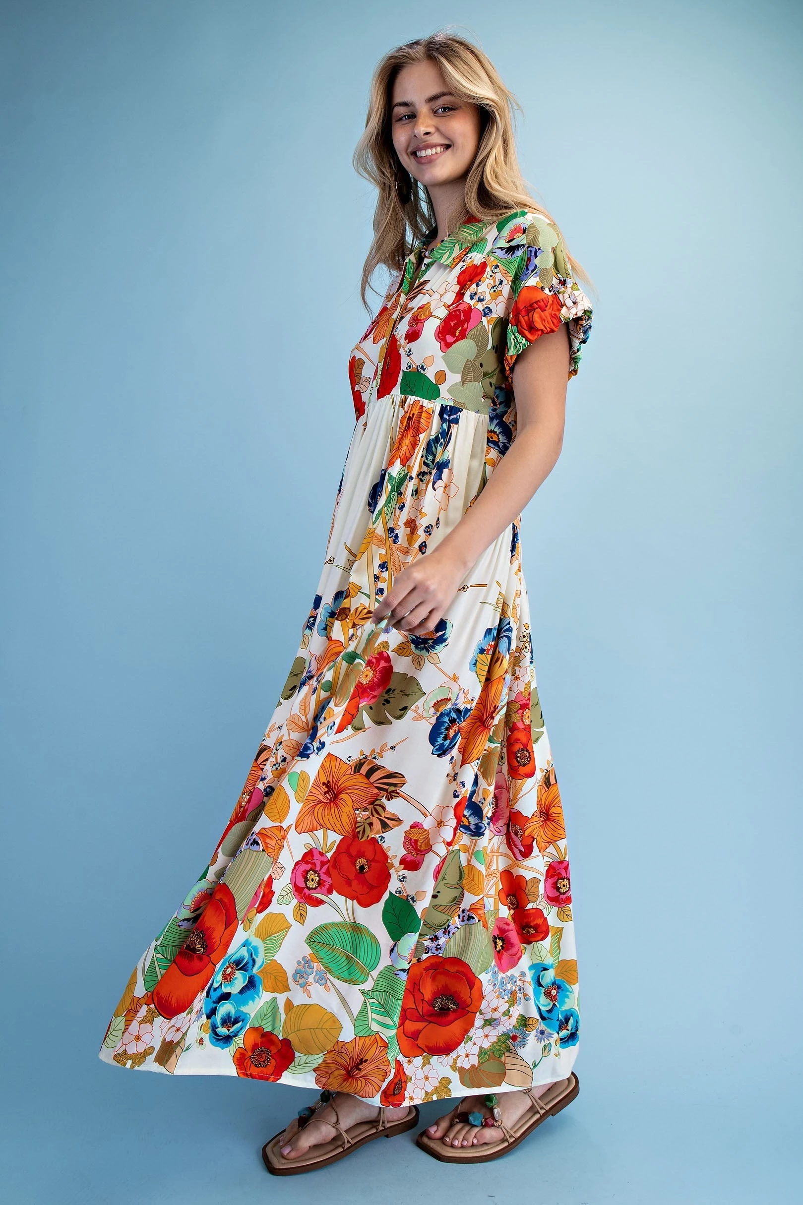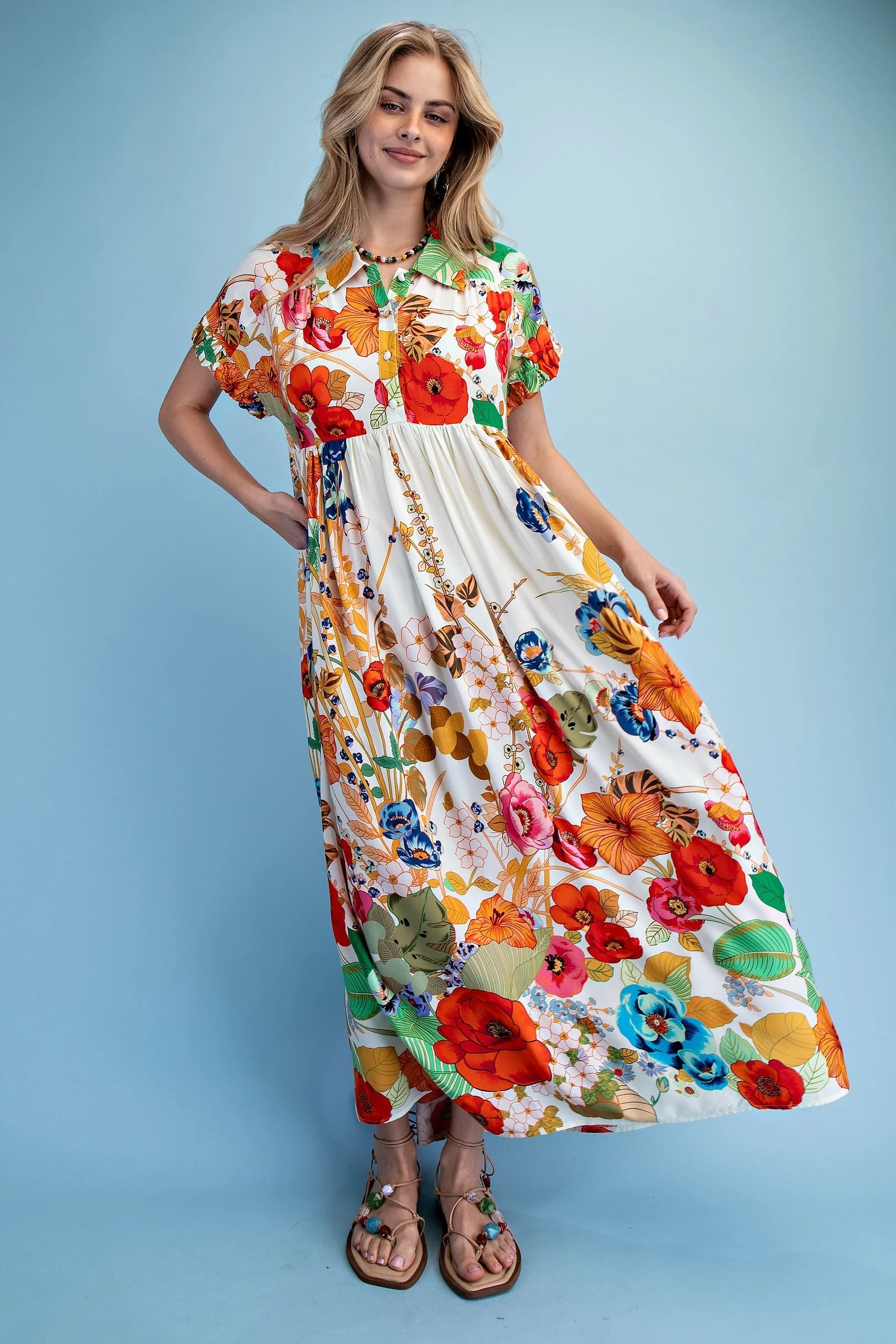 Floral Embroidered Gingham Print Button Down Midi Dress with a Ruffled Collar and Ruffle Sleeves. The Dress is Lined