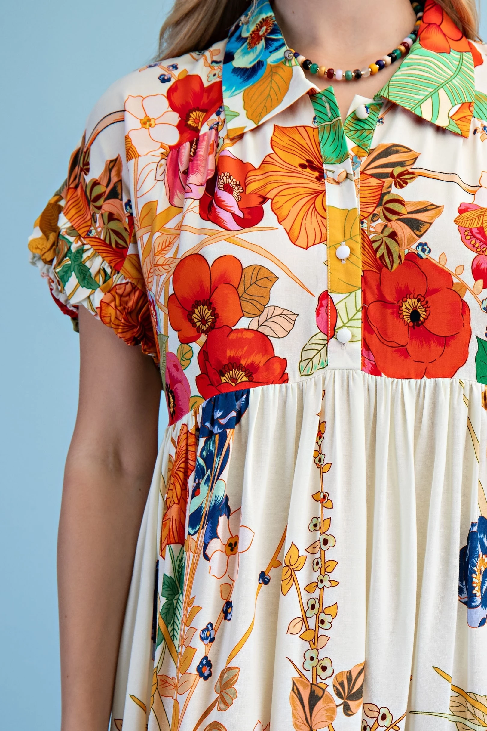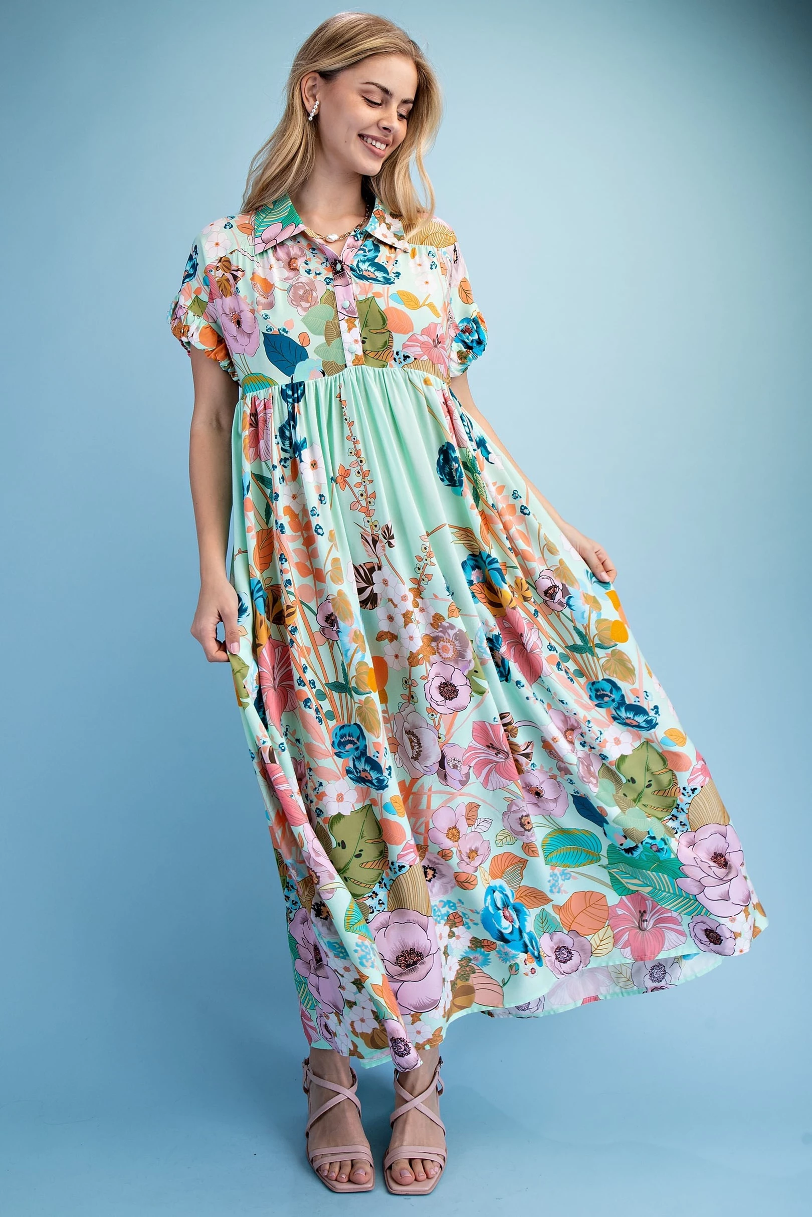 Peter Pan Collar Button Down Mini Dress with Short Puff Sleeves