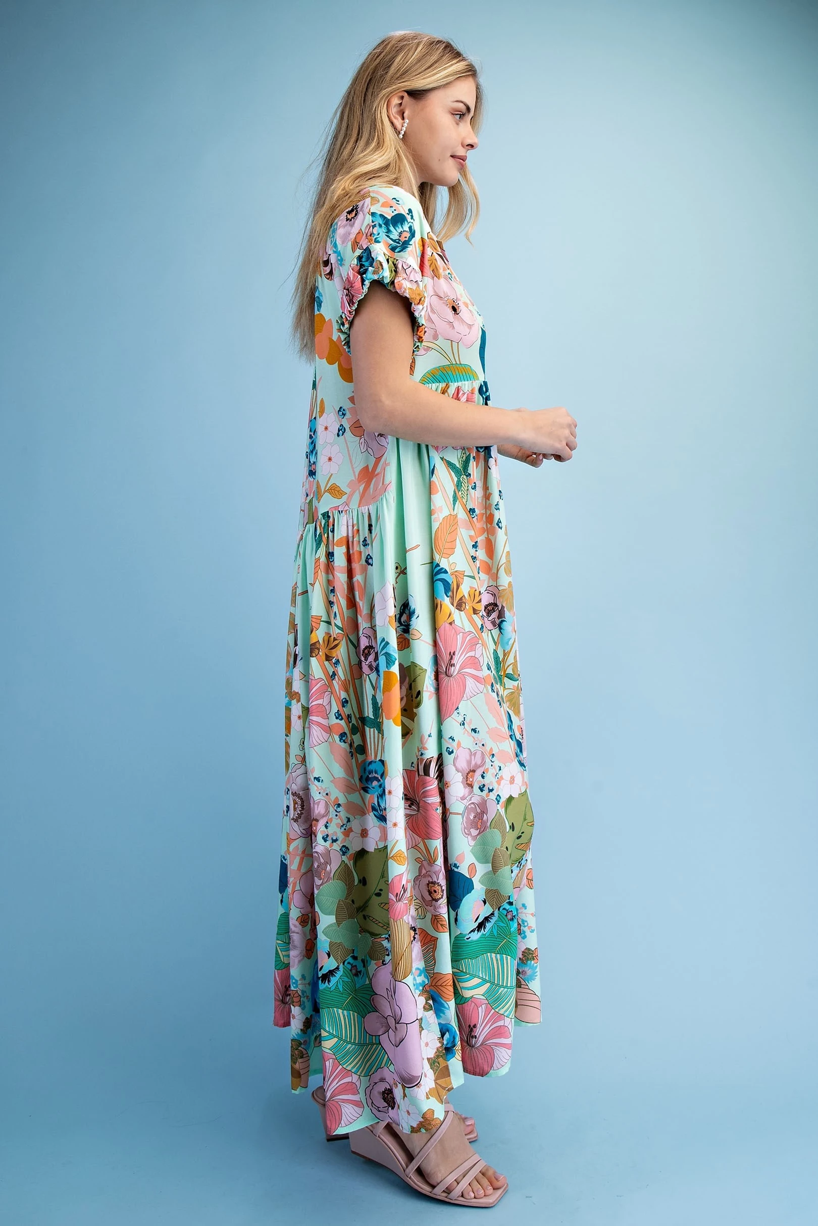 Floral Print Ruffled Neck Mini Dress with Contrasting Stripe Accents and Layered Ruffle Sleeves. The Skirt is Lined