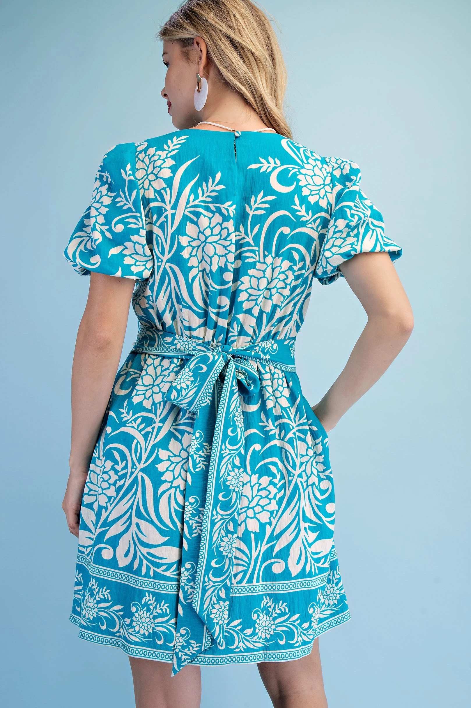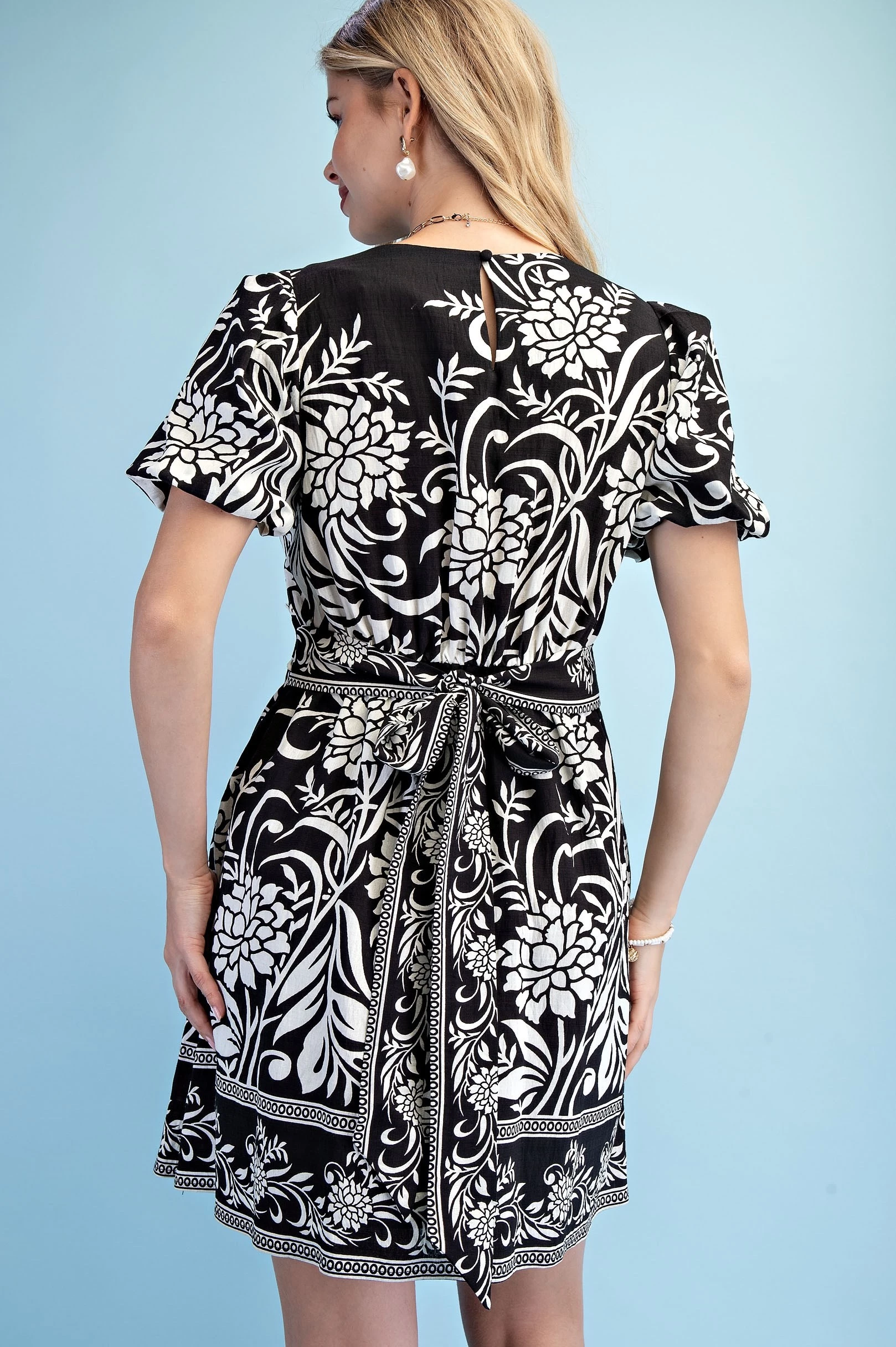 Printed Pleated Skirt Mini Dress with a Scalloped V-Neck and a Decorative Trim. The Dress is Lined