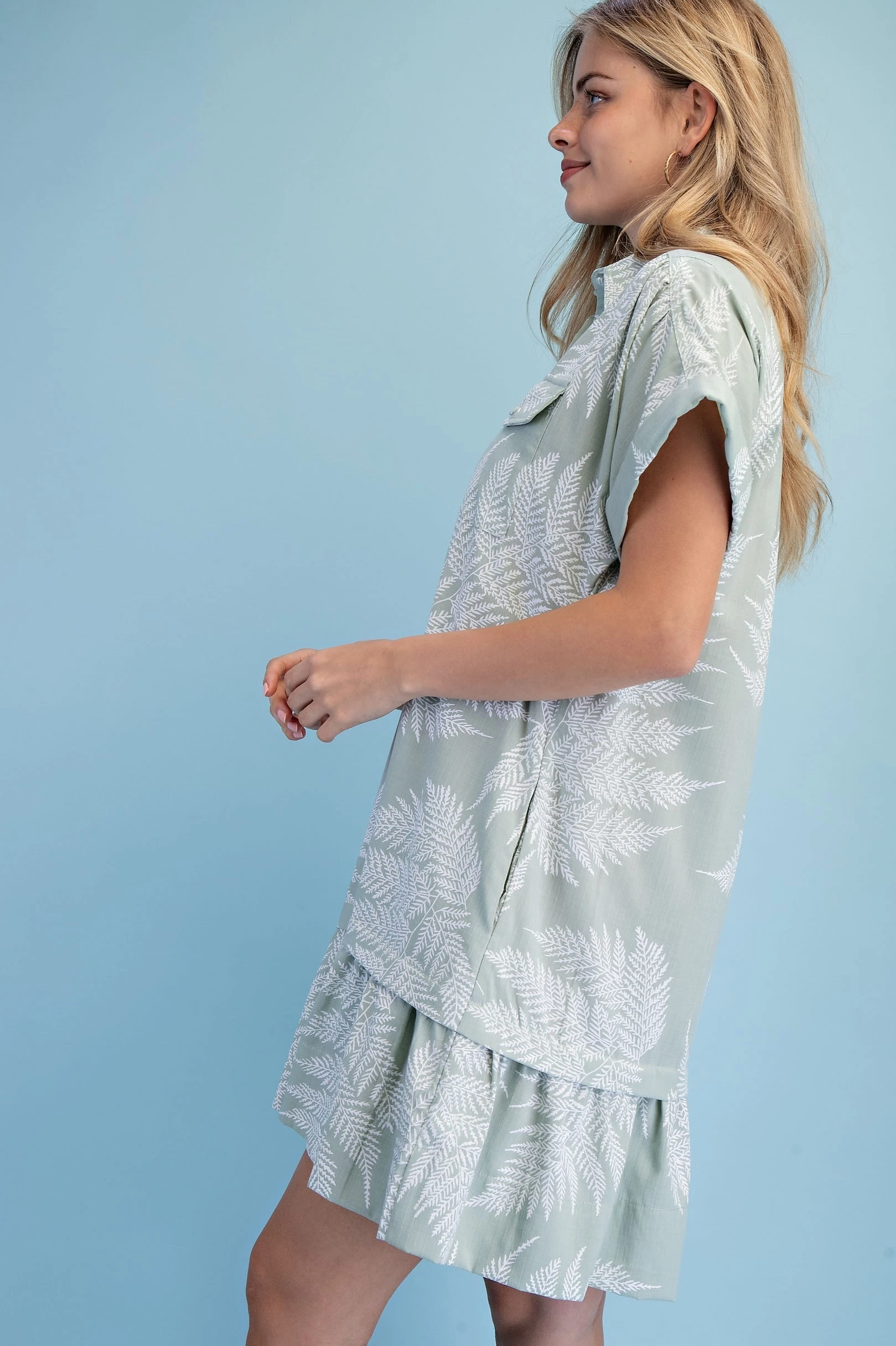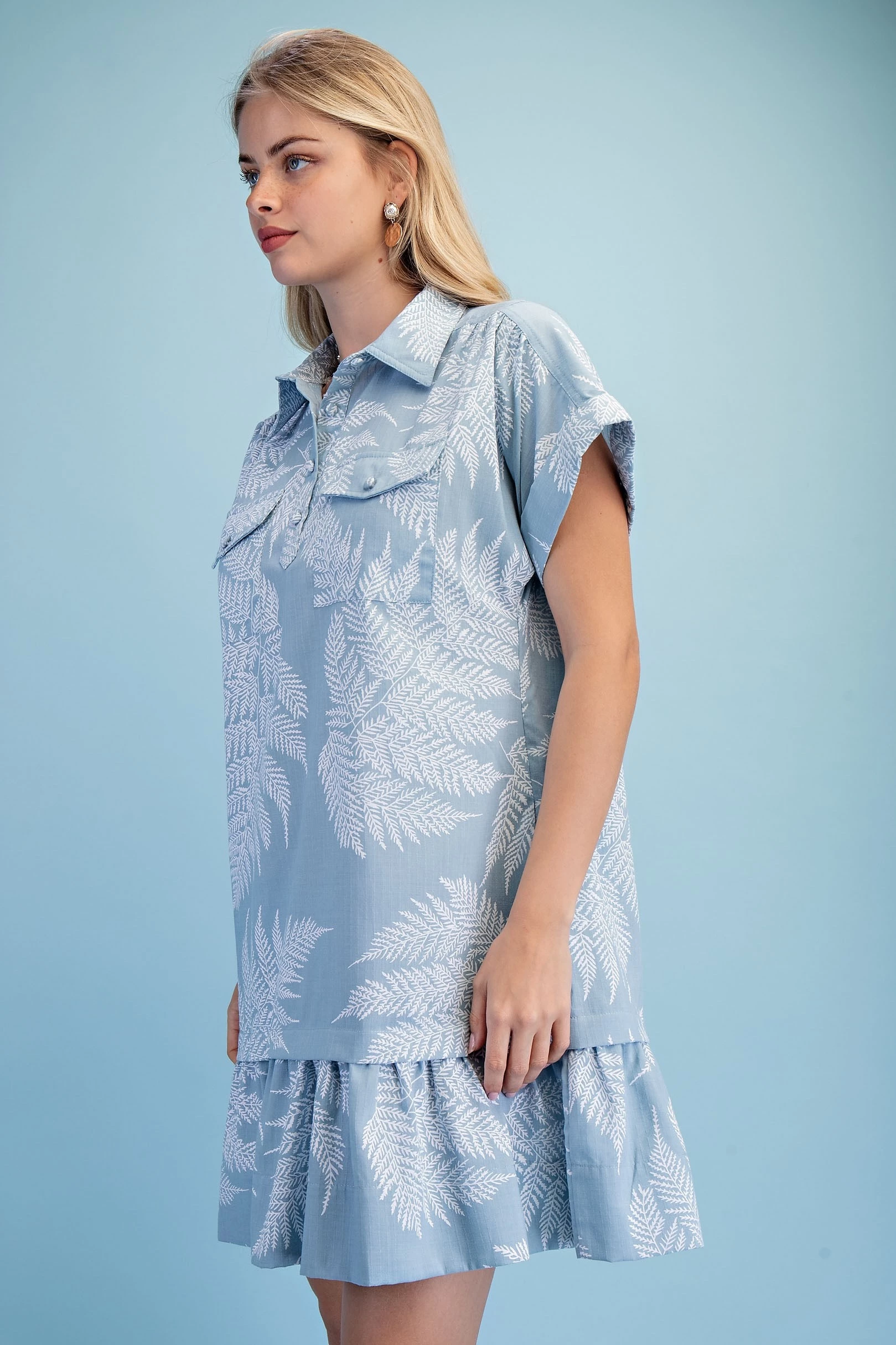 Fern Print Half Button Shirt Dress with a Layered Tier Details and Two Front Pockets