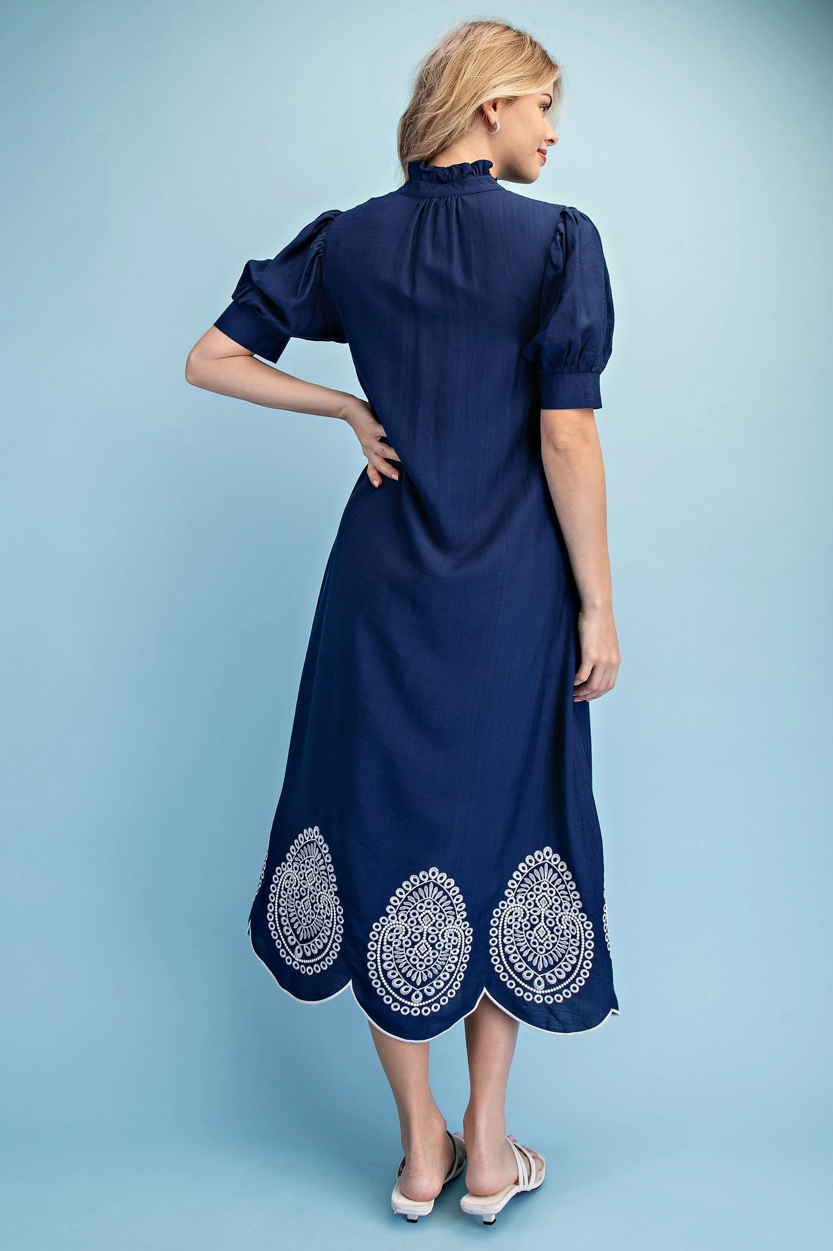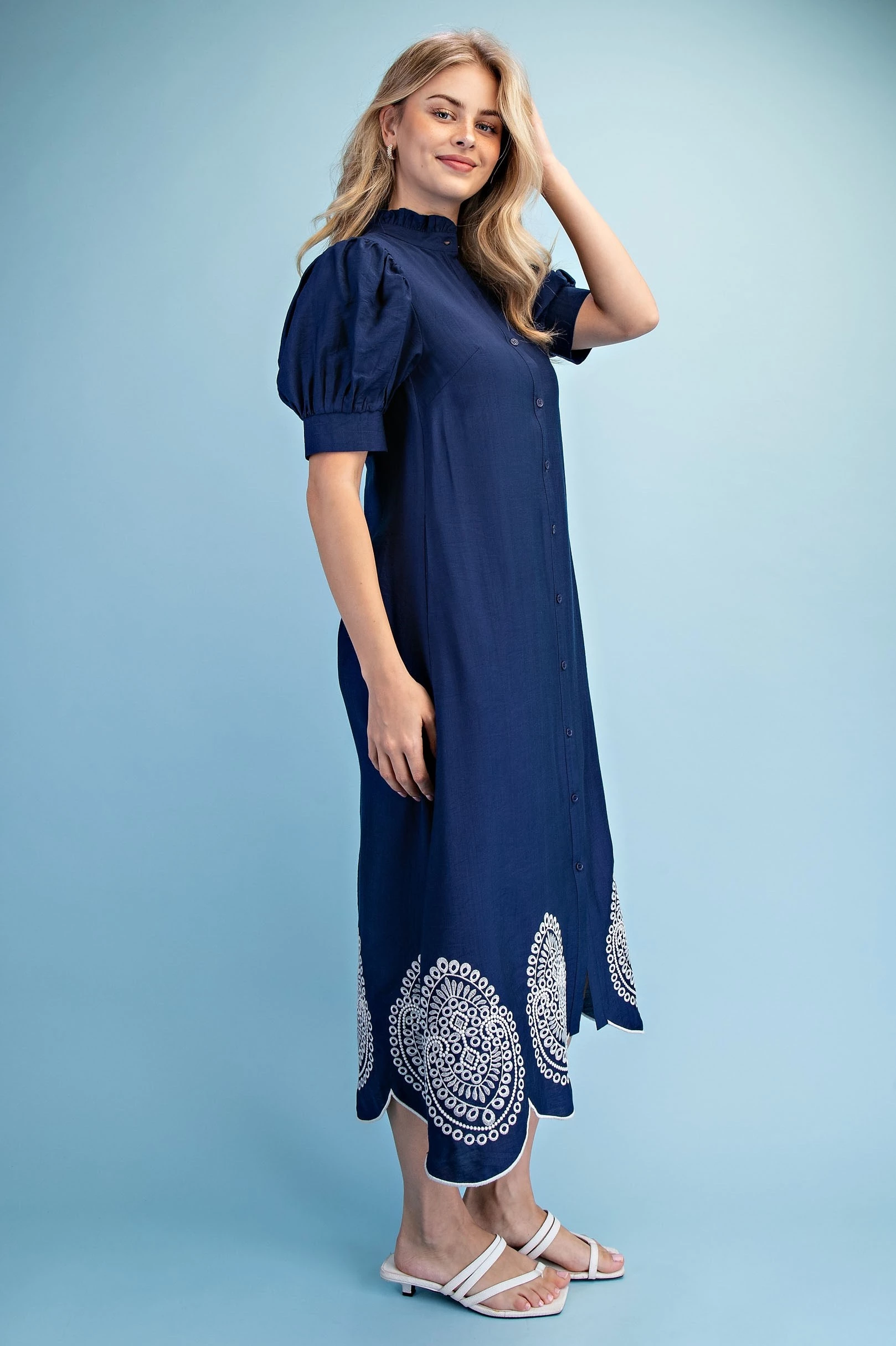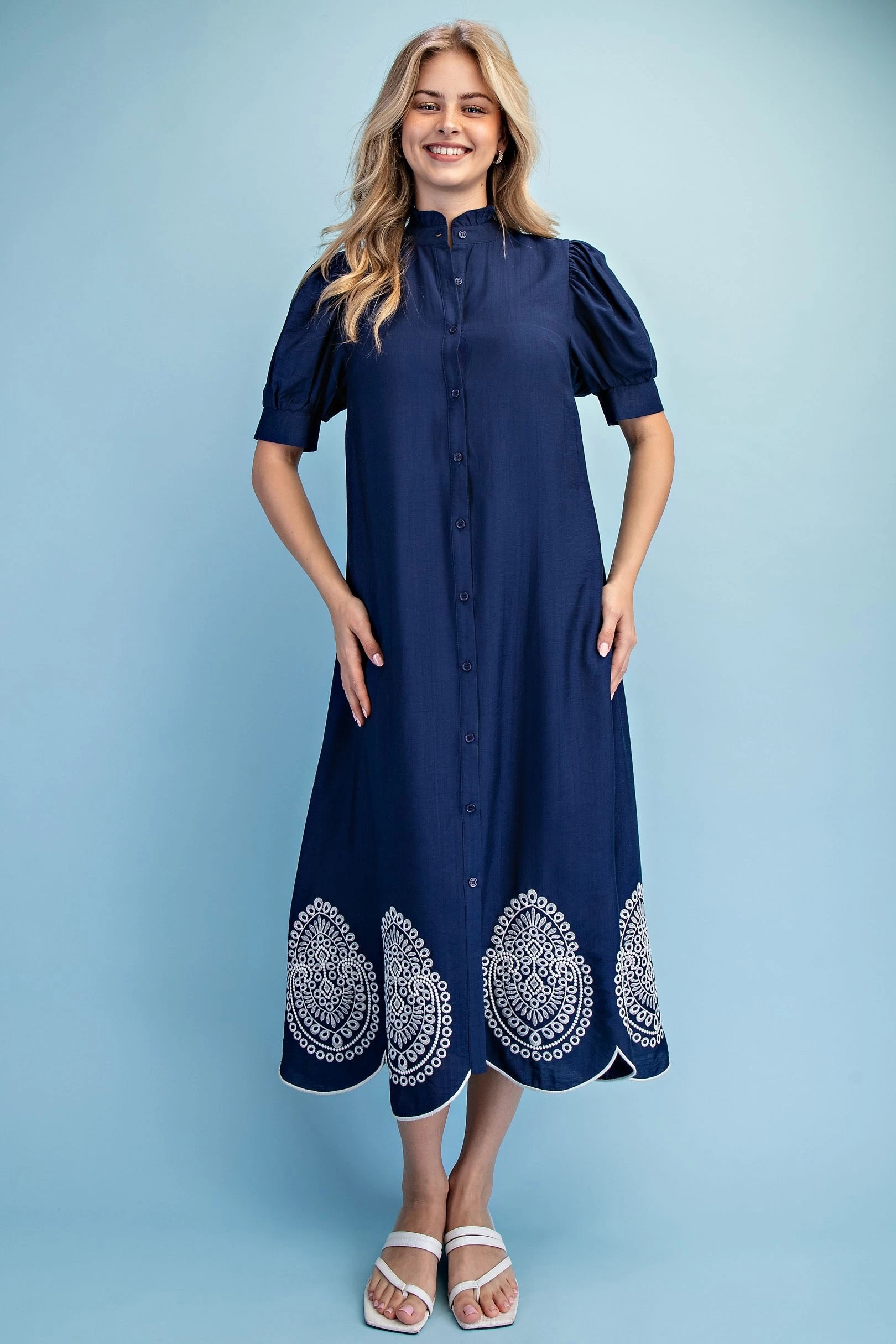 Button Down Midi Dress with a Ruffled Collar and Metallic Embroidery