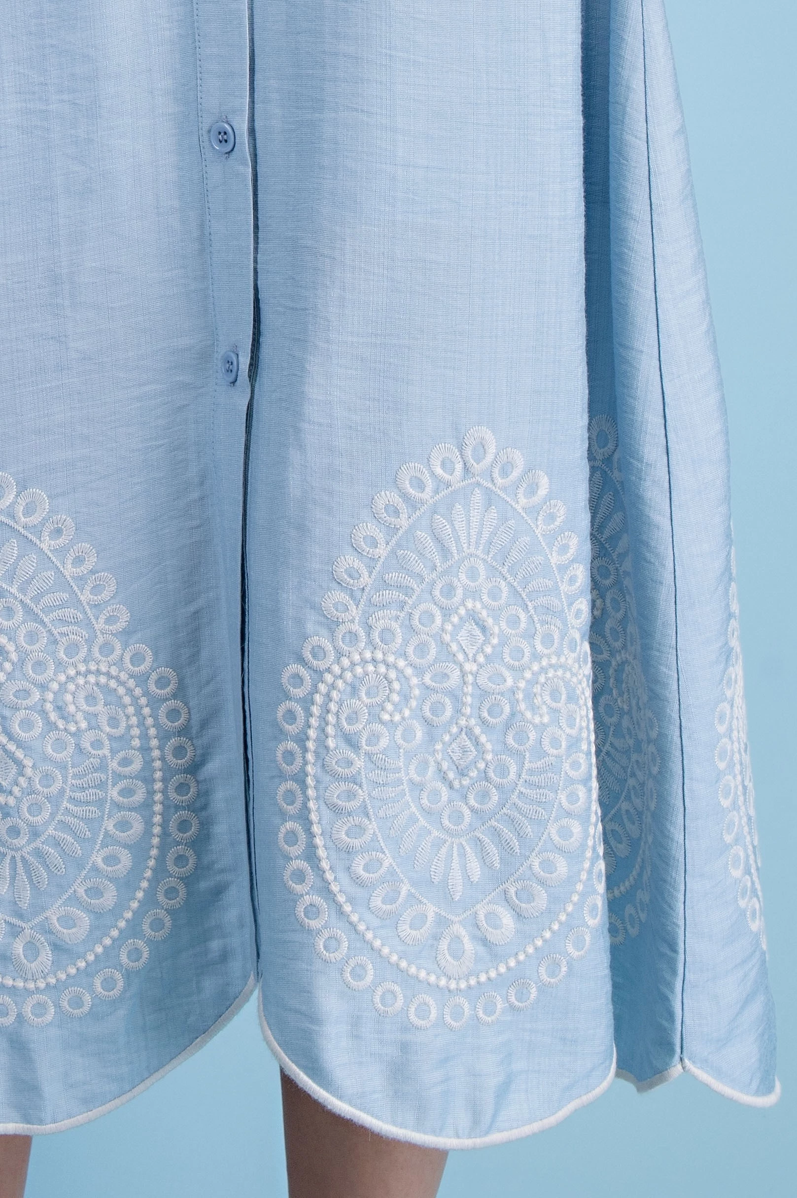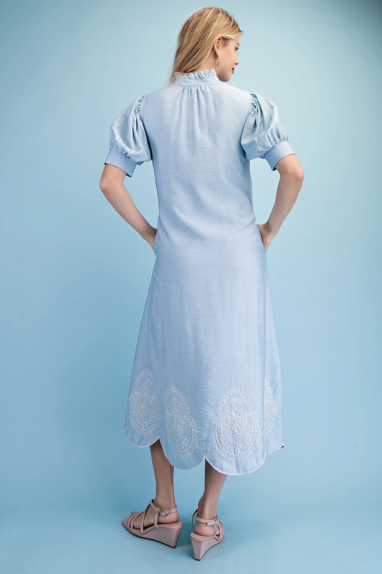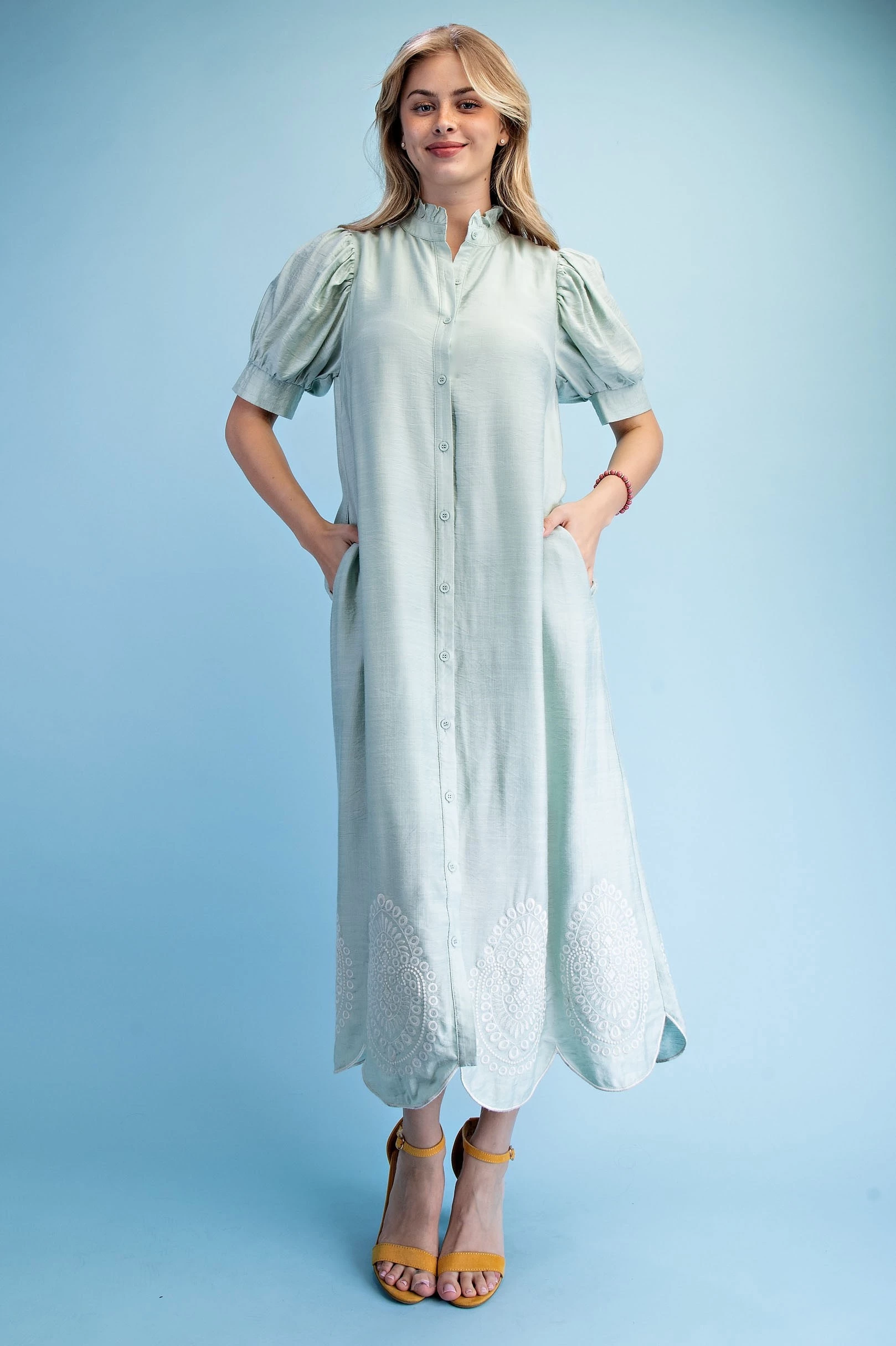 Button Down Midi Dress with a Ruffled Collar and Metallic Embroidery