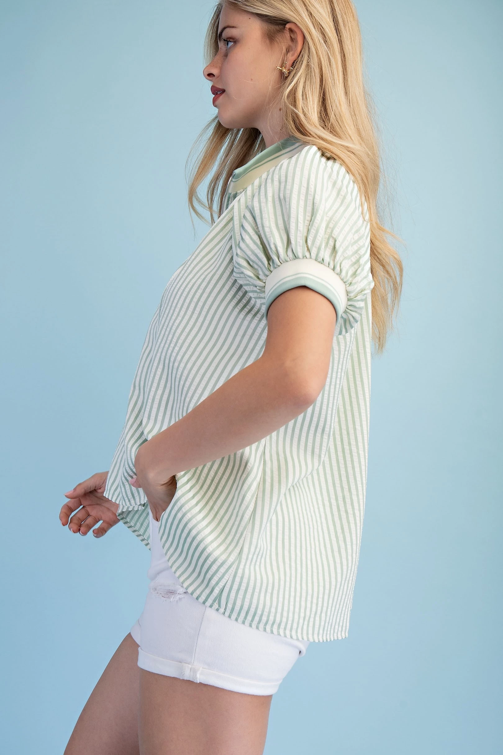 Textured Round Neck Top with Ruffled Contrasting Stripe Details. The Top is Lined