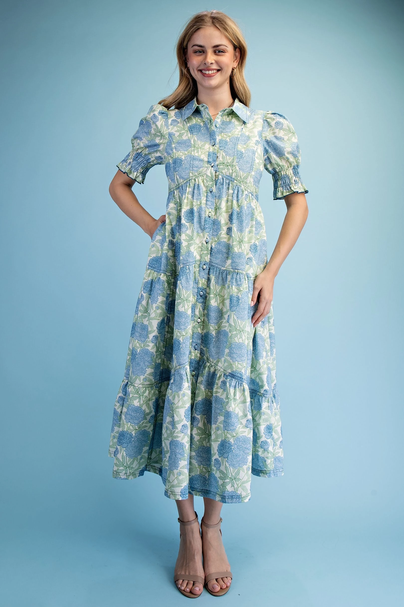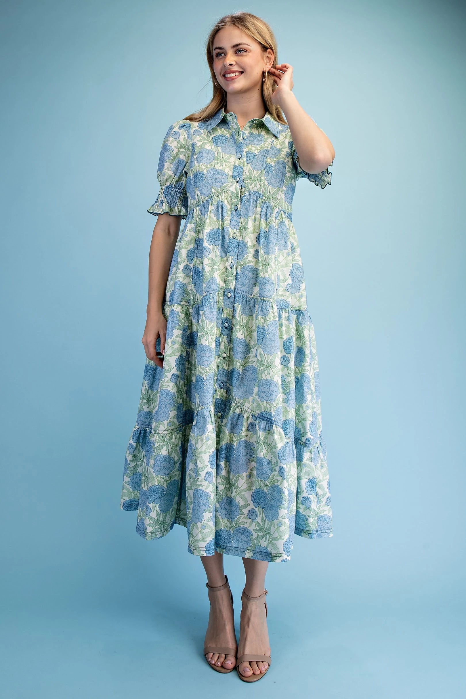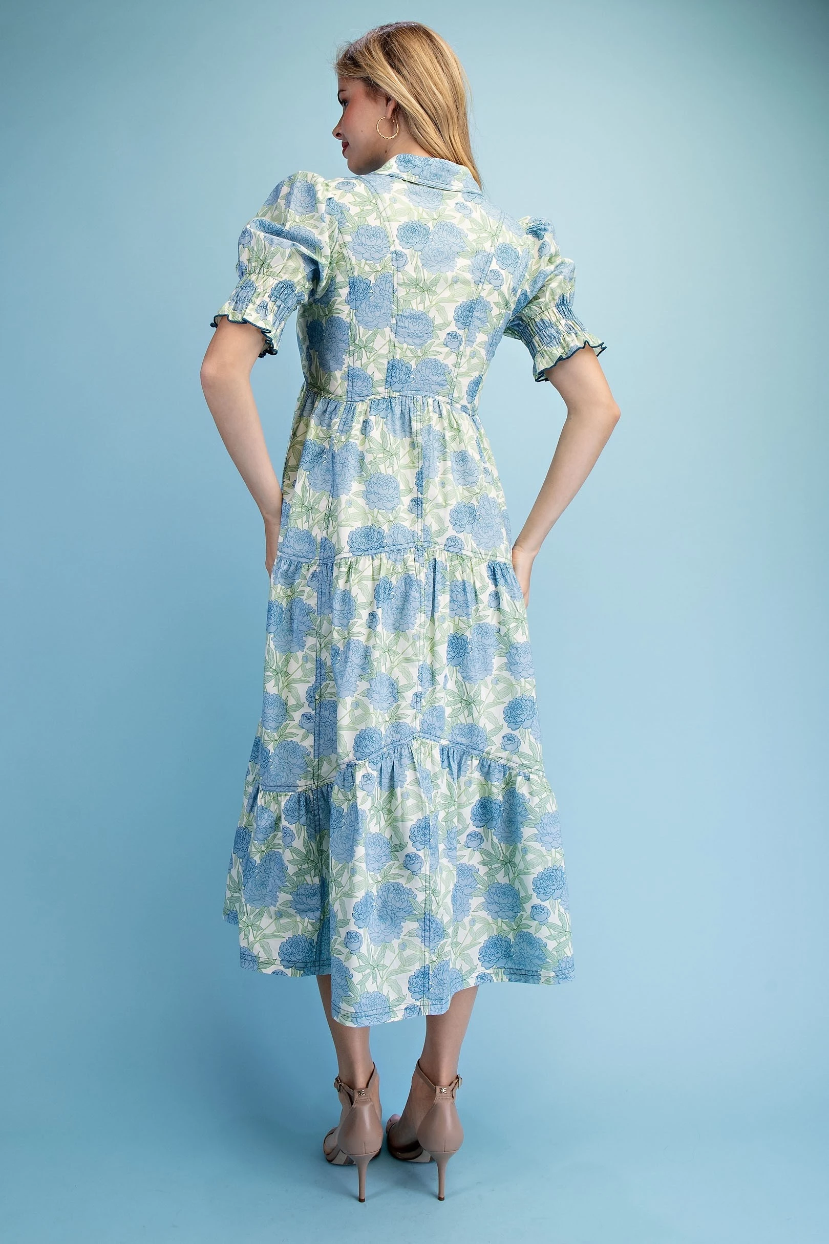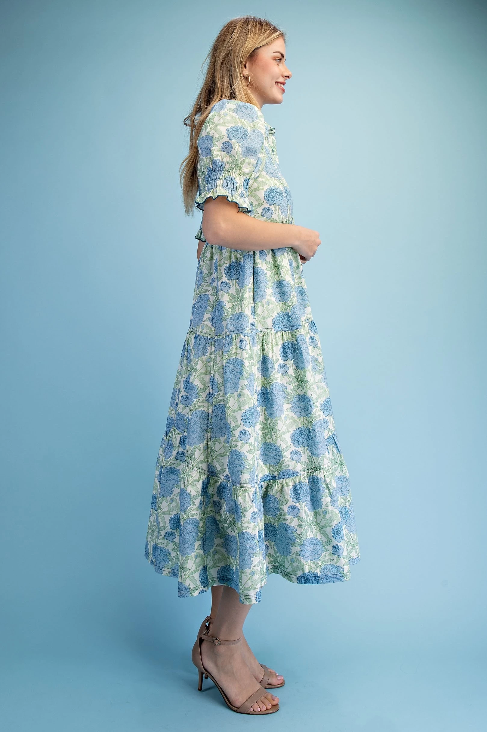 Floral Print Puff Sleeve Midi Dress with a Scalloped Waist and V-Neck. The Dress is Lined