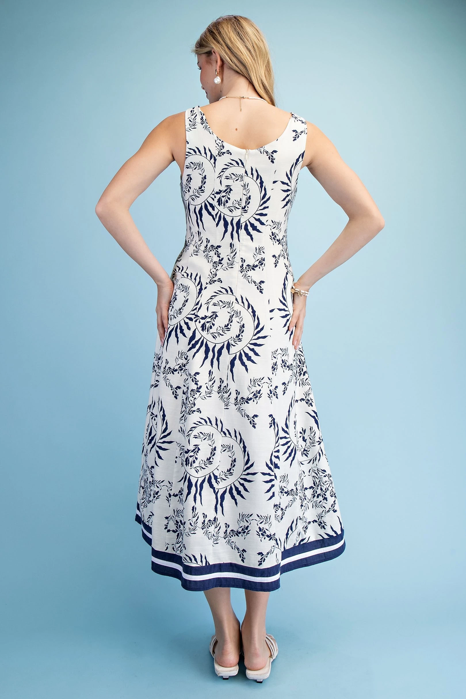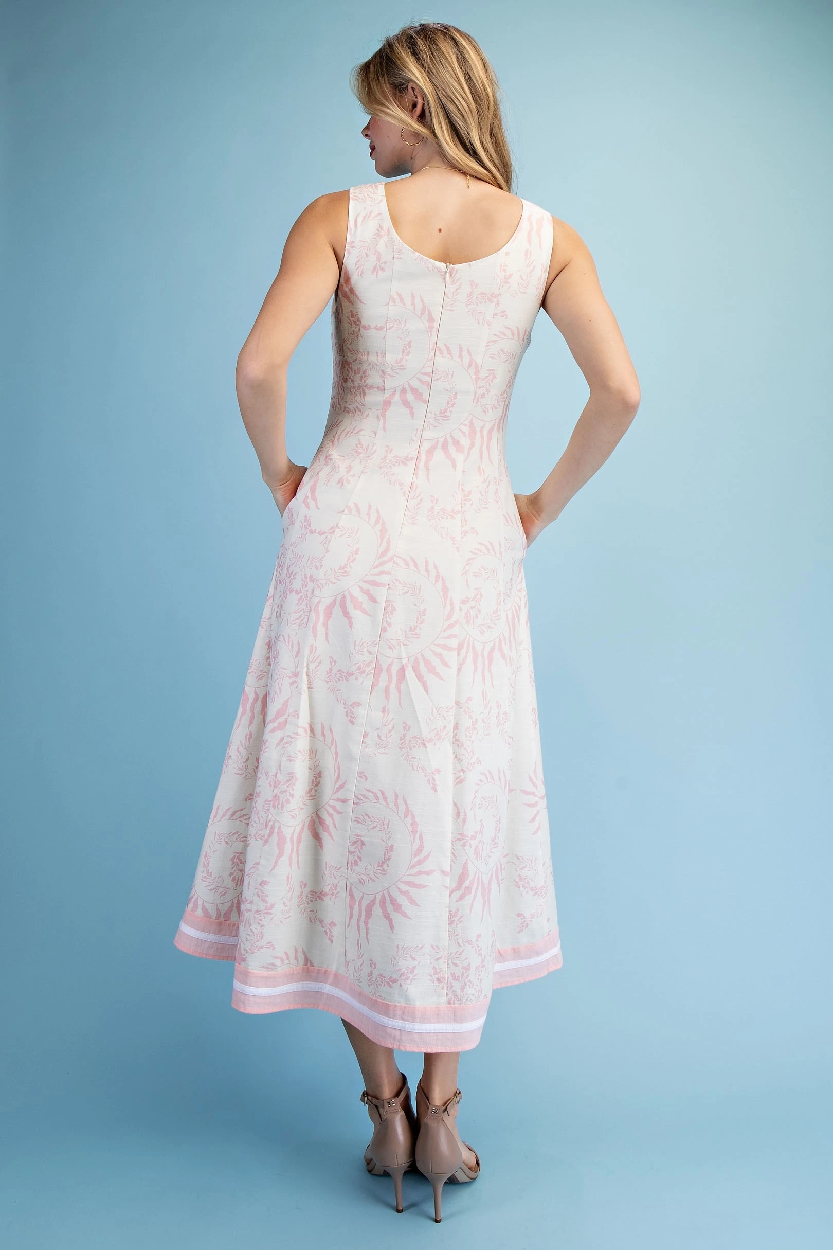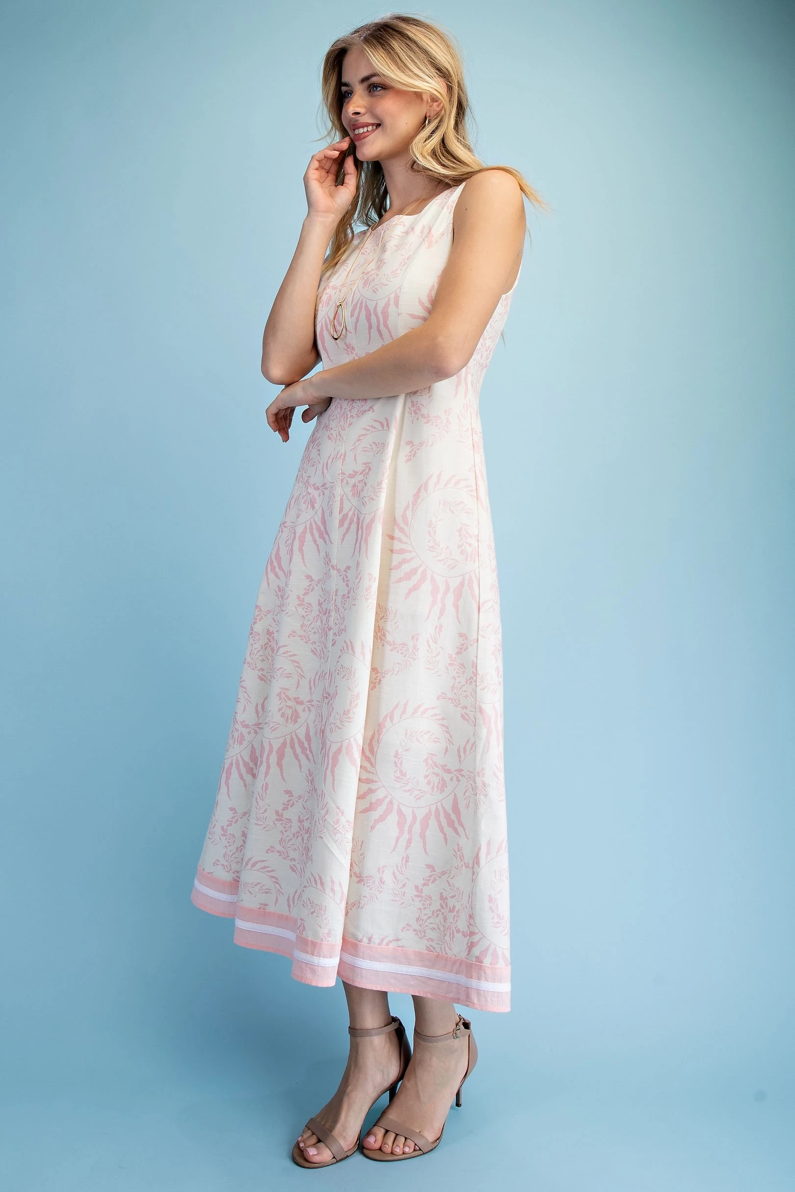 Floral Embroidered V-Neck Dress with Contrasting Stripe Details. The Dress is Lined