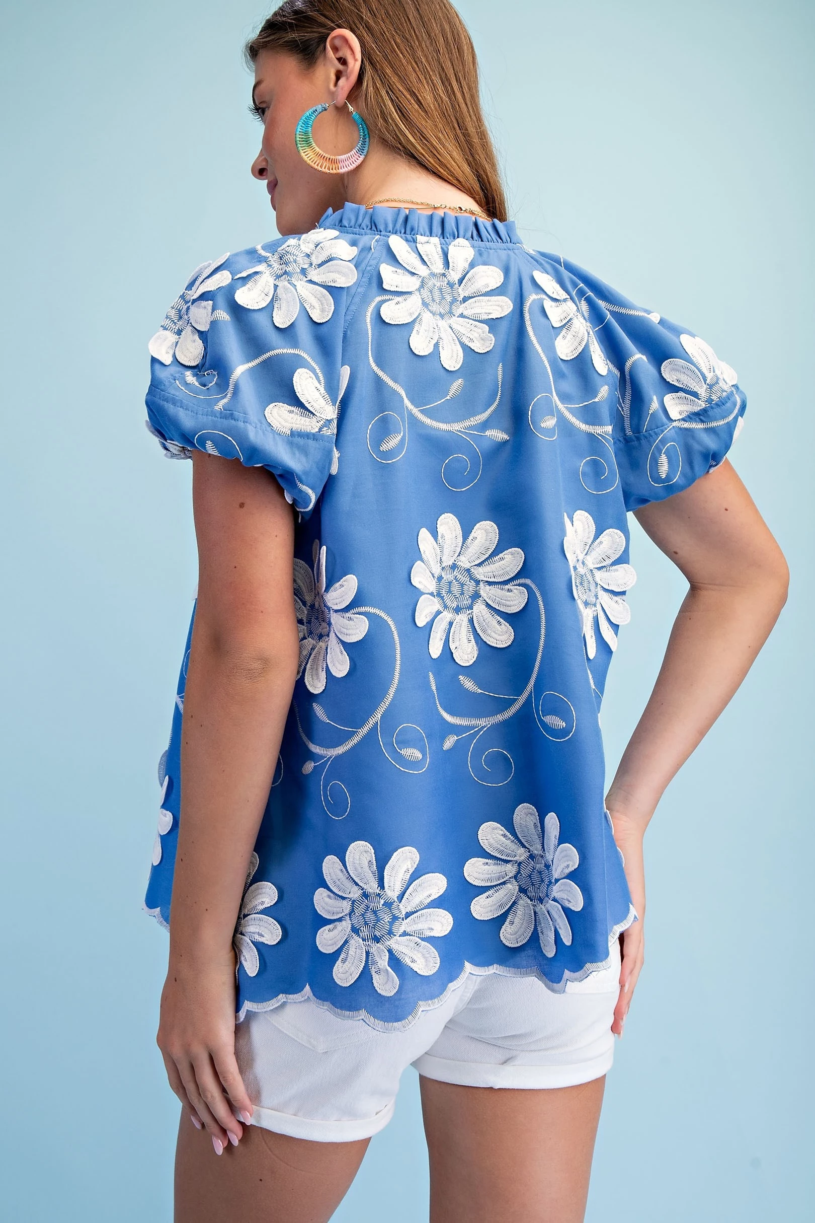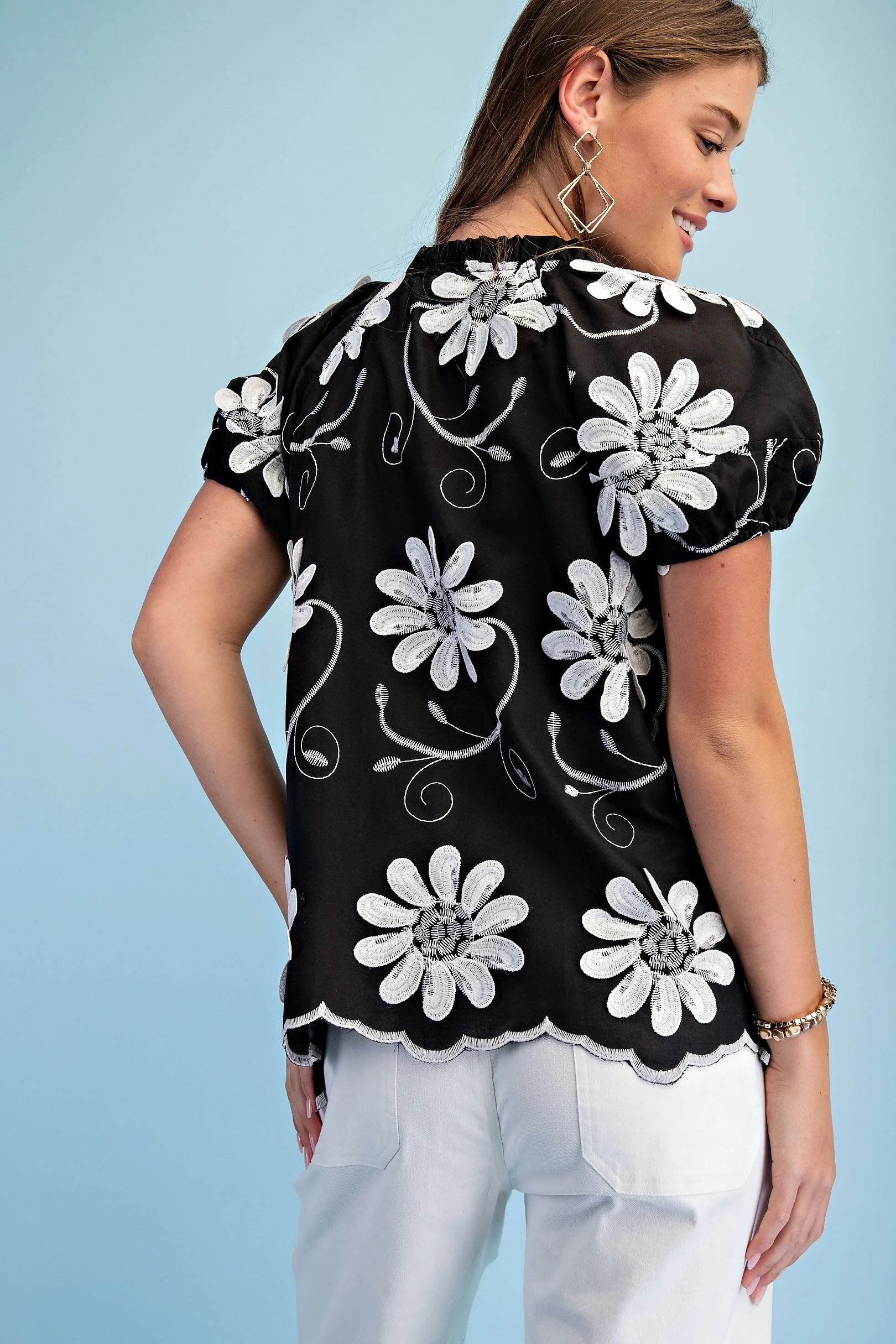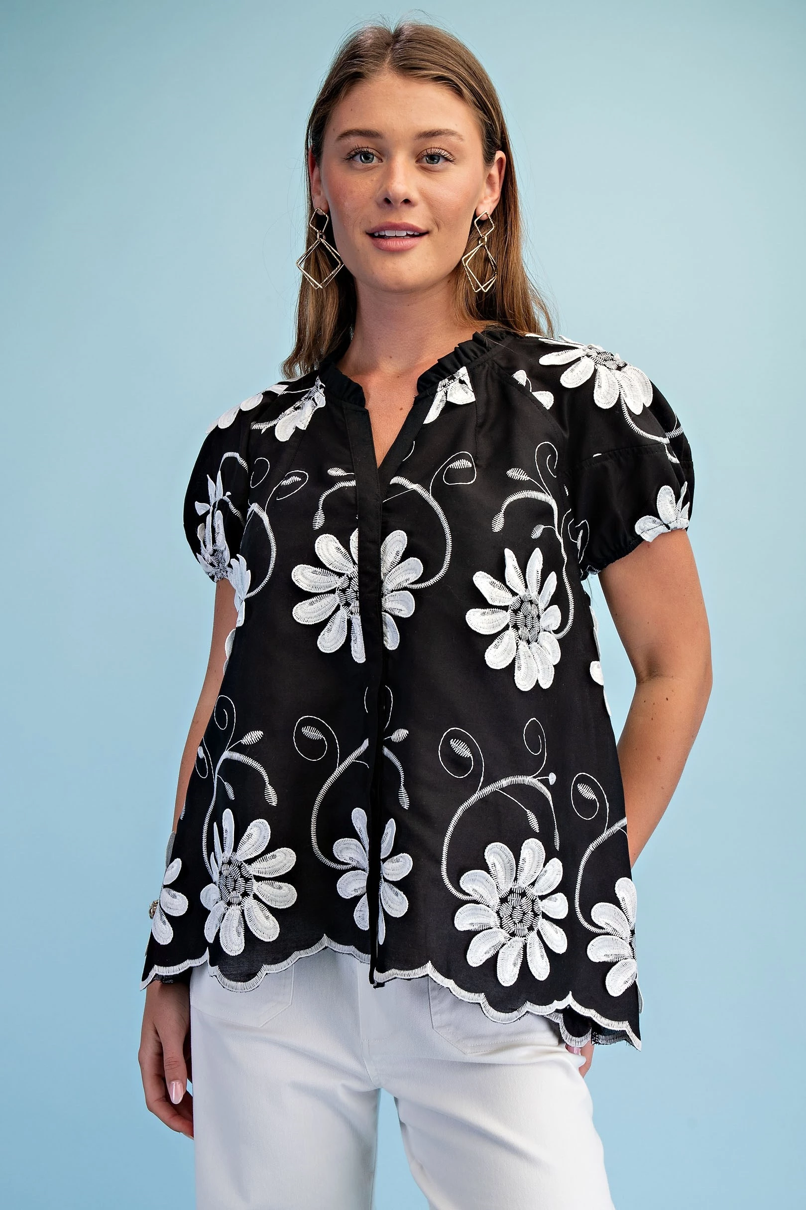 Floral Embroidered Top with a Scalloped Overlap Detail and a Decorative Trim