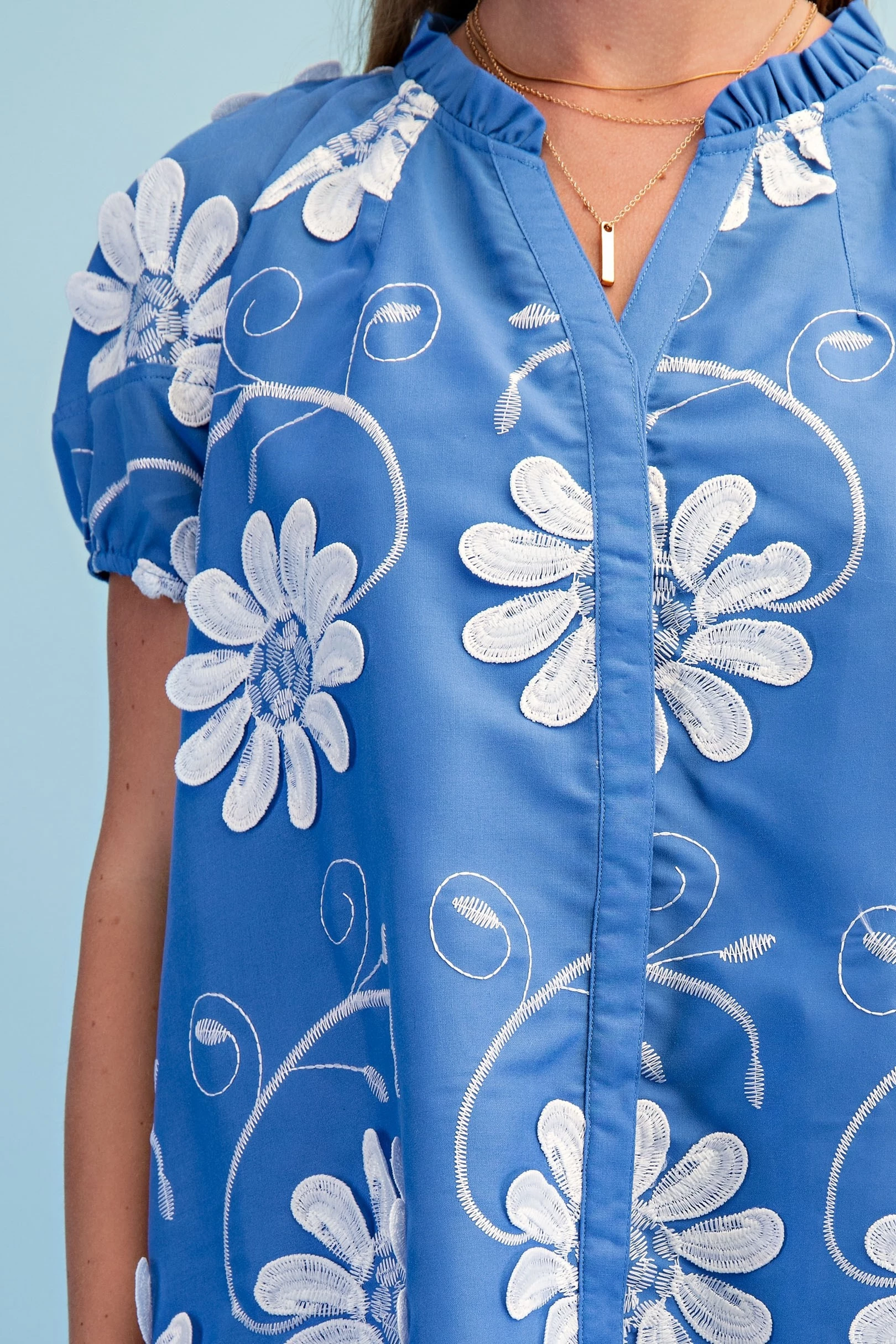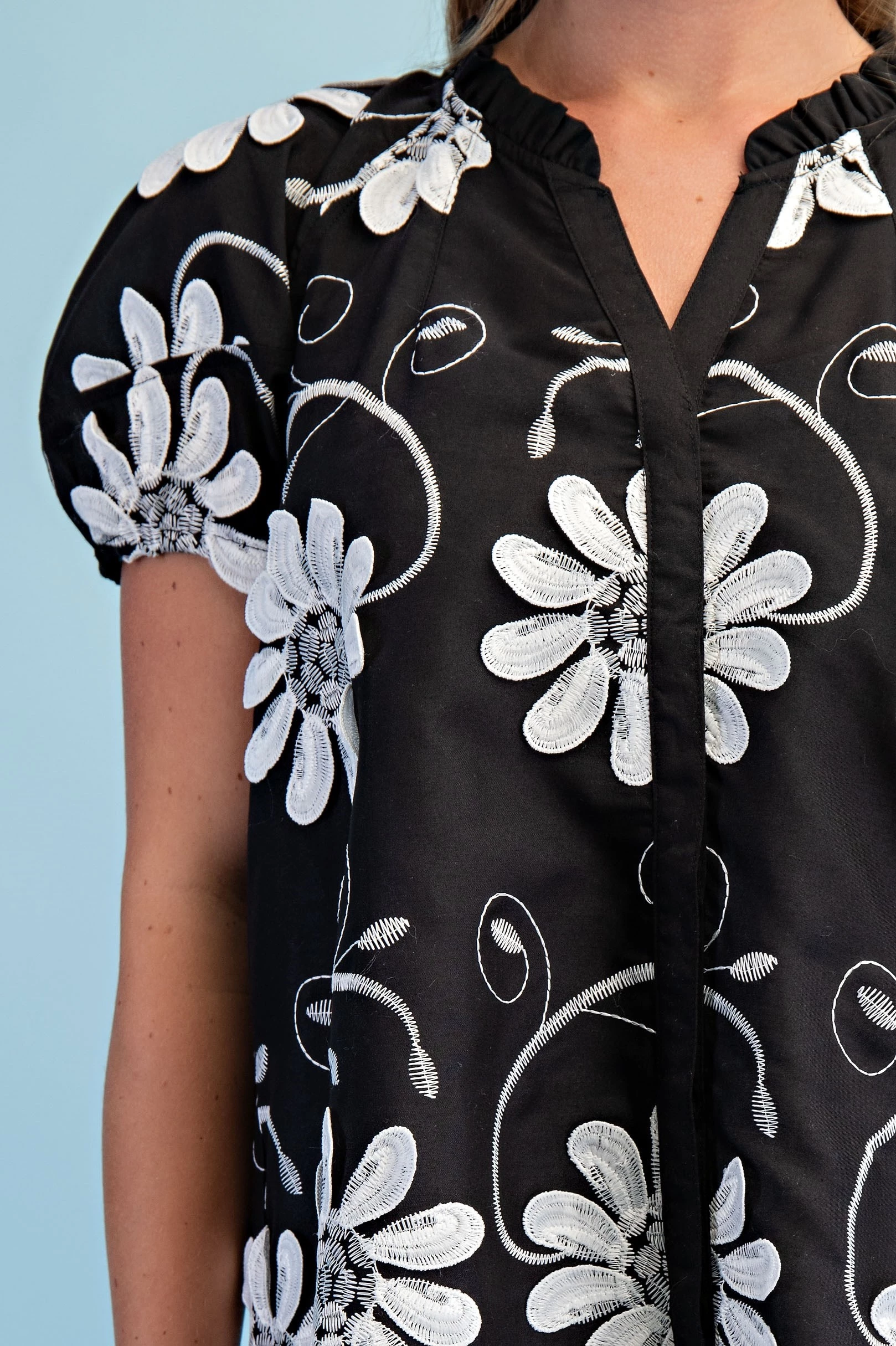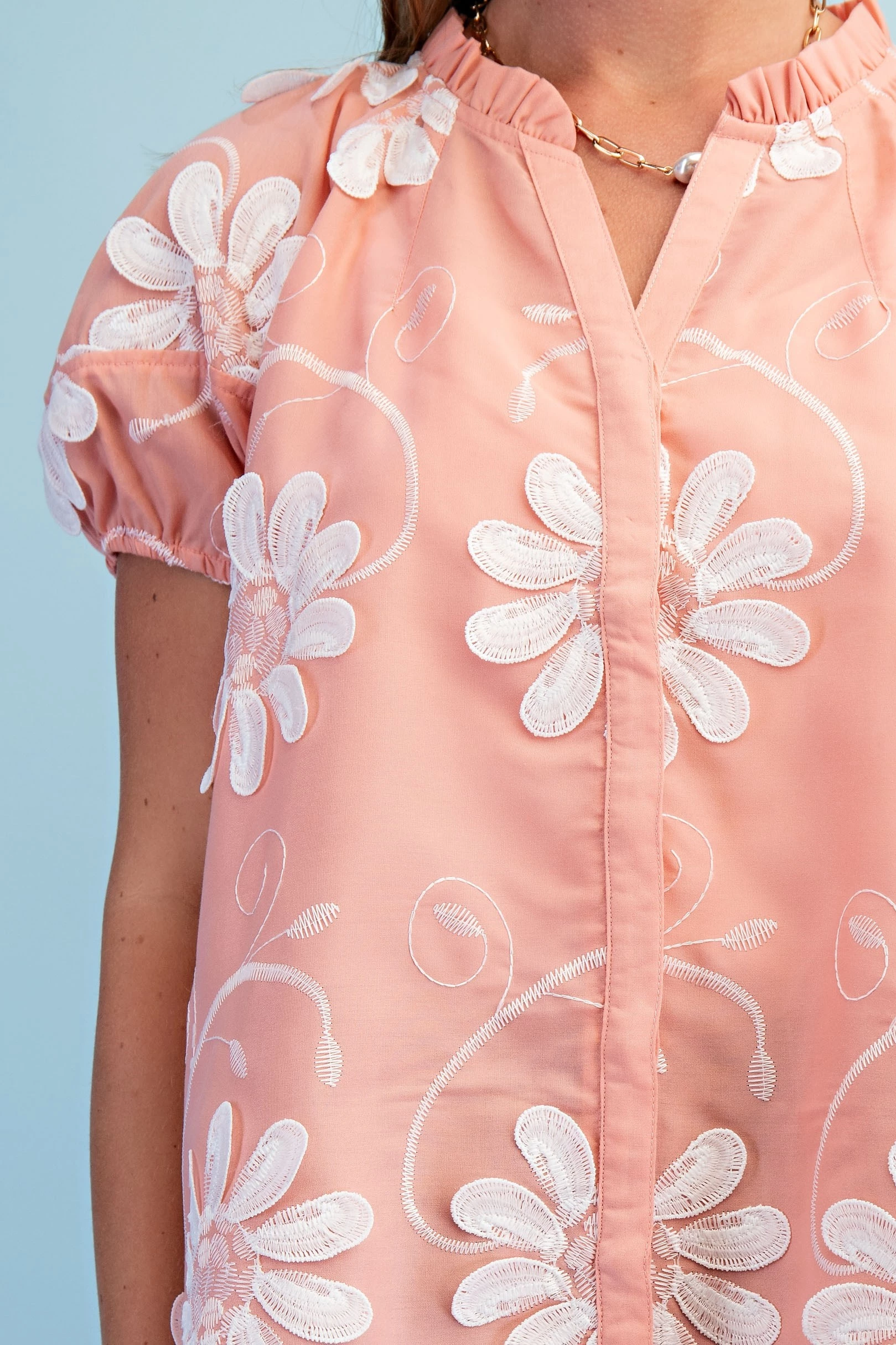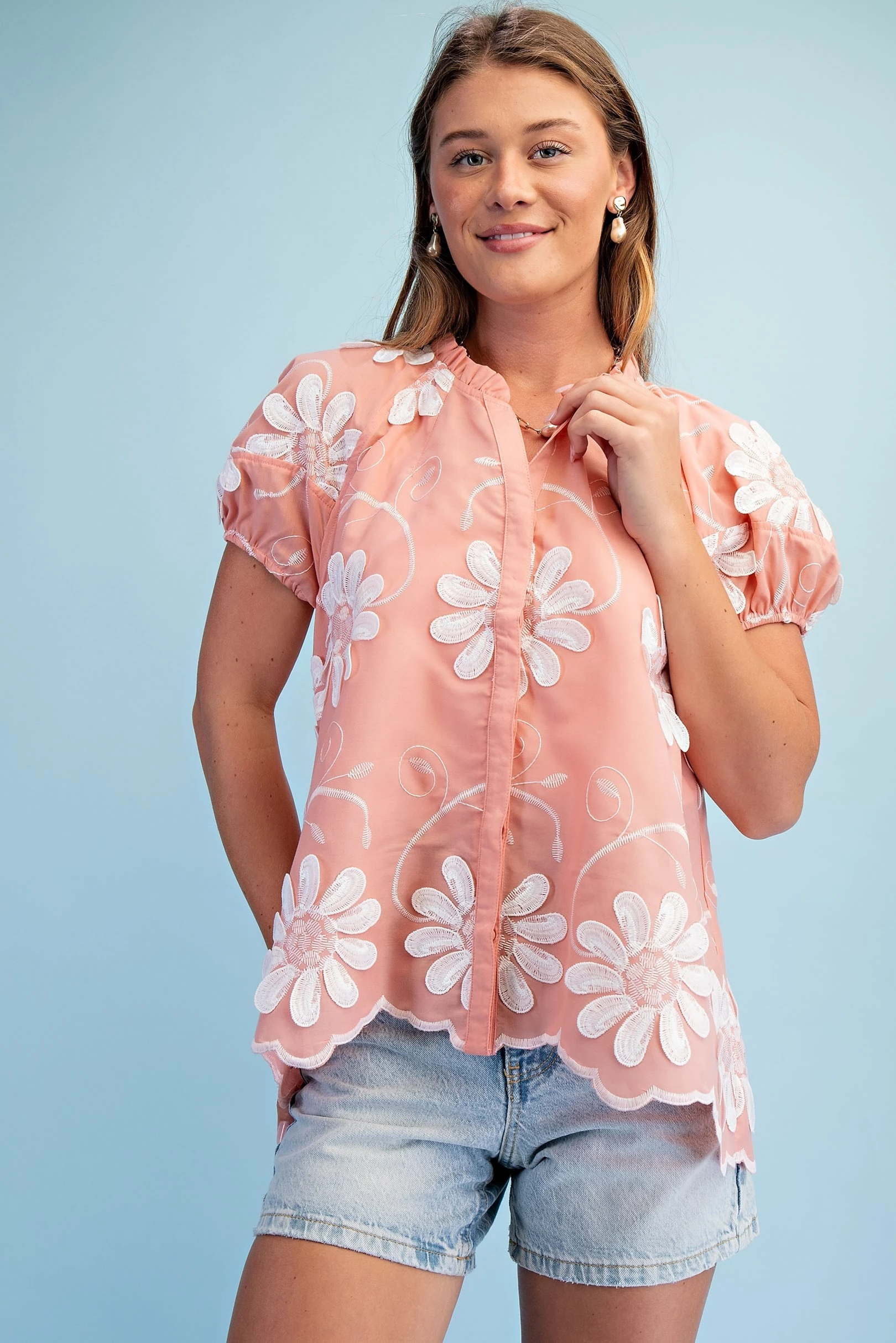 Floral Embroidered Top with a Scalloped Overlap Detail and a Decorative Trim