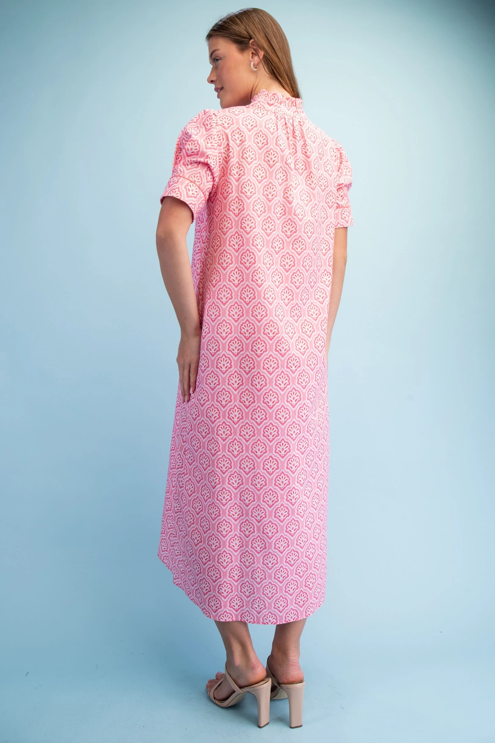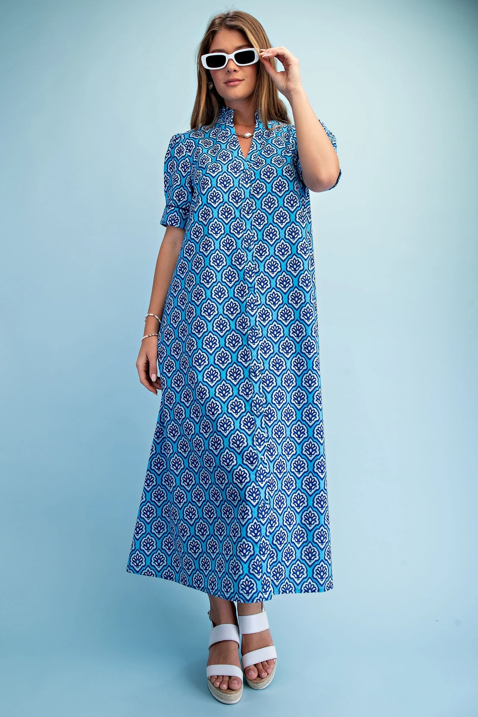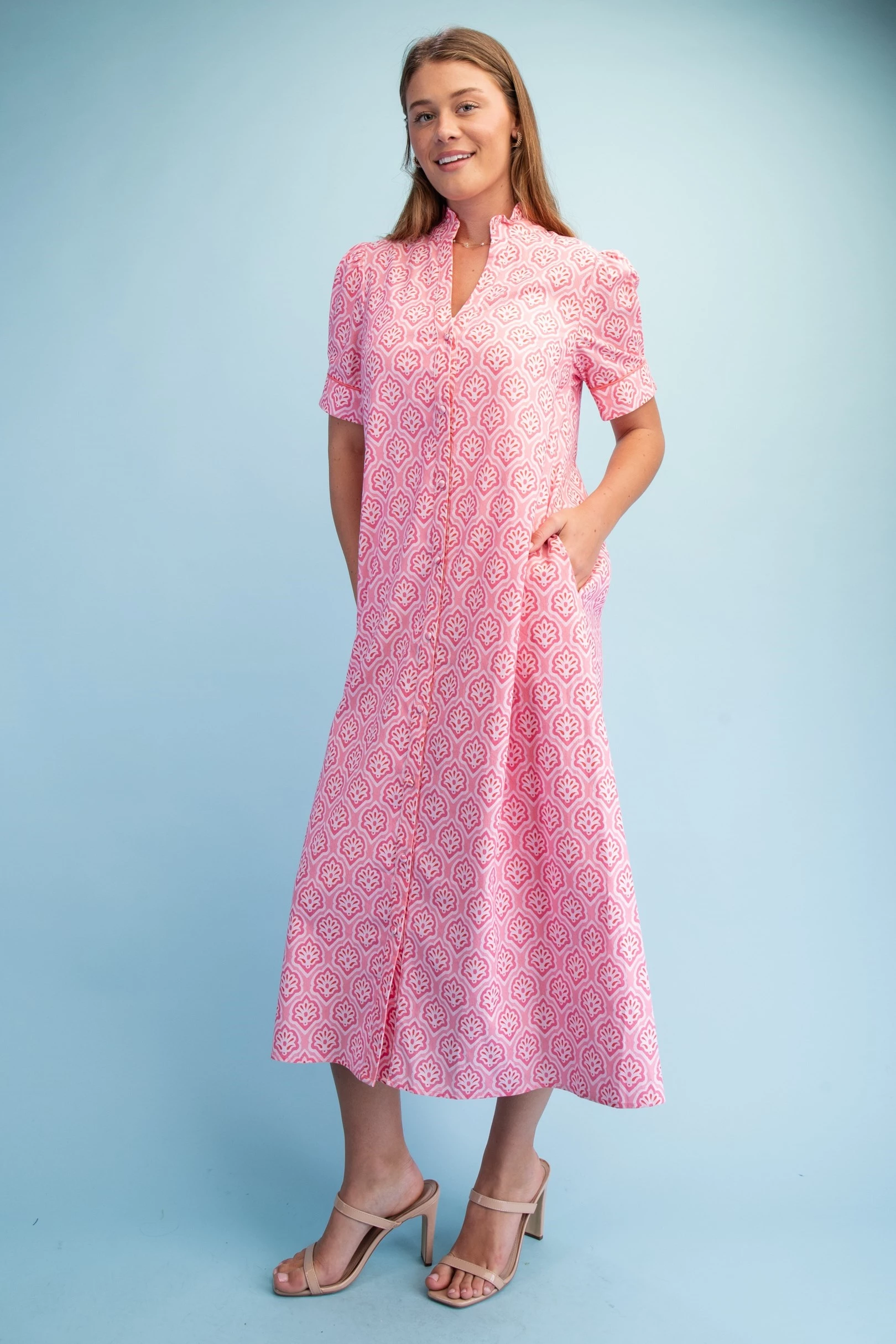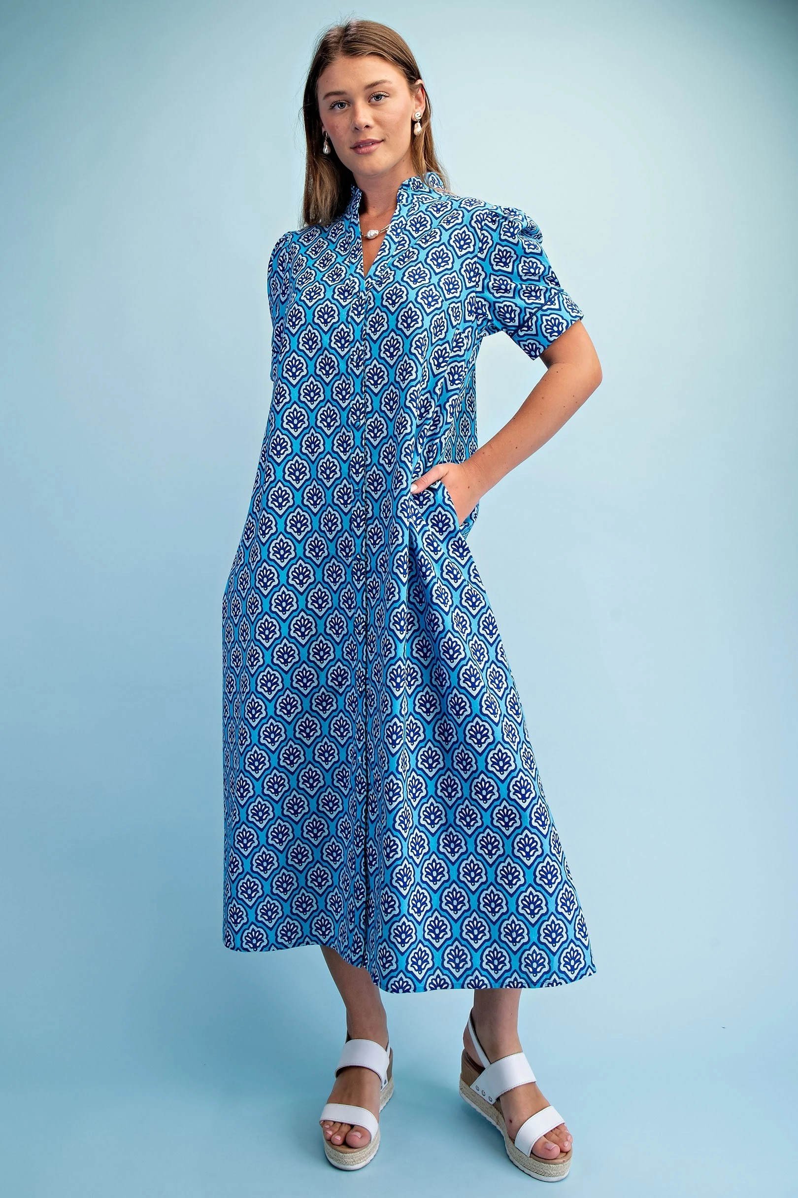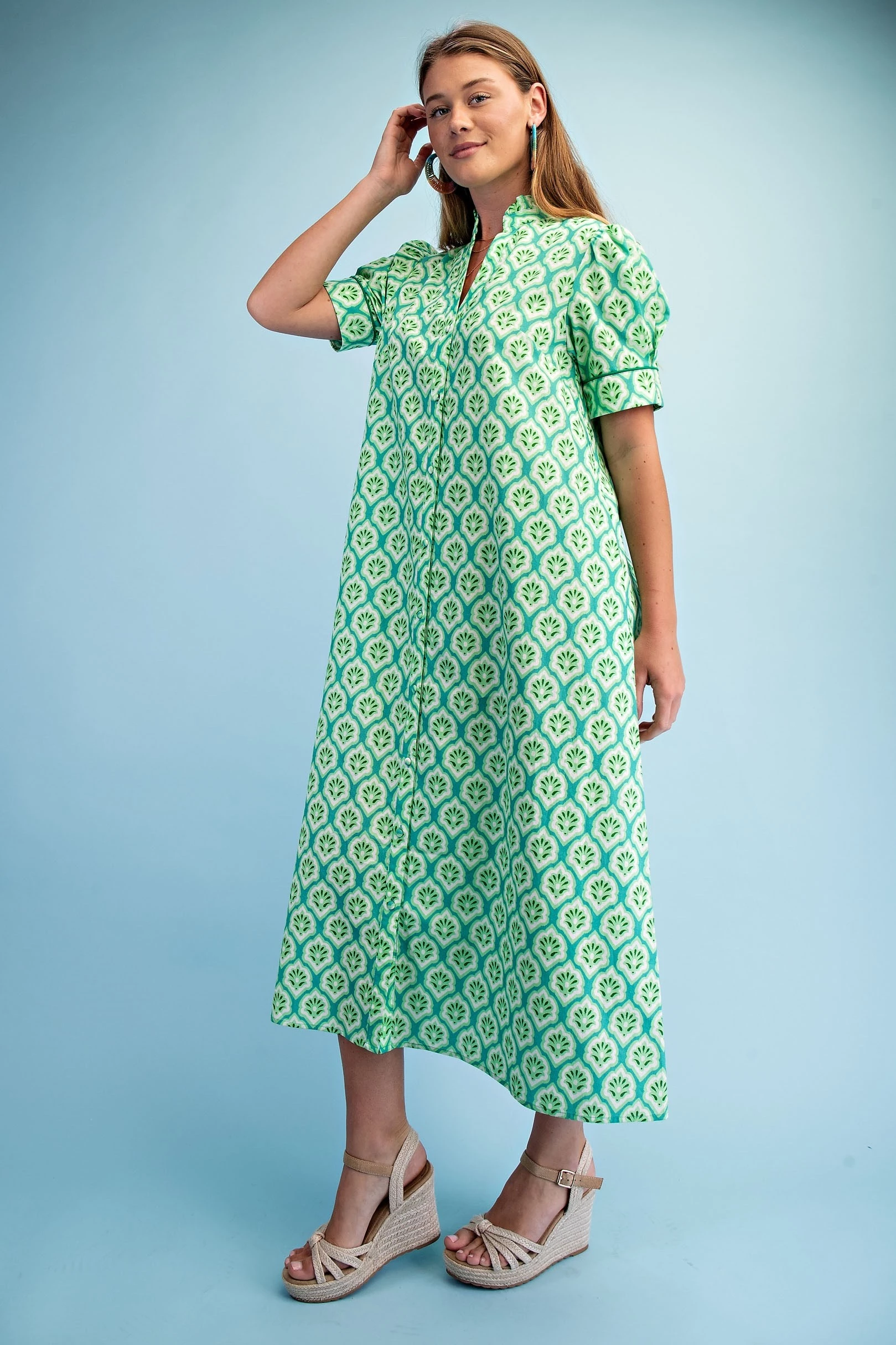 Bright Printed Button Down Midi Dress with a Ruffled Collar and Elastic Banded Arms
