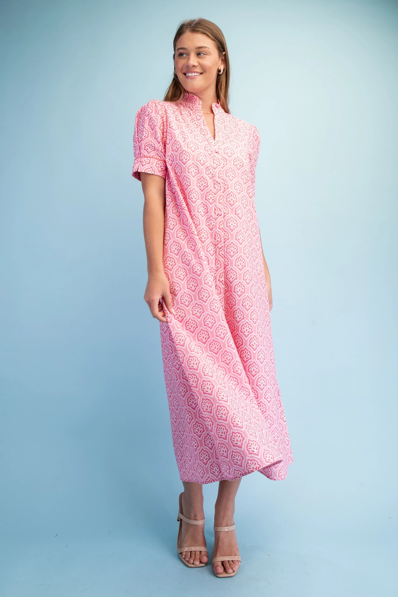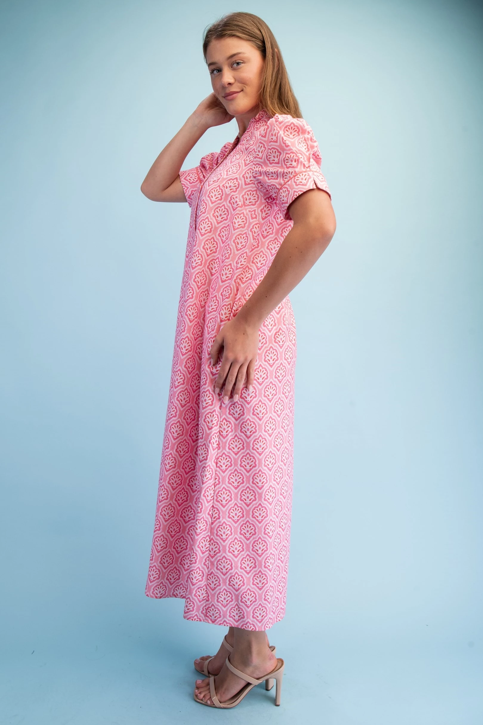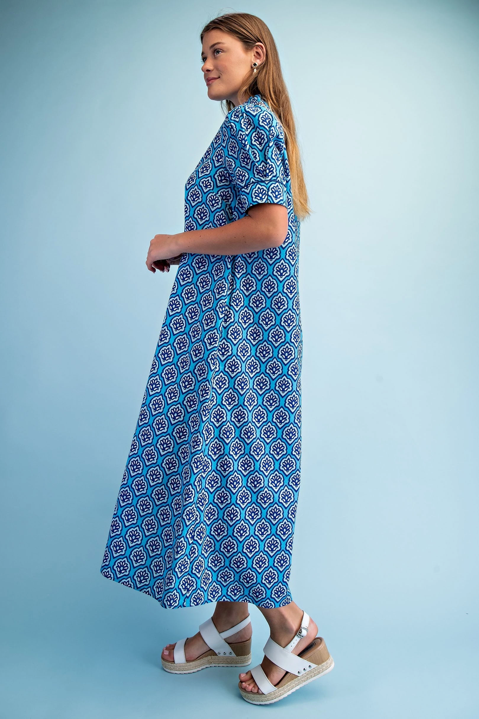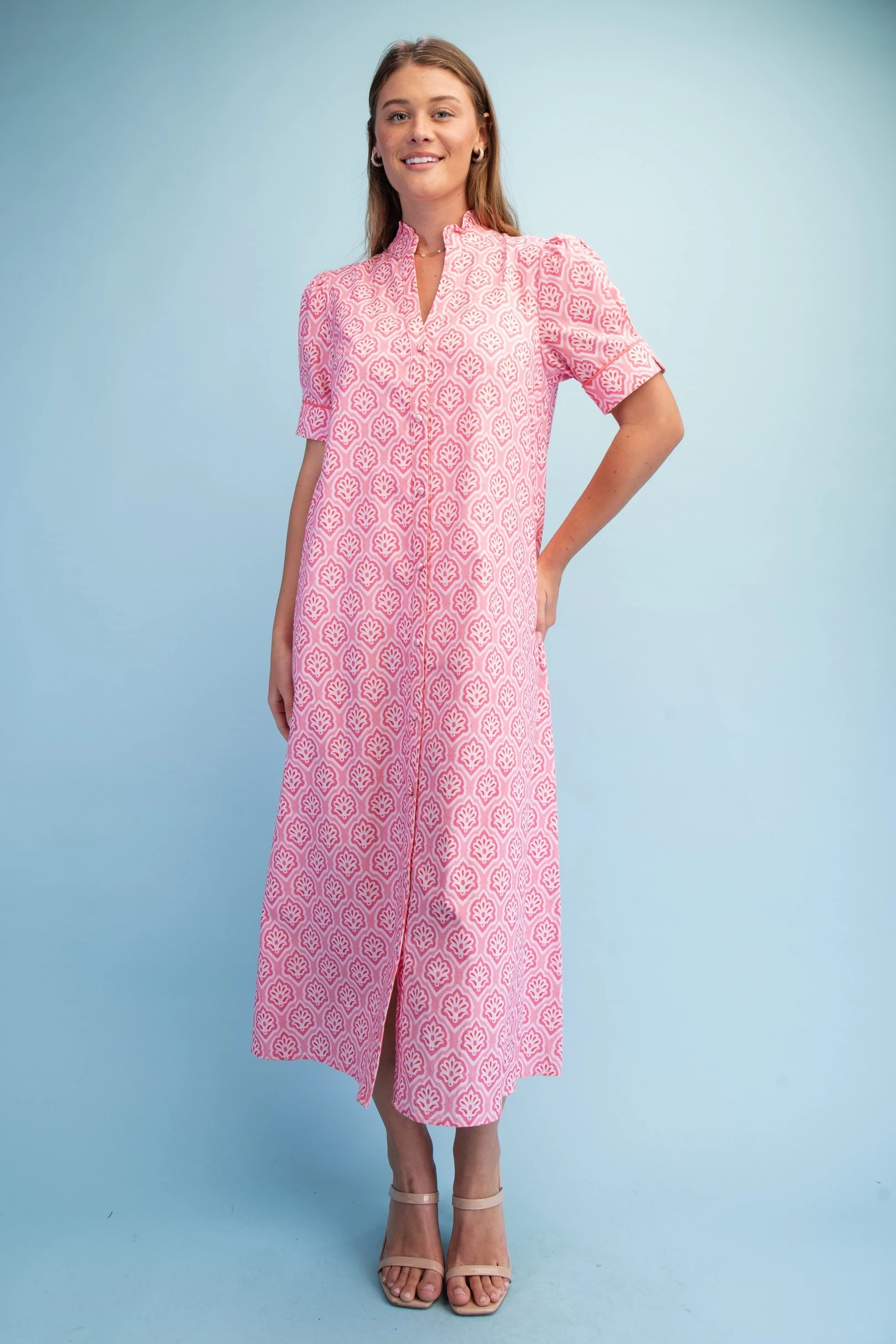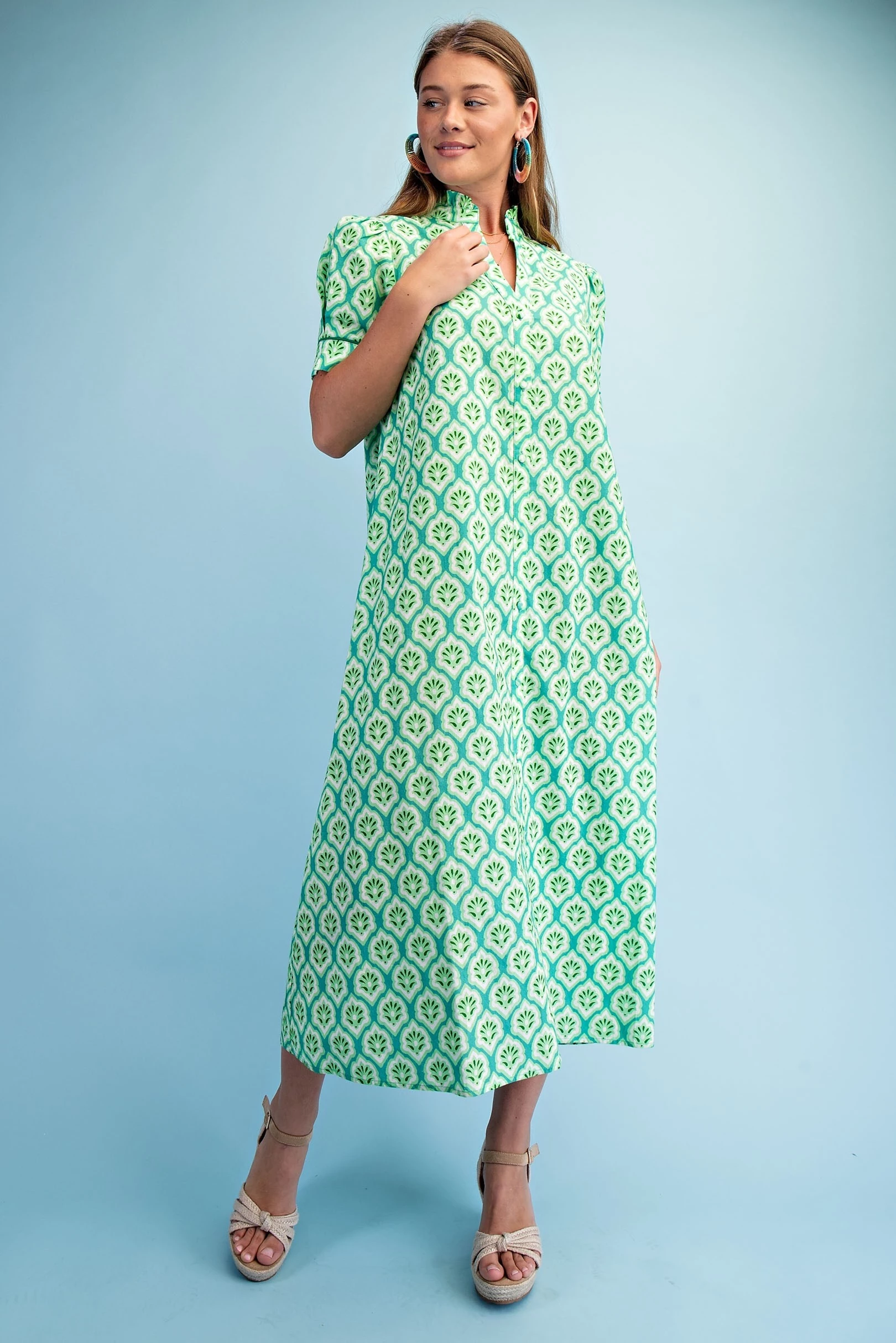 Bright Printed Button Down Midi Dress with a Ruffled Collar and Elastic Banded Arms