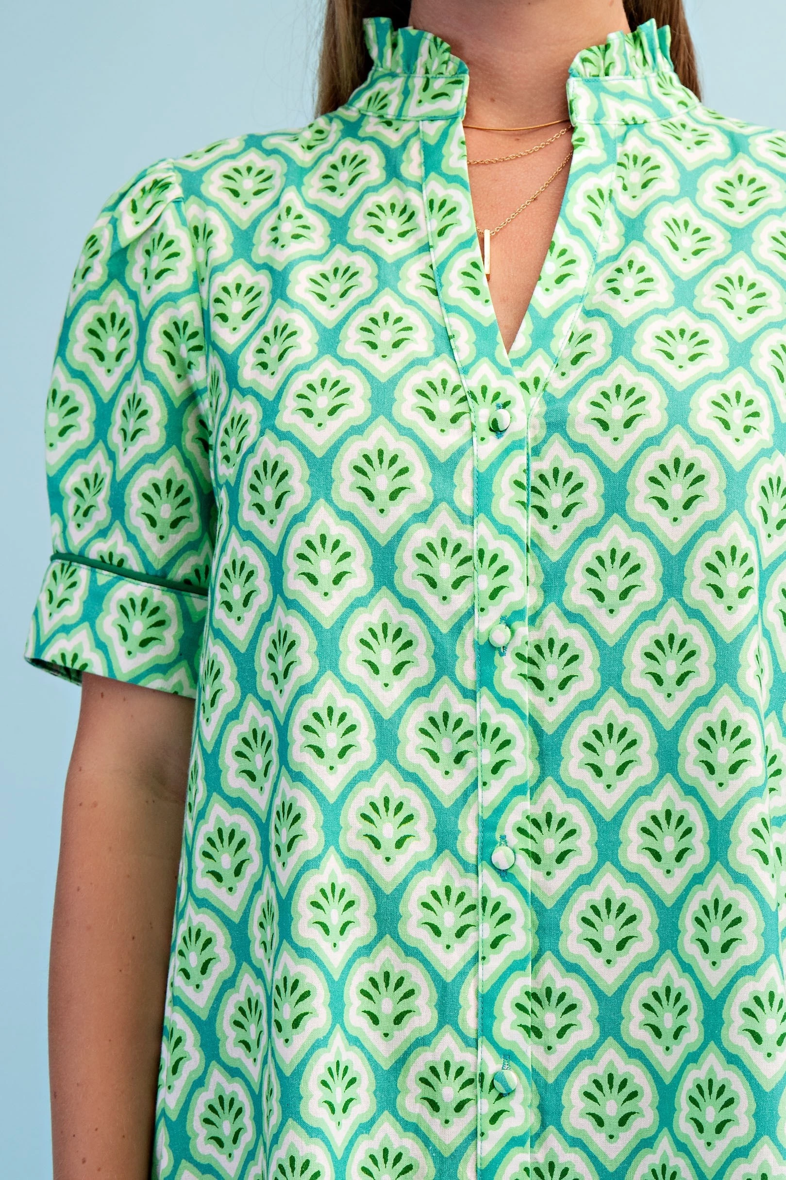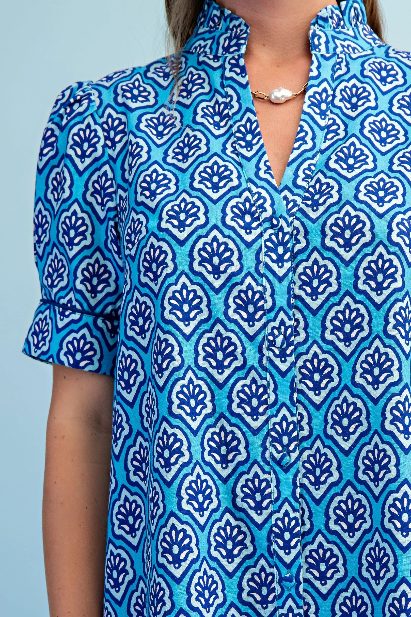 Floral Tile Print Short Puff Sleeve Top with Trim Details and a Shirred Neck