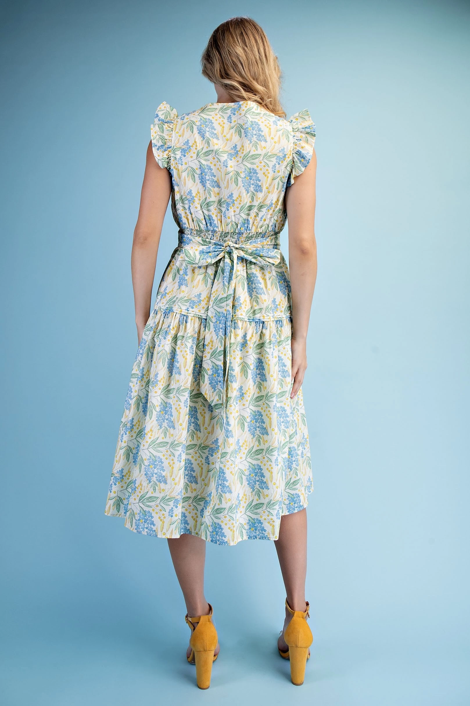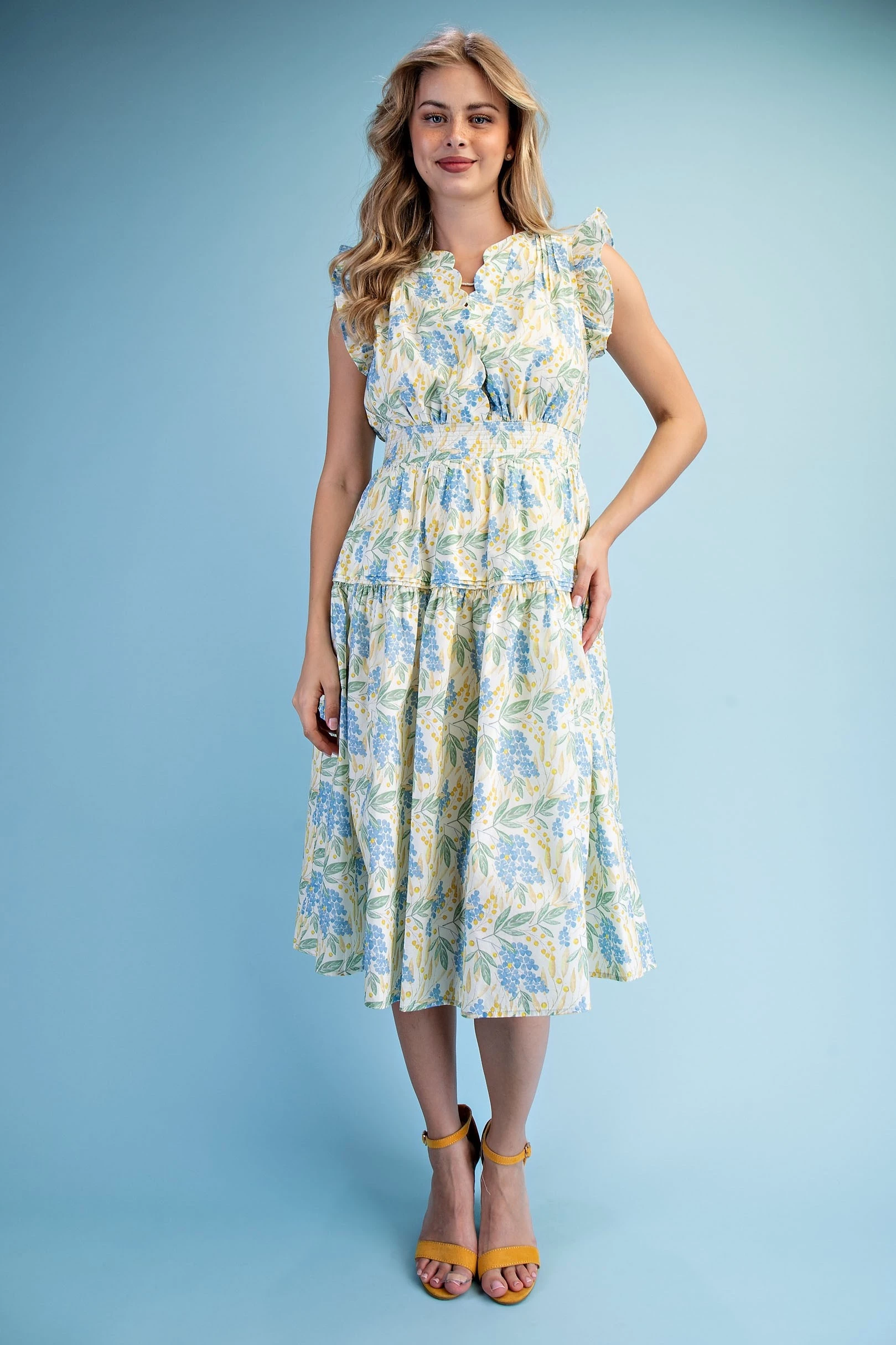 Floral Print Ruffle Sleeve Midi Dress with a Scalloped Snap Closure Neck and a Back Elastic Waist. The Dress is Lined