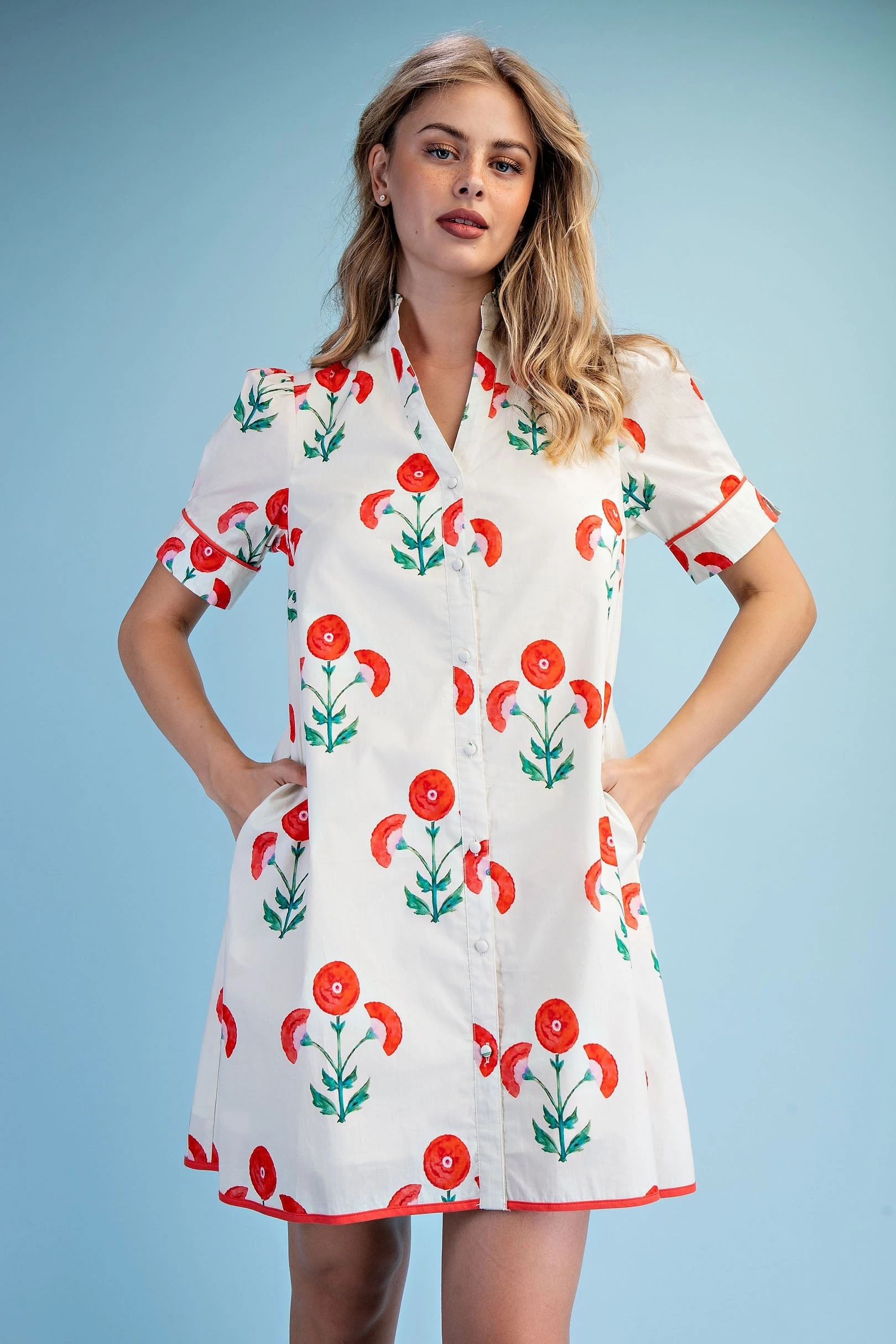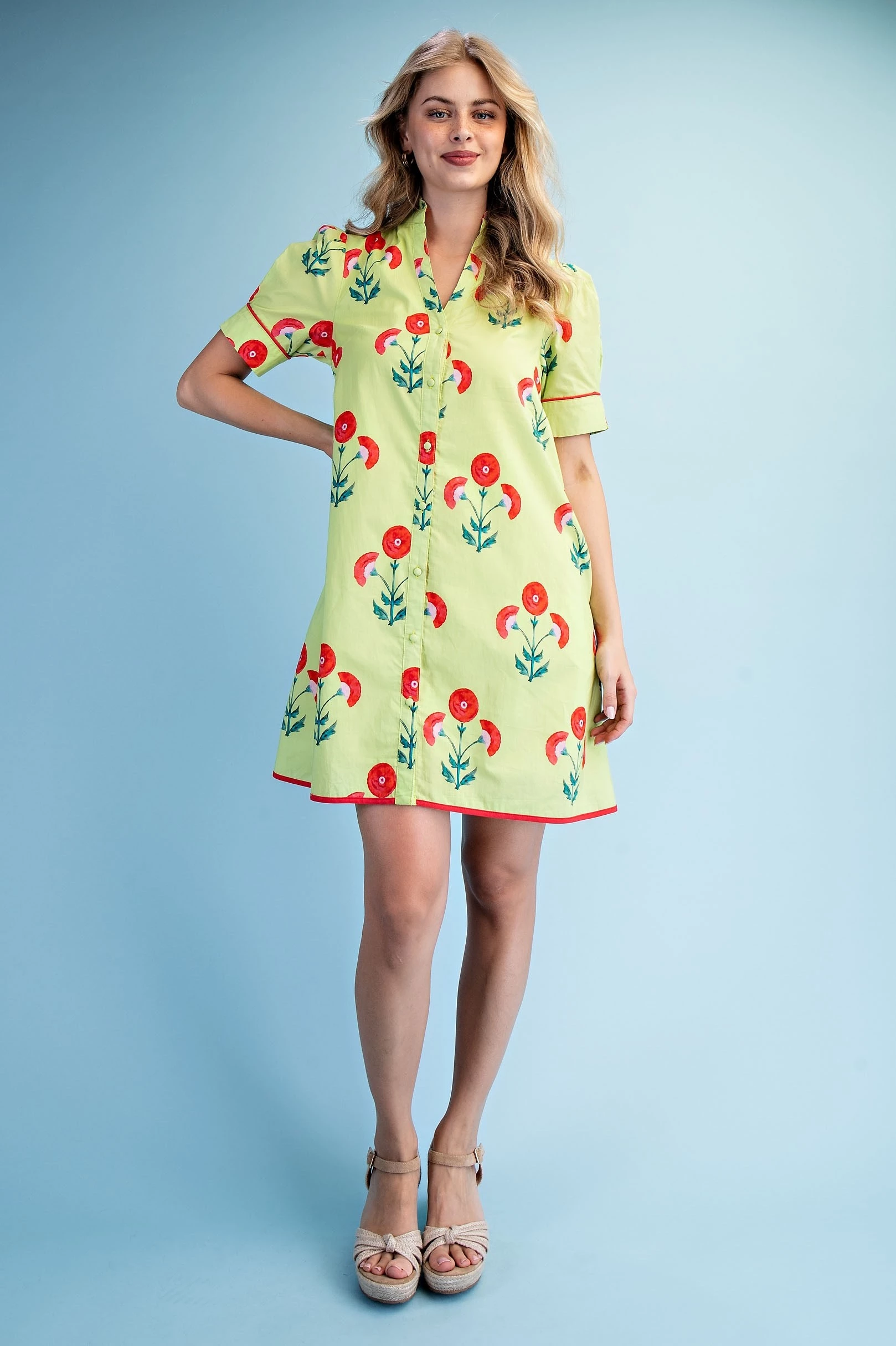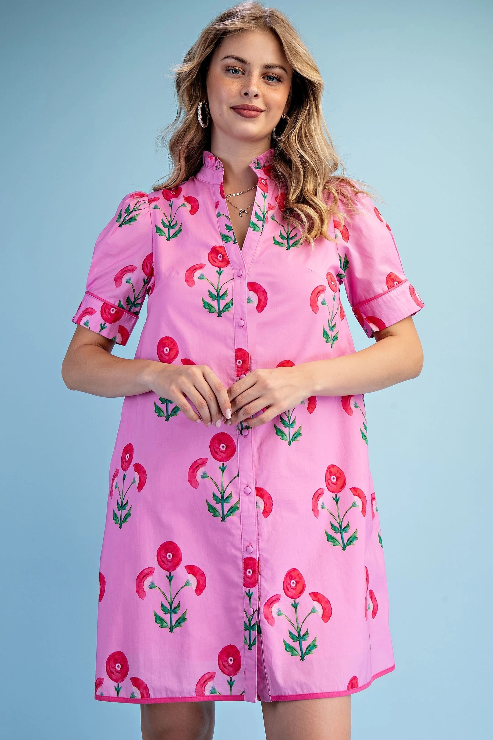 Bright Floral Button Down Dress with Pleated Short Sleeves and Piping Details. The Dress is Lined