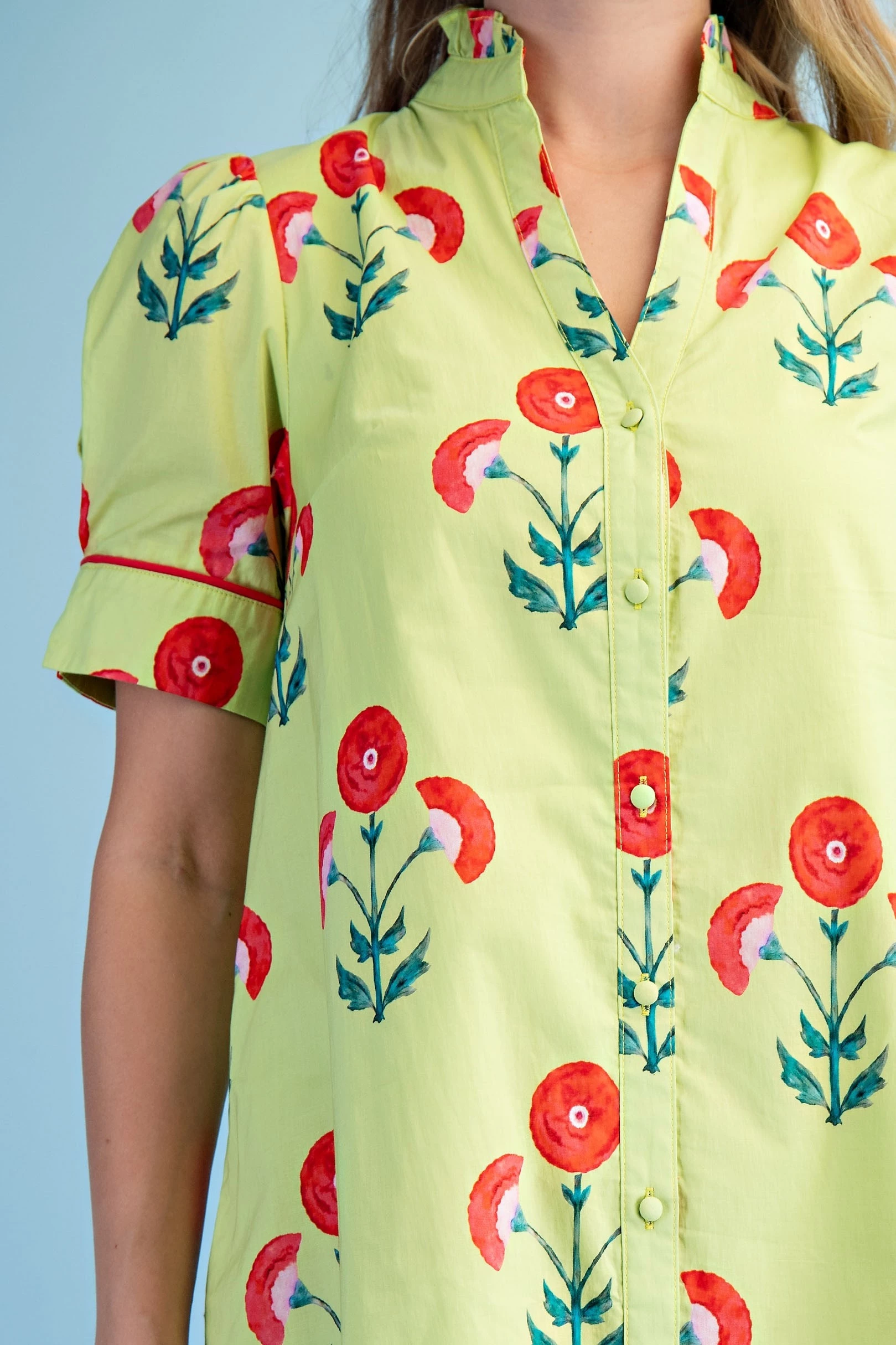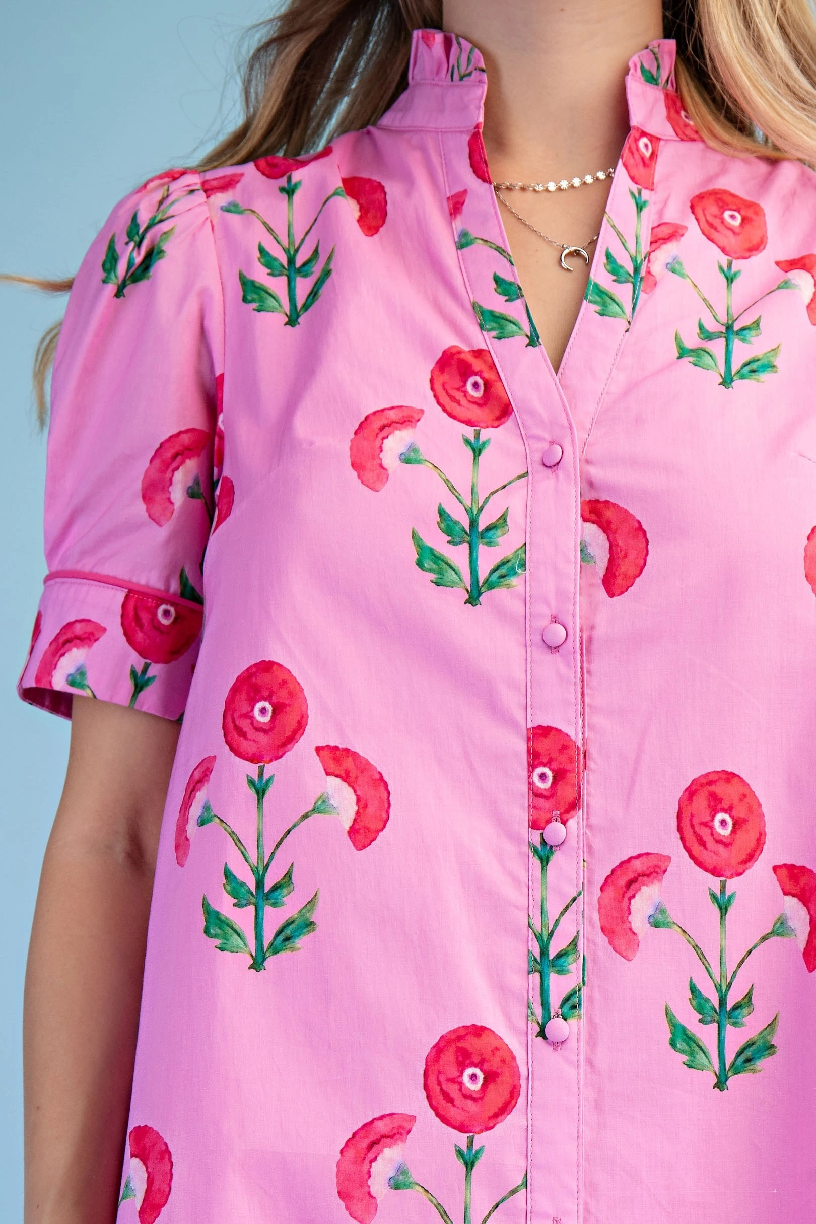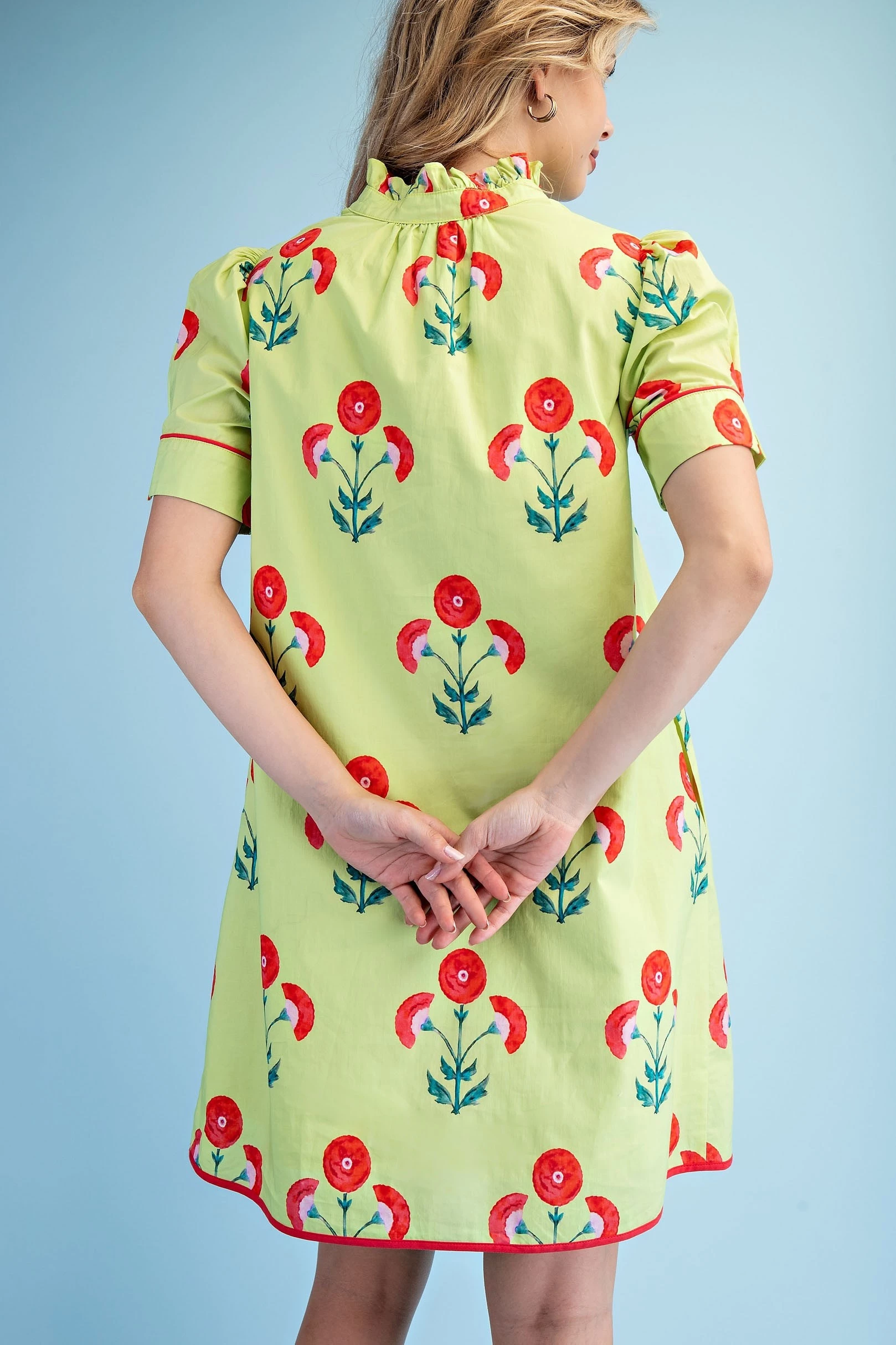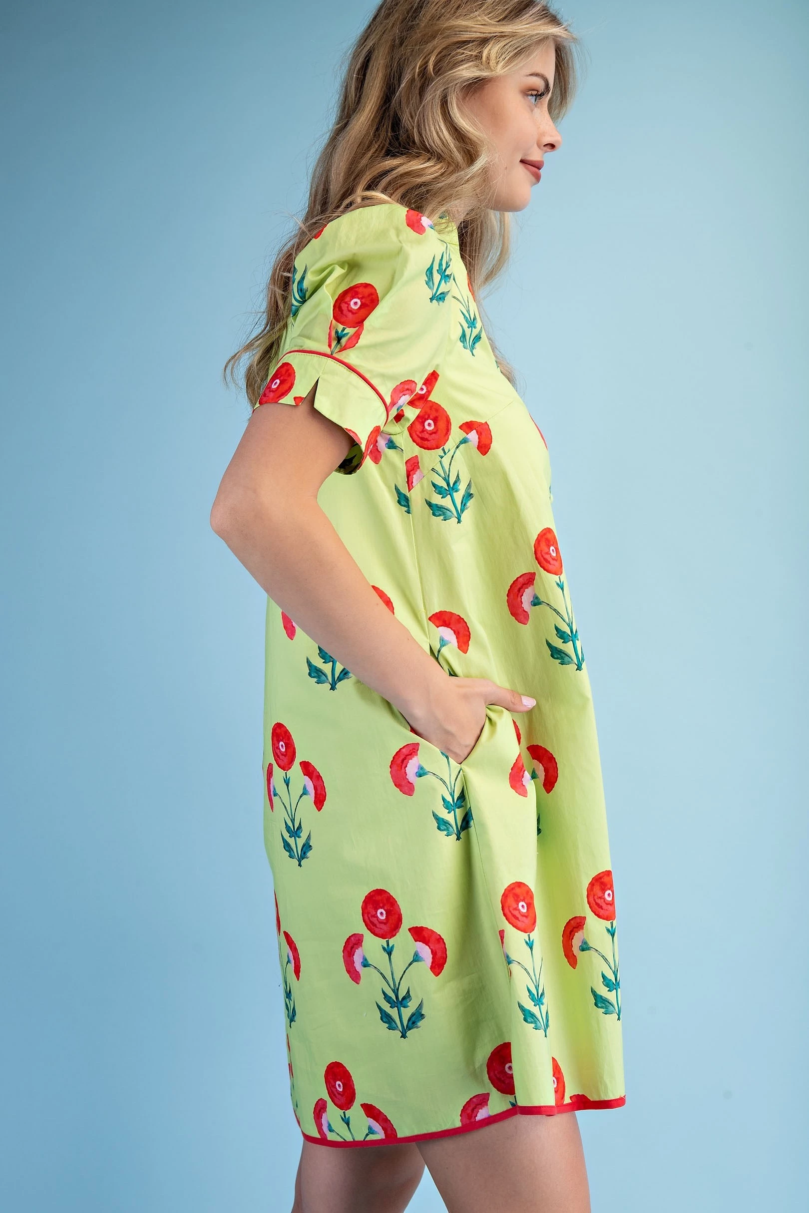 Bright Floral Button Down Dress with Pleated Short Sleeves and Piping Details. The Dress is Lined