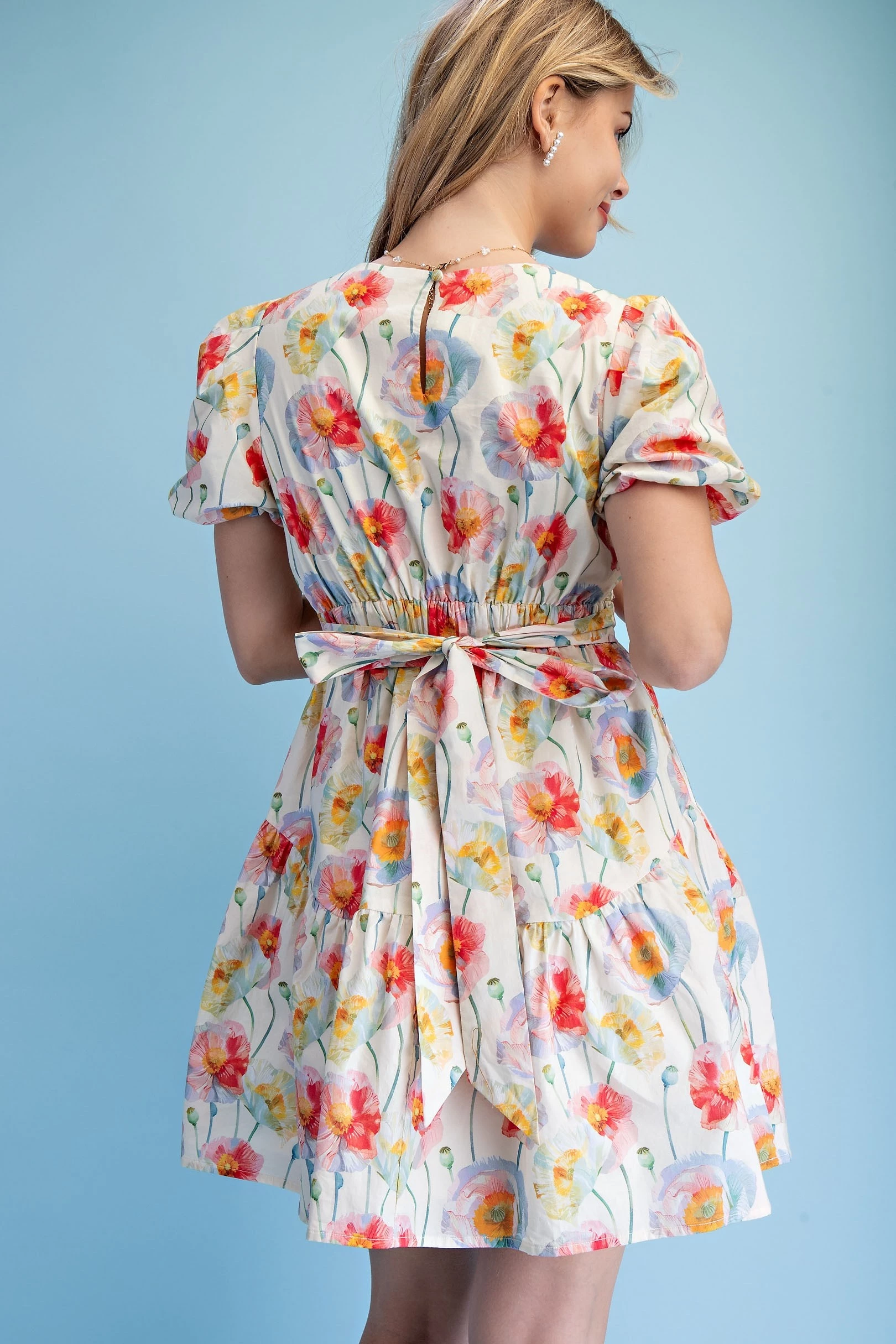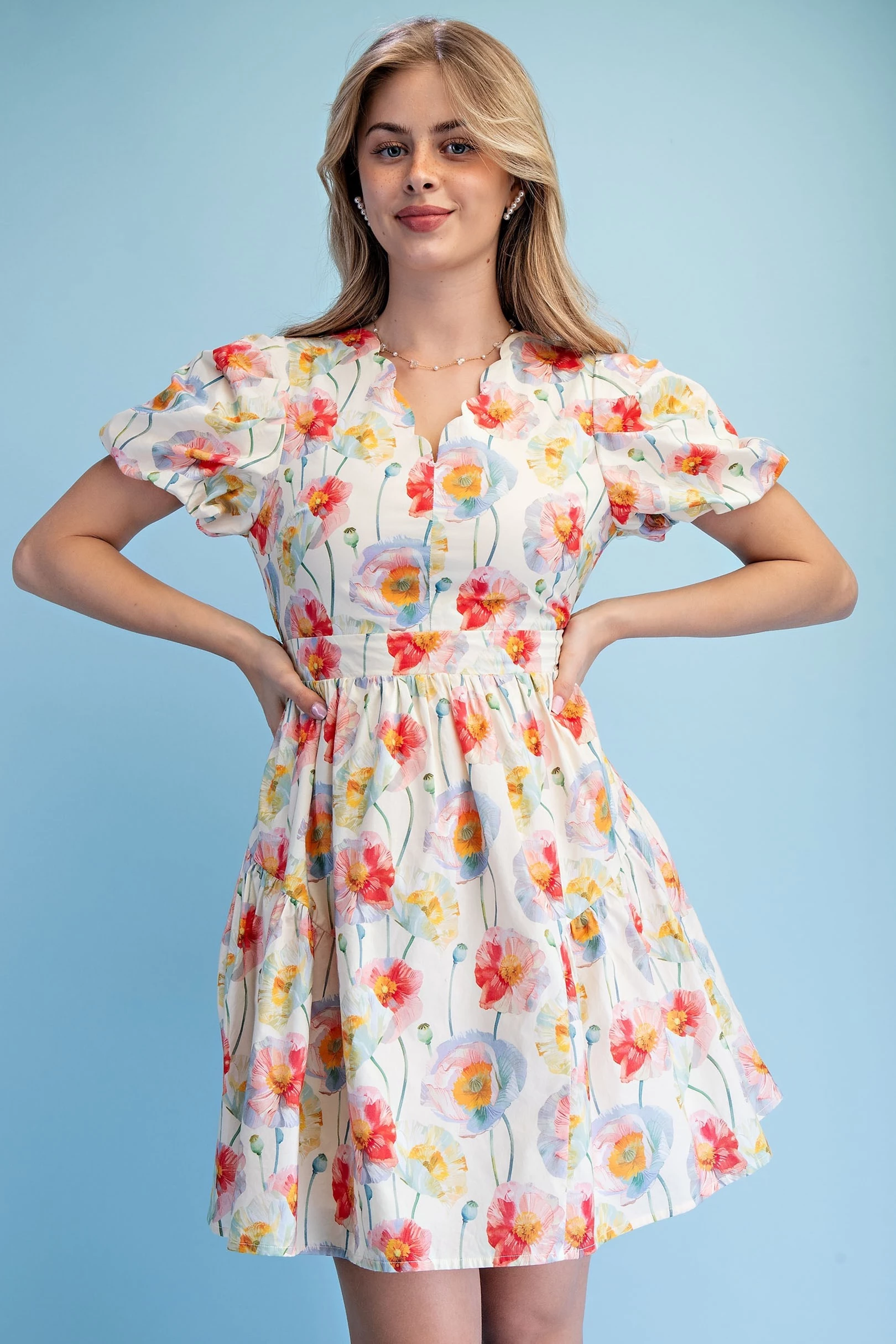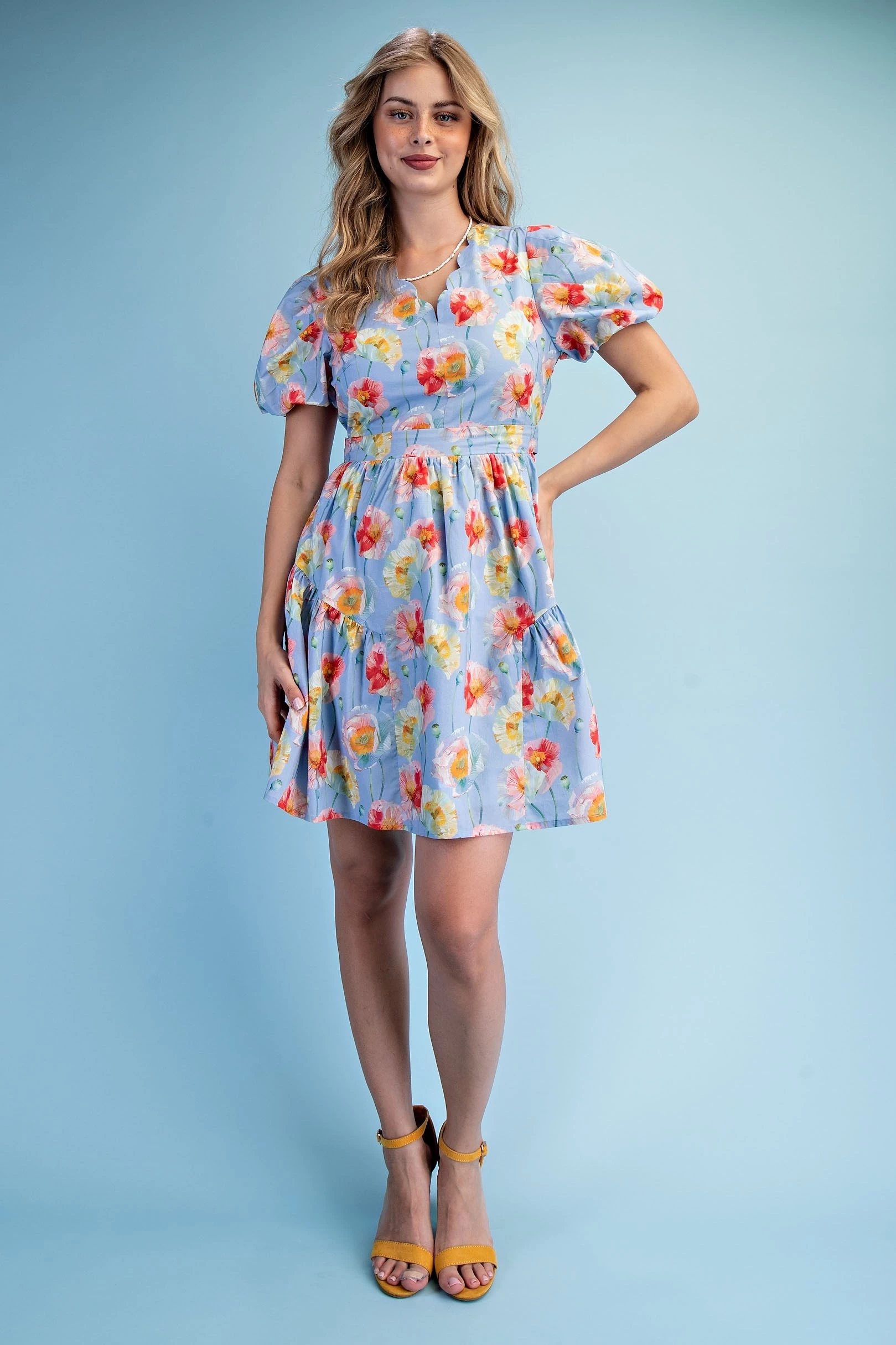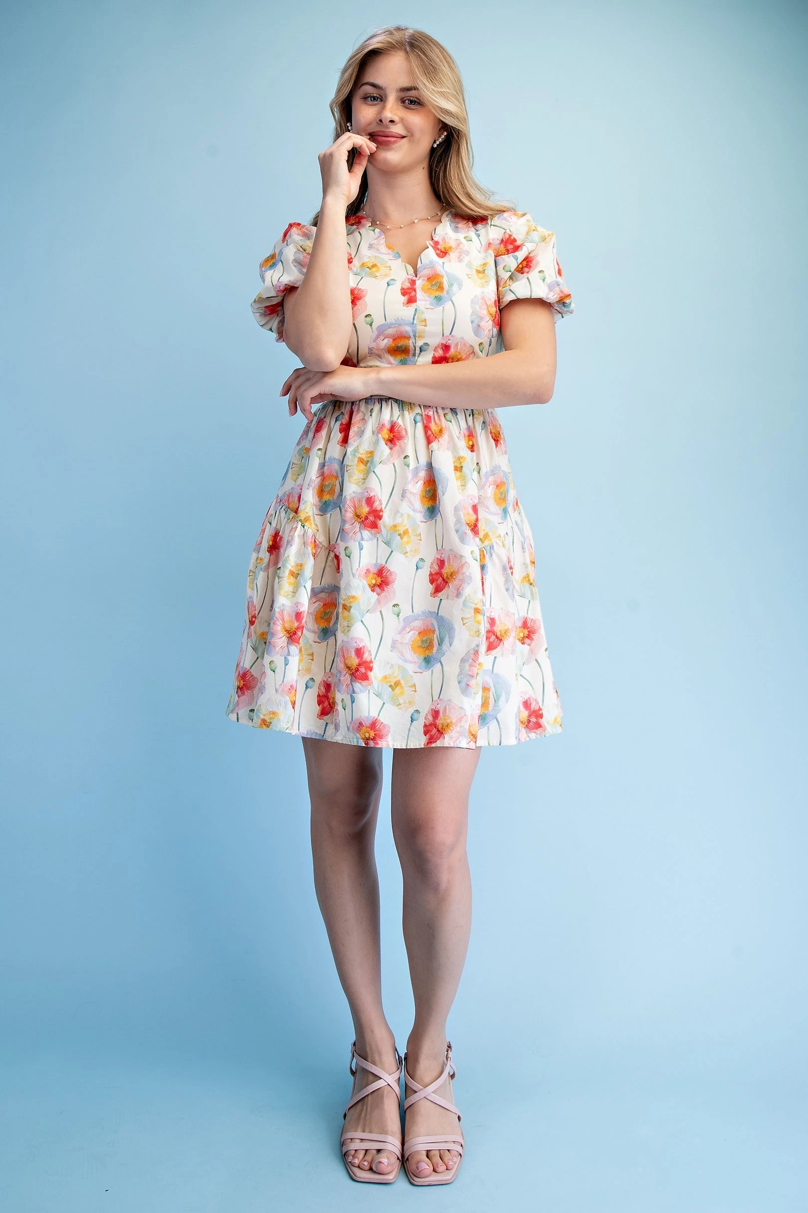 Floral Half Button Dress with a Smocked Neck and Trim Detail at Waist. The Dress is Lined