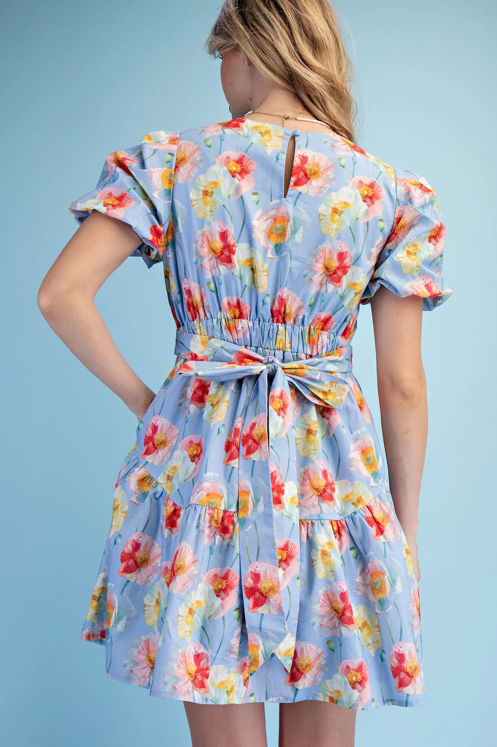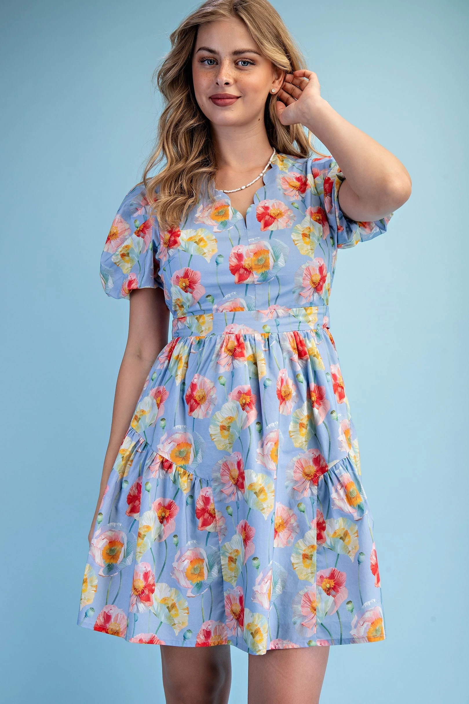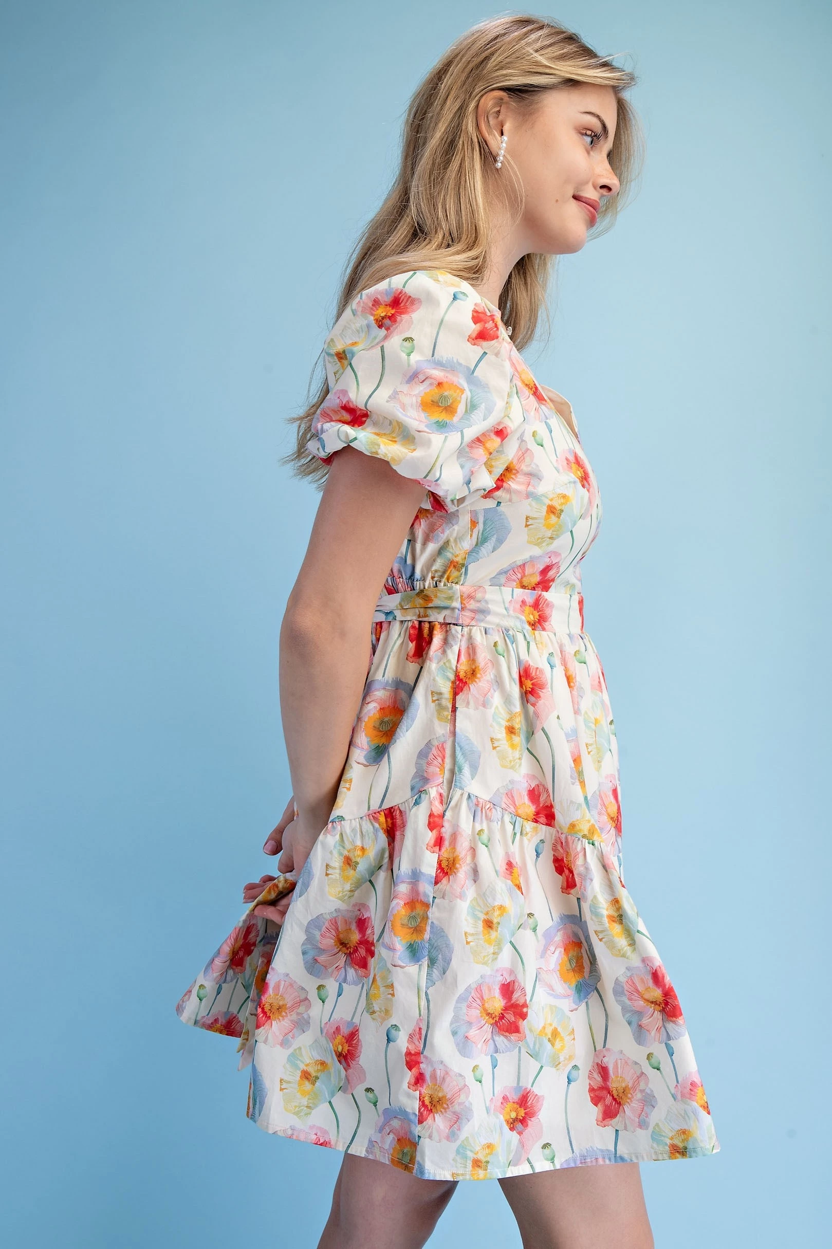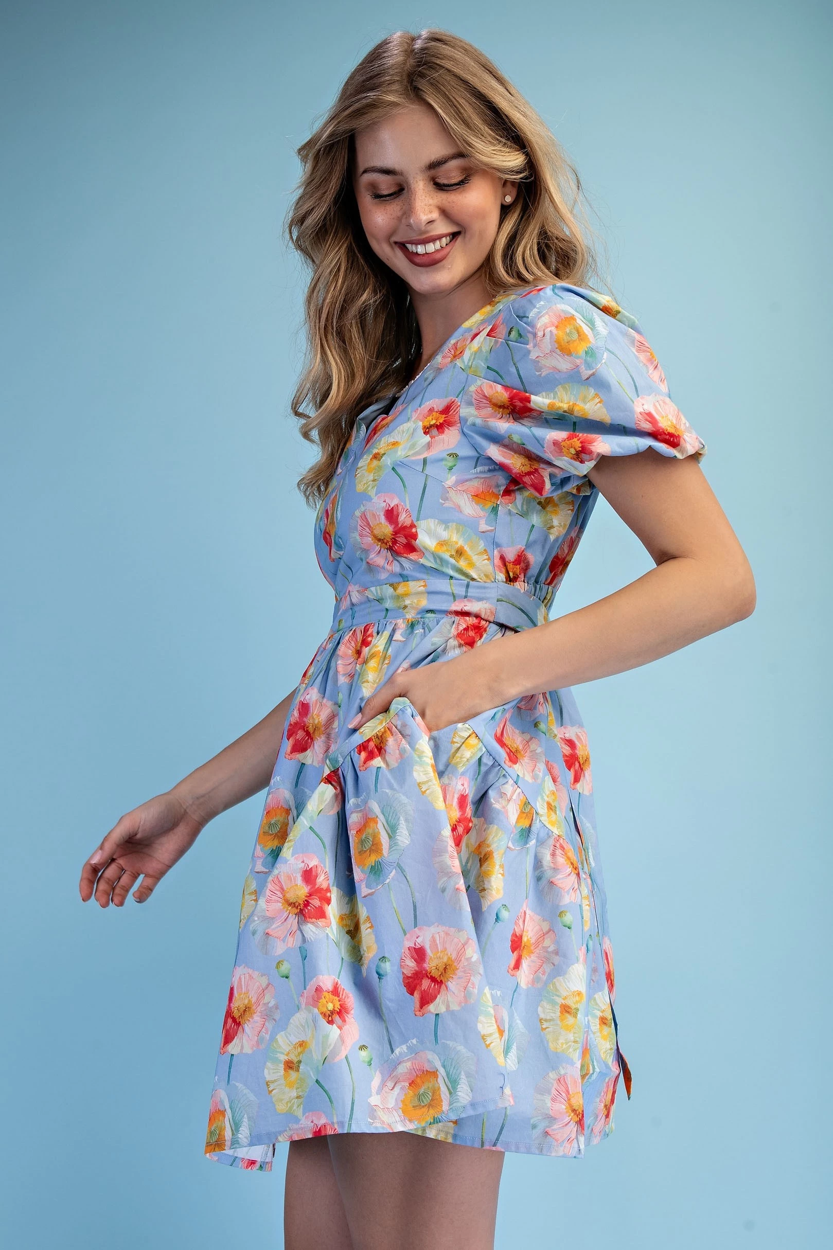 Floral Half Button Dress with a Smocked Neck and Trim Detail at Waist. The Dress is Lined