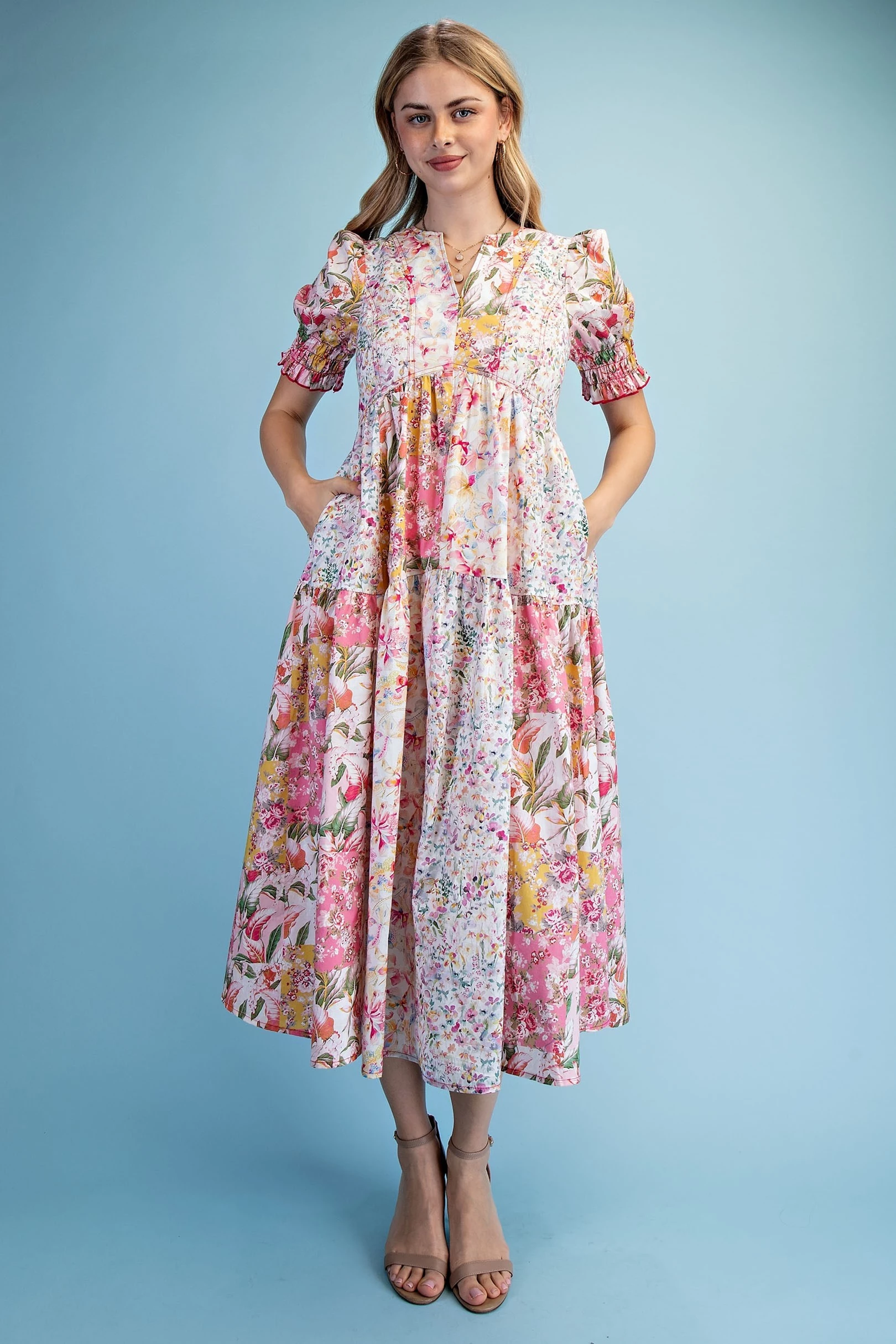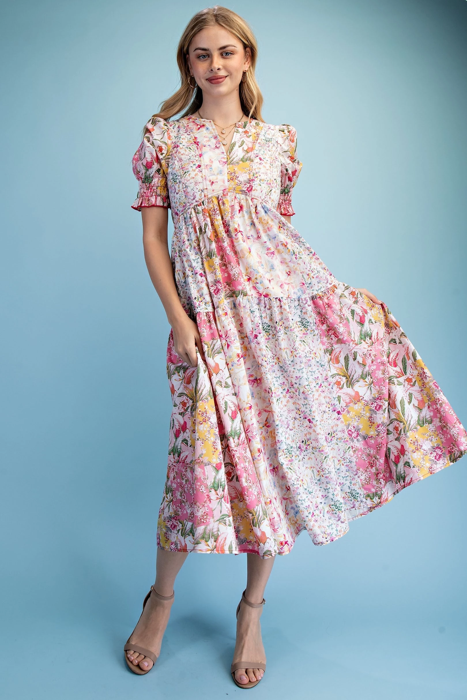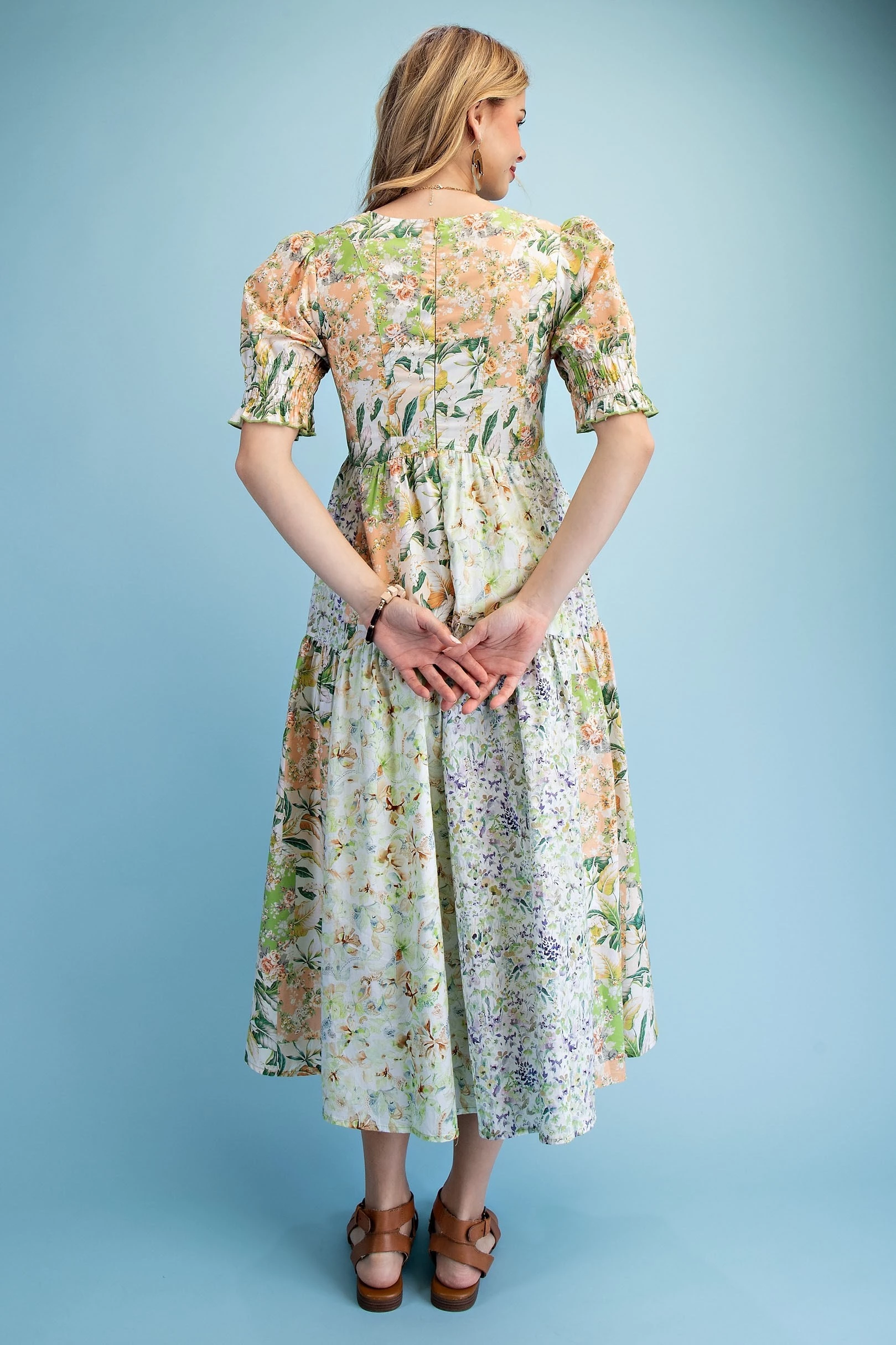 Mixed Print Tiered Midi Dress with Ruffle Neck
