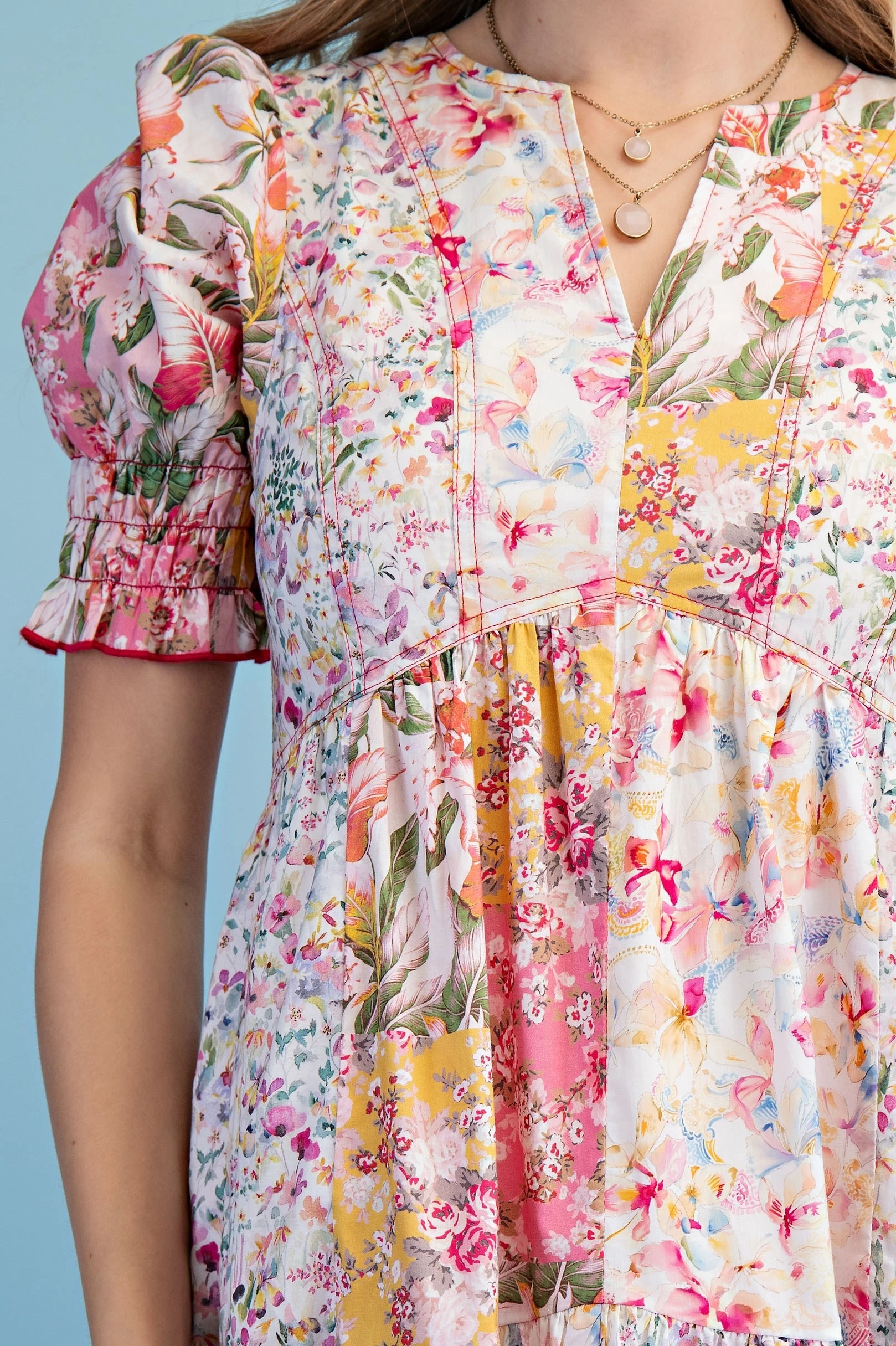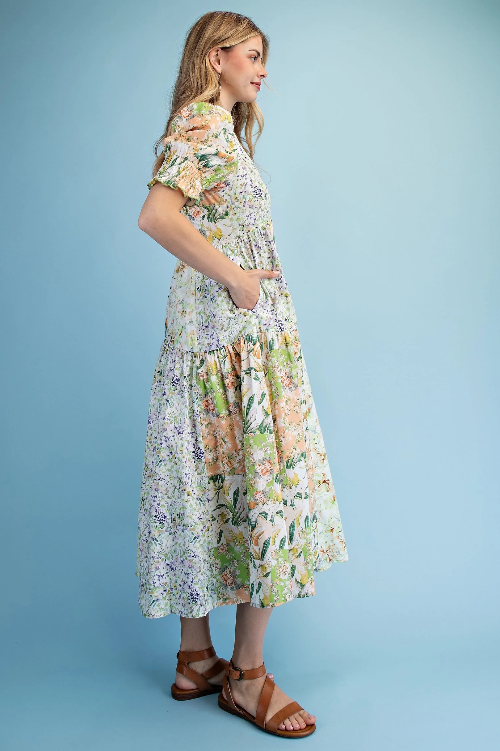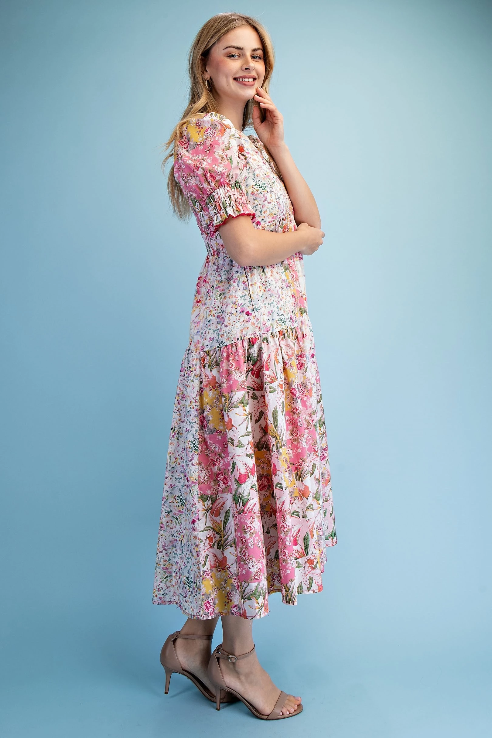 Mixed Print Tiered Midi Dress with Ruffle Neck