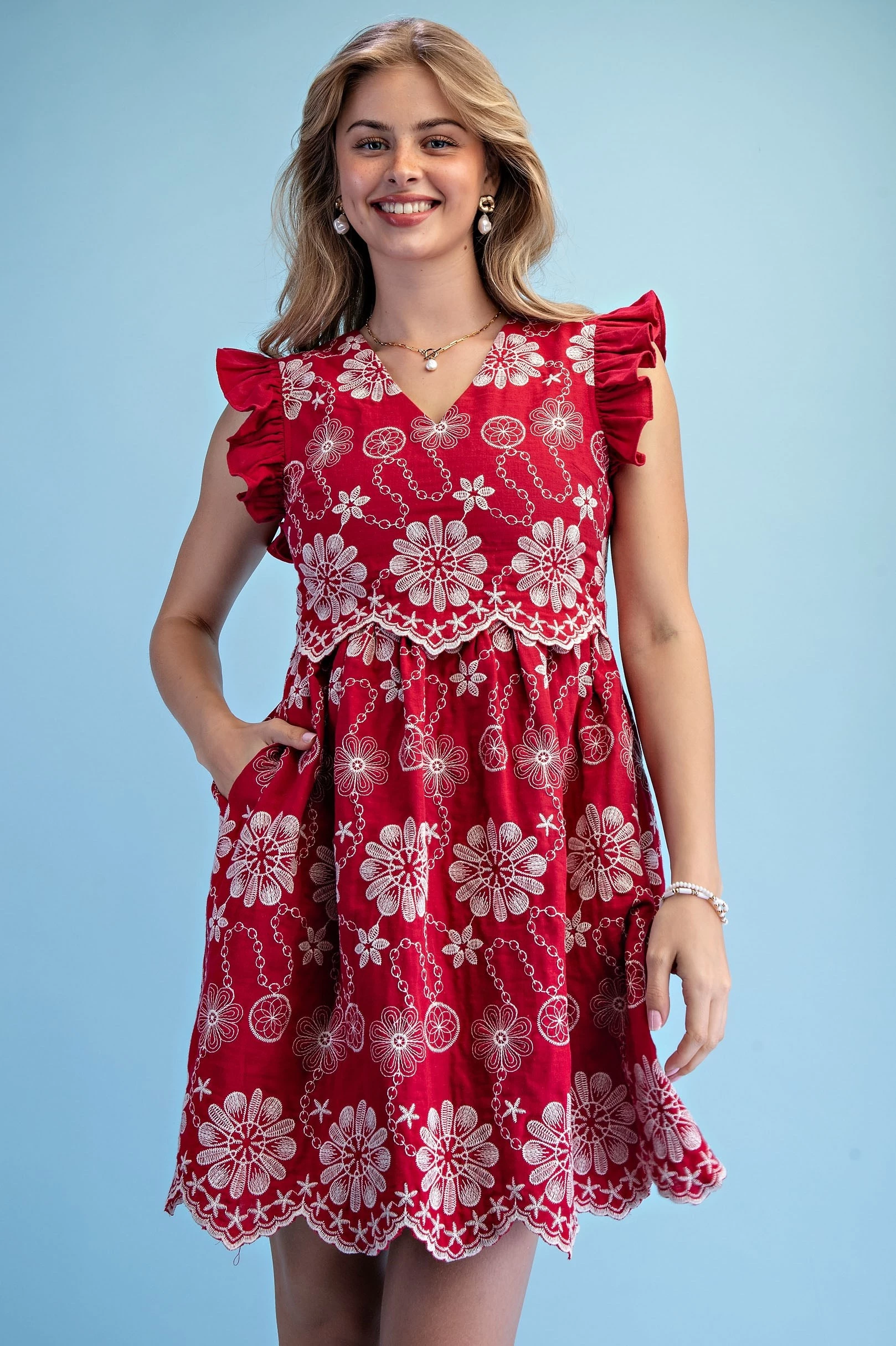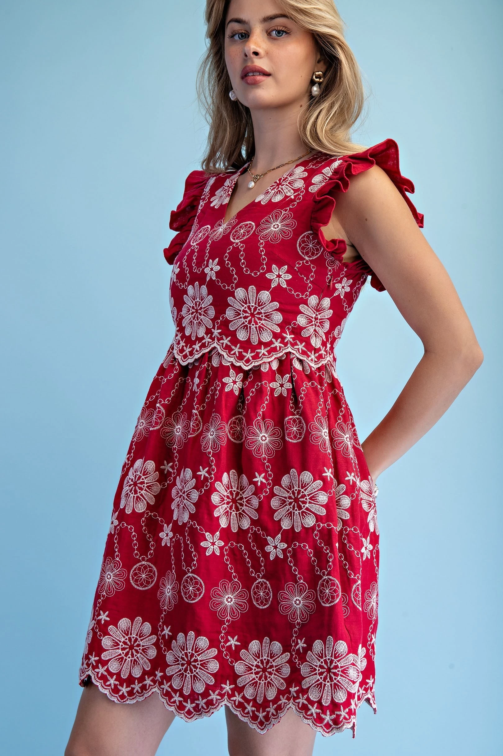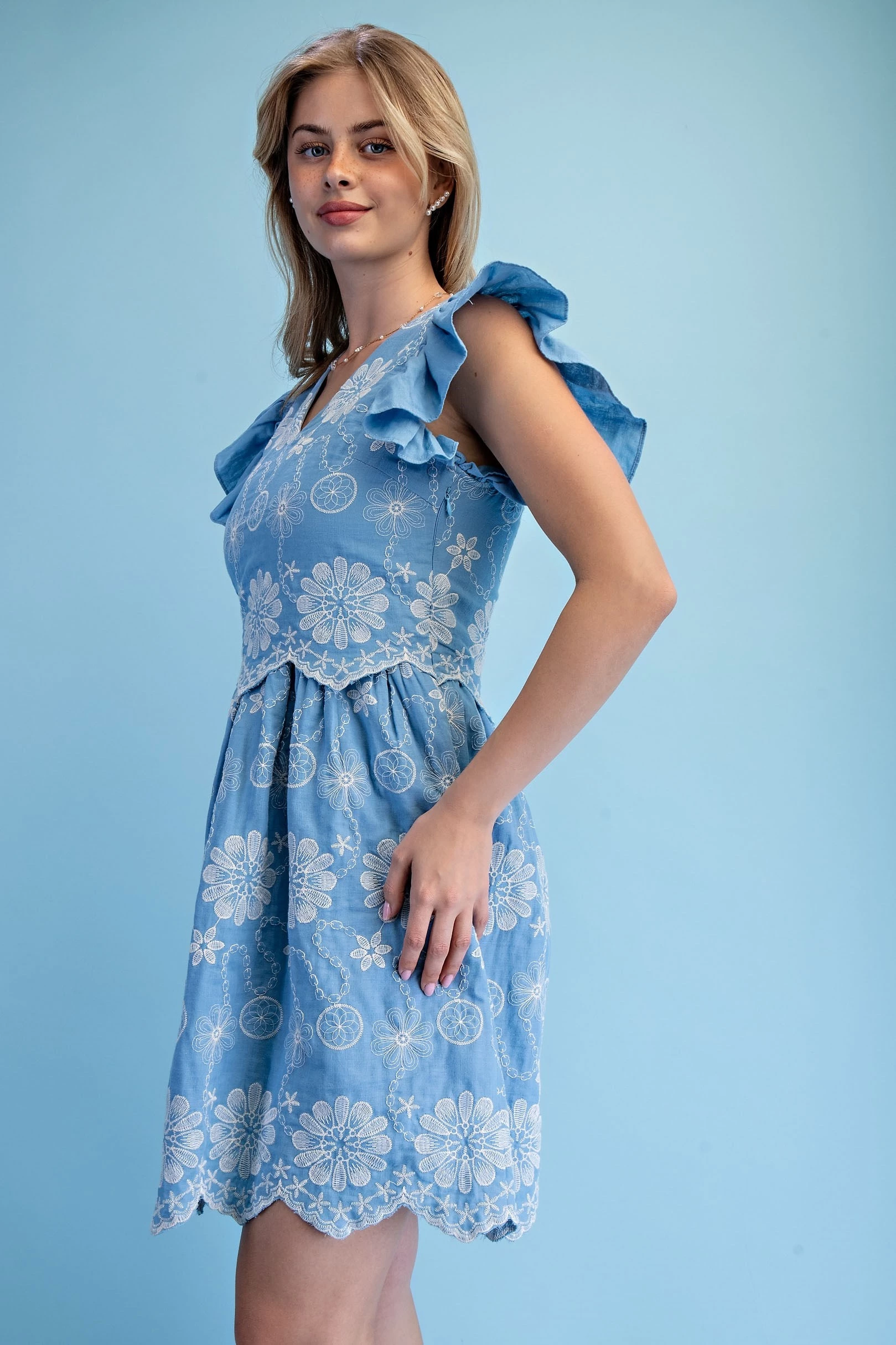Embroidered V-Neck Dress with Ruffle Sleeves. The Dress is Lined