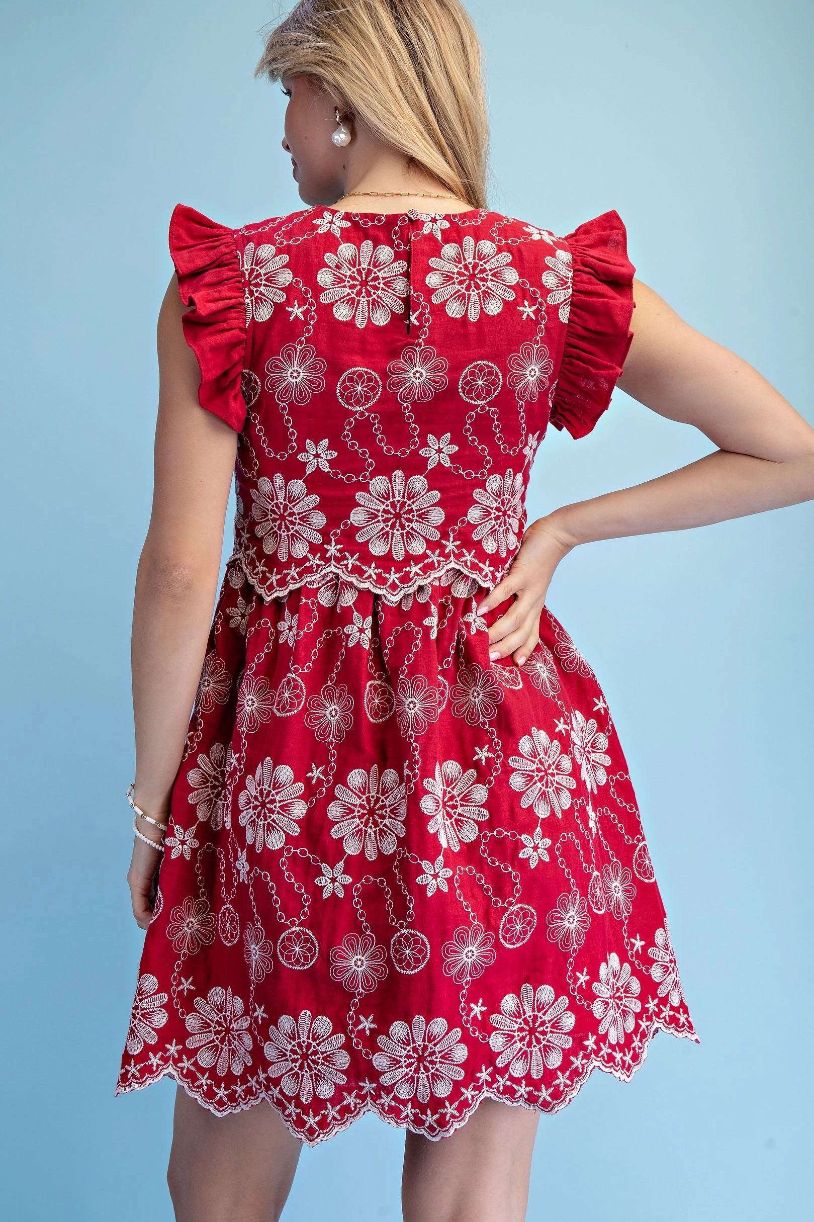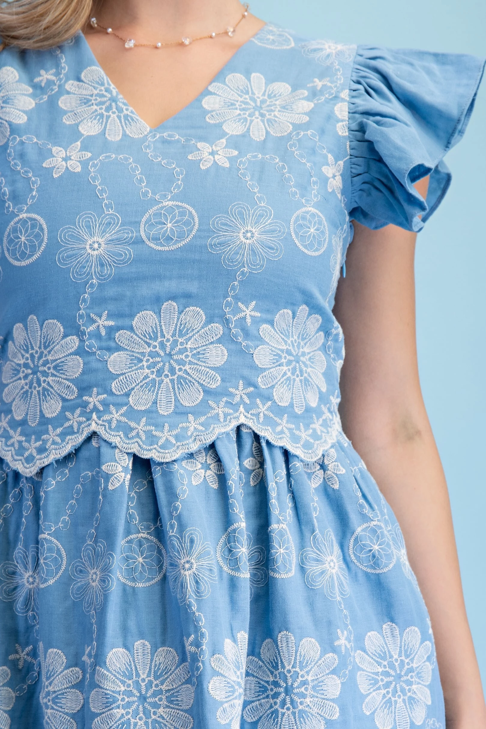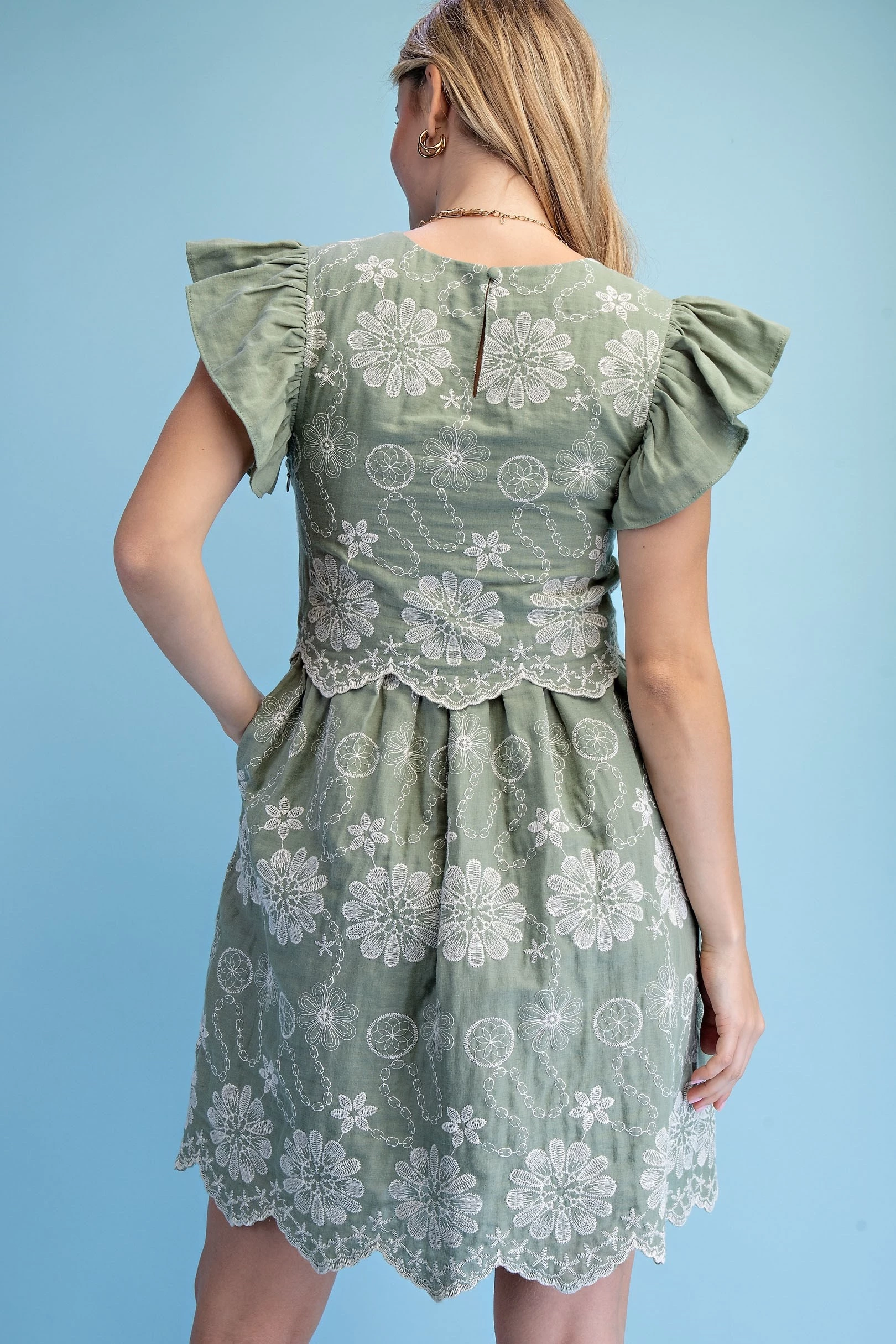 Embroidered V-Neck Dress with Ruffle Sleeves. The Dress is Lined