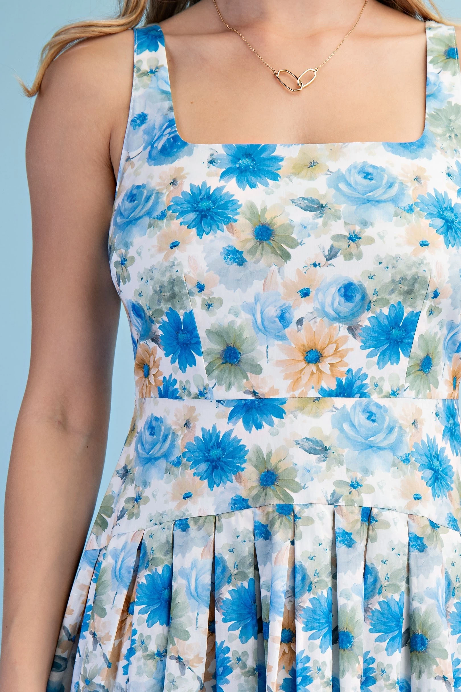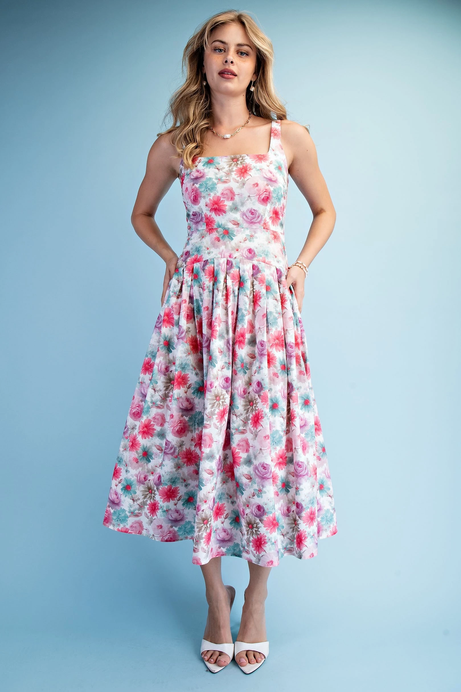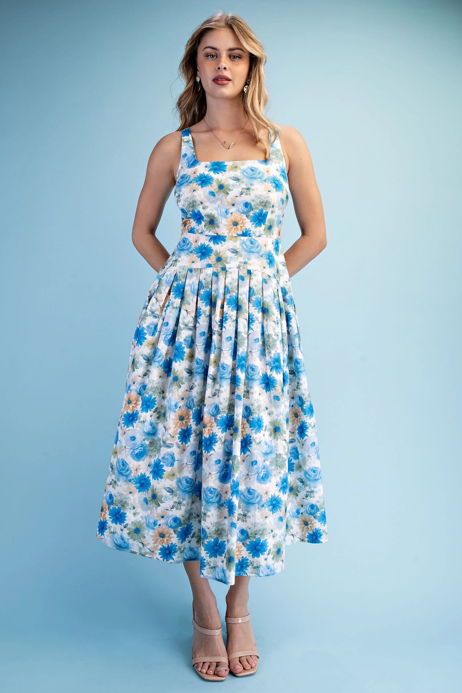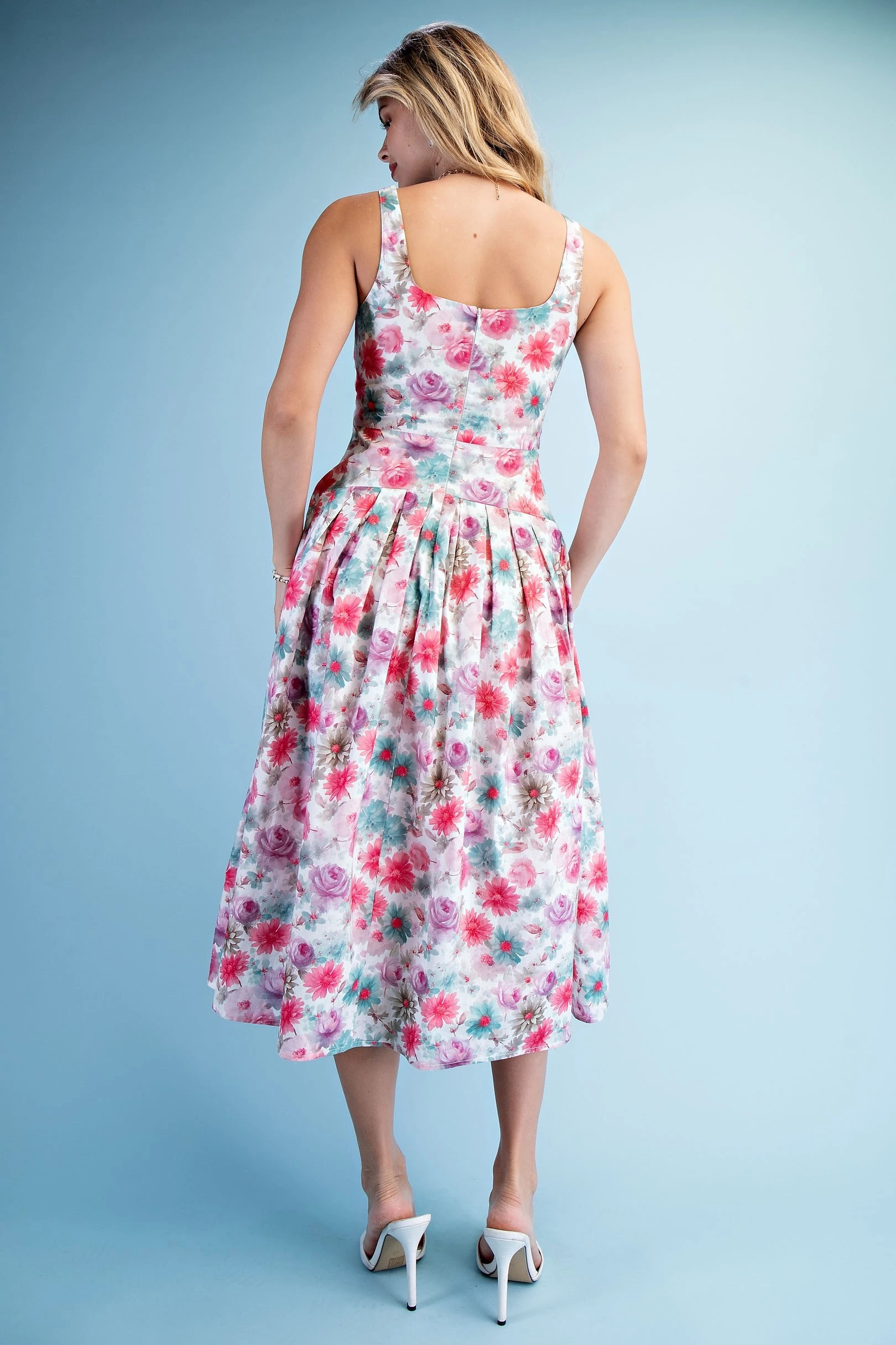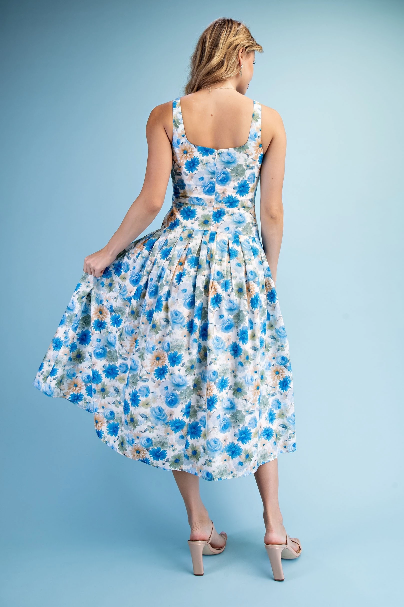 Printed Sleeveless Fit and Flare Midi Dress with a Scoop Back and Invisible Zipper Closure. The Dress is Lined