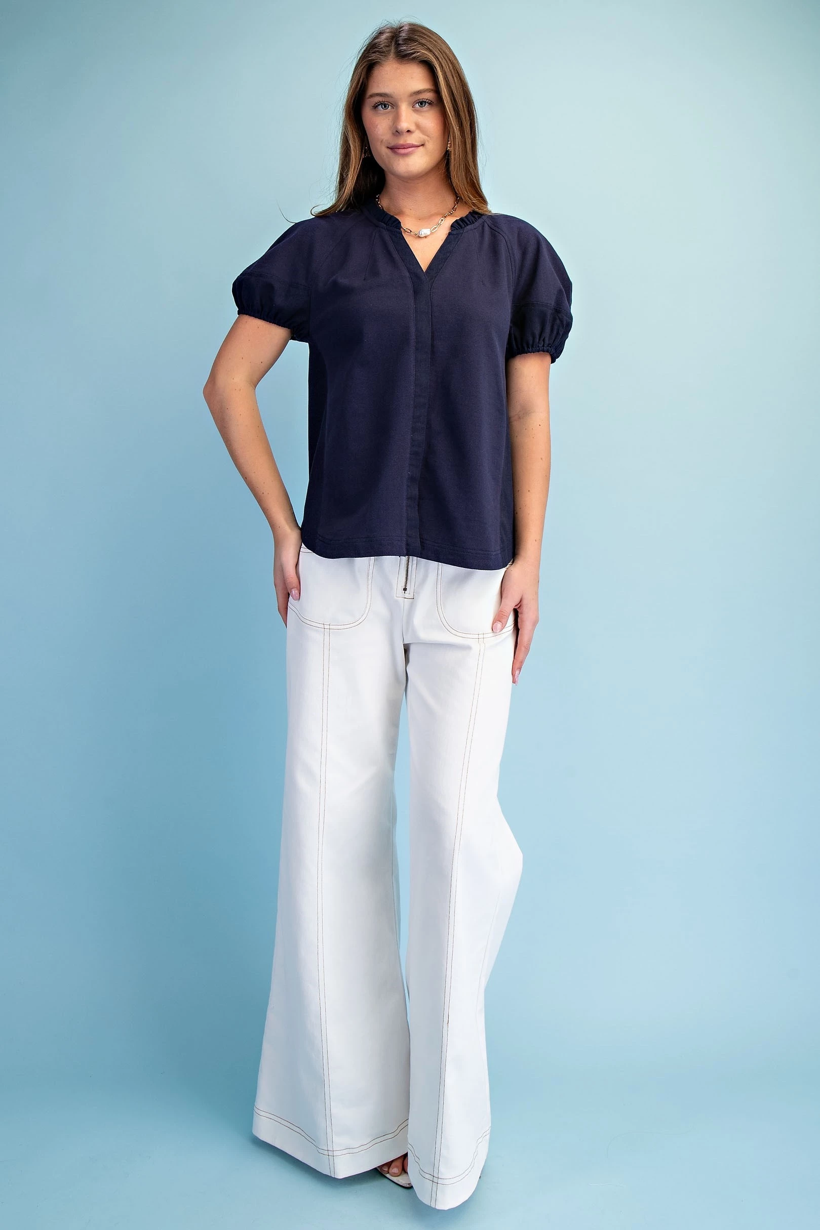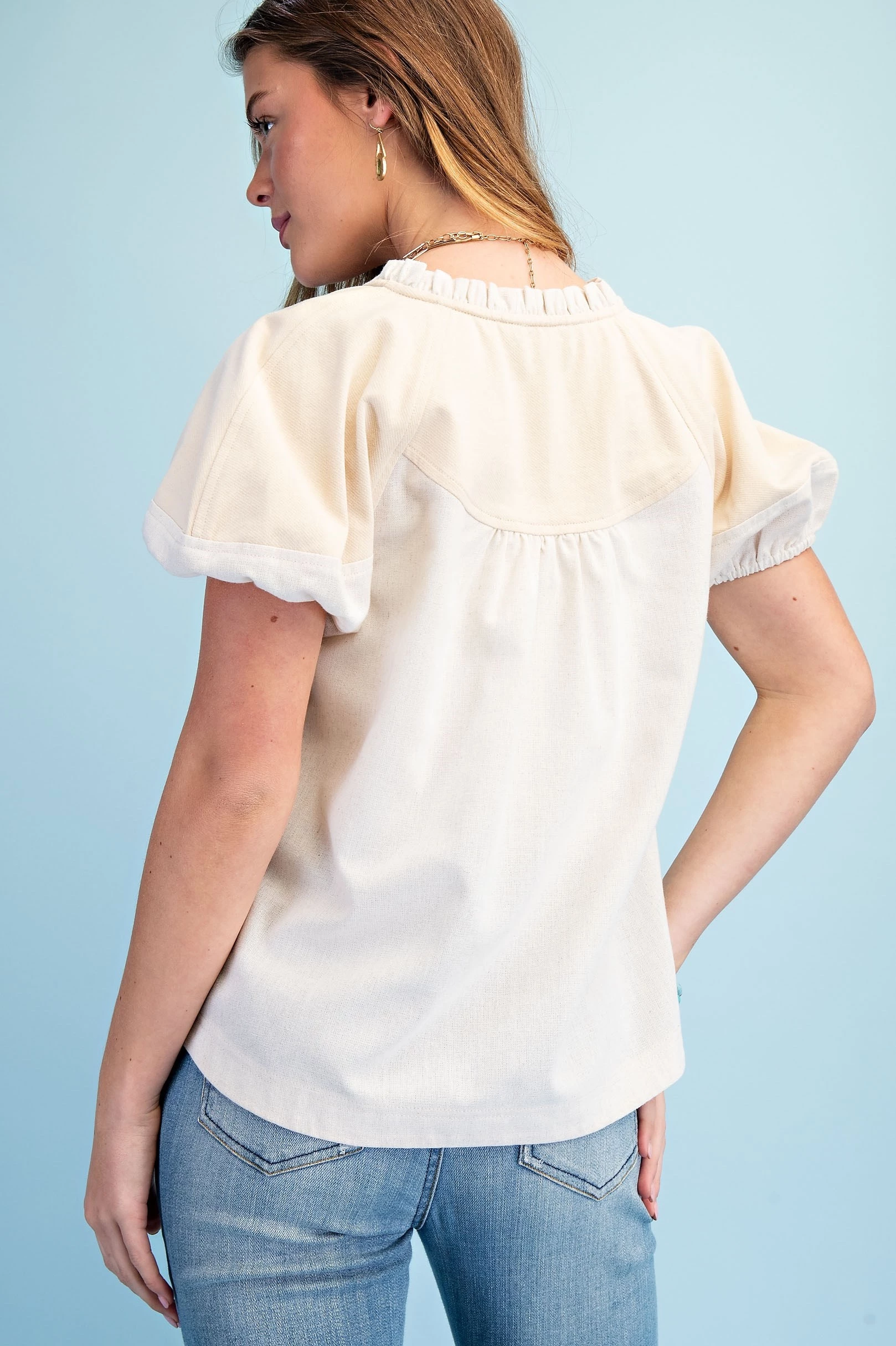 Mixed Material Covered Placket Button Down Blouse with Short Puff Sleeves and a Ruffled Collar