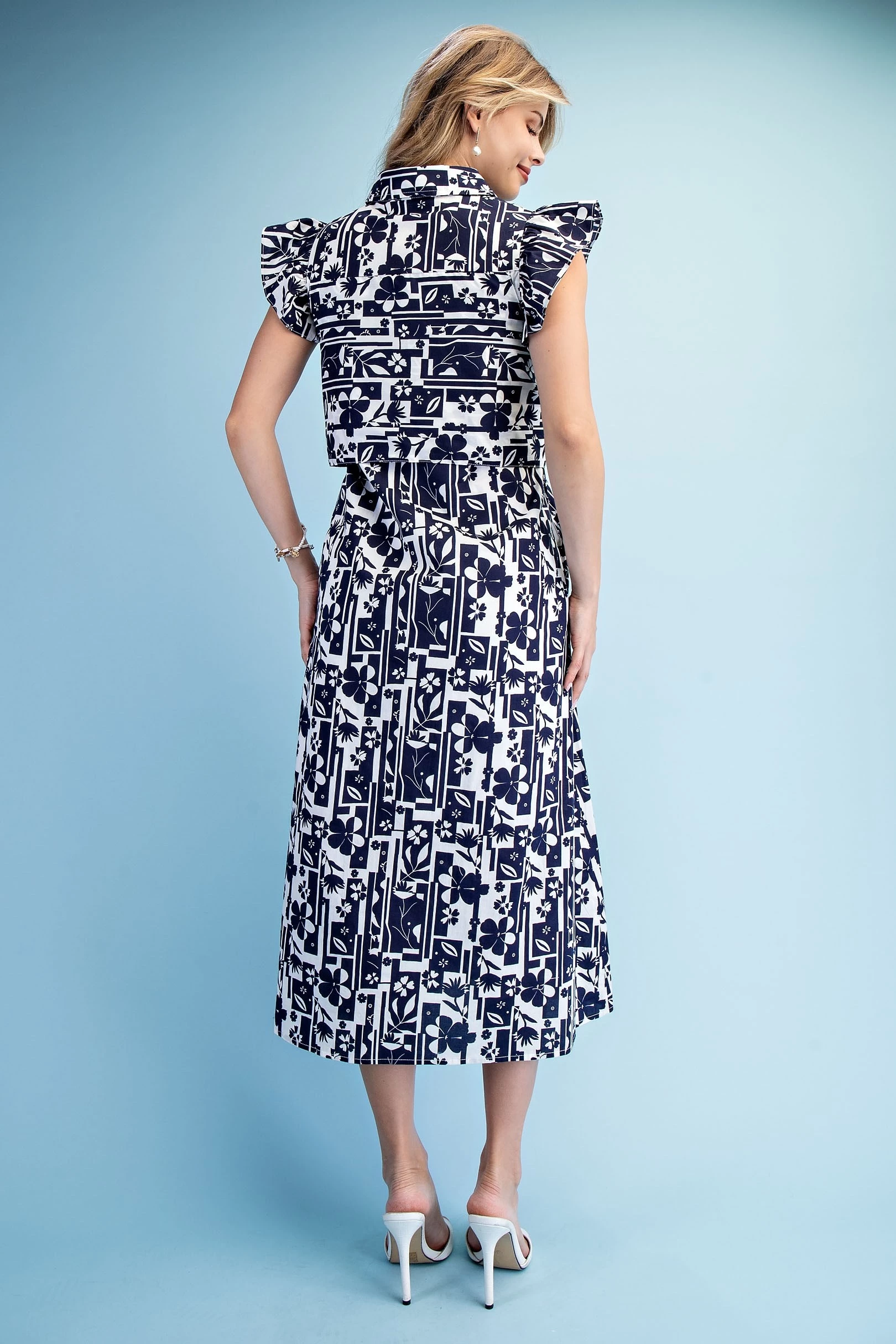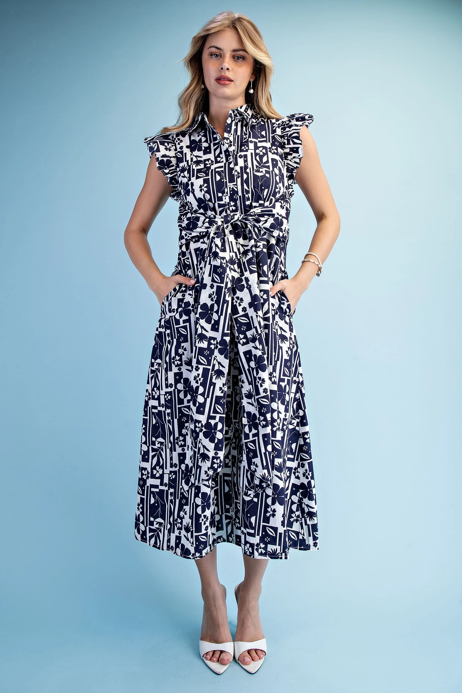 Geometric Floral Print Midi Shirt Dress with Ruffle Sleeves and a Wrap-Style Front Tie Detail. The Dress is Lined