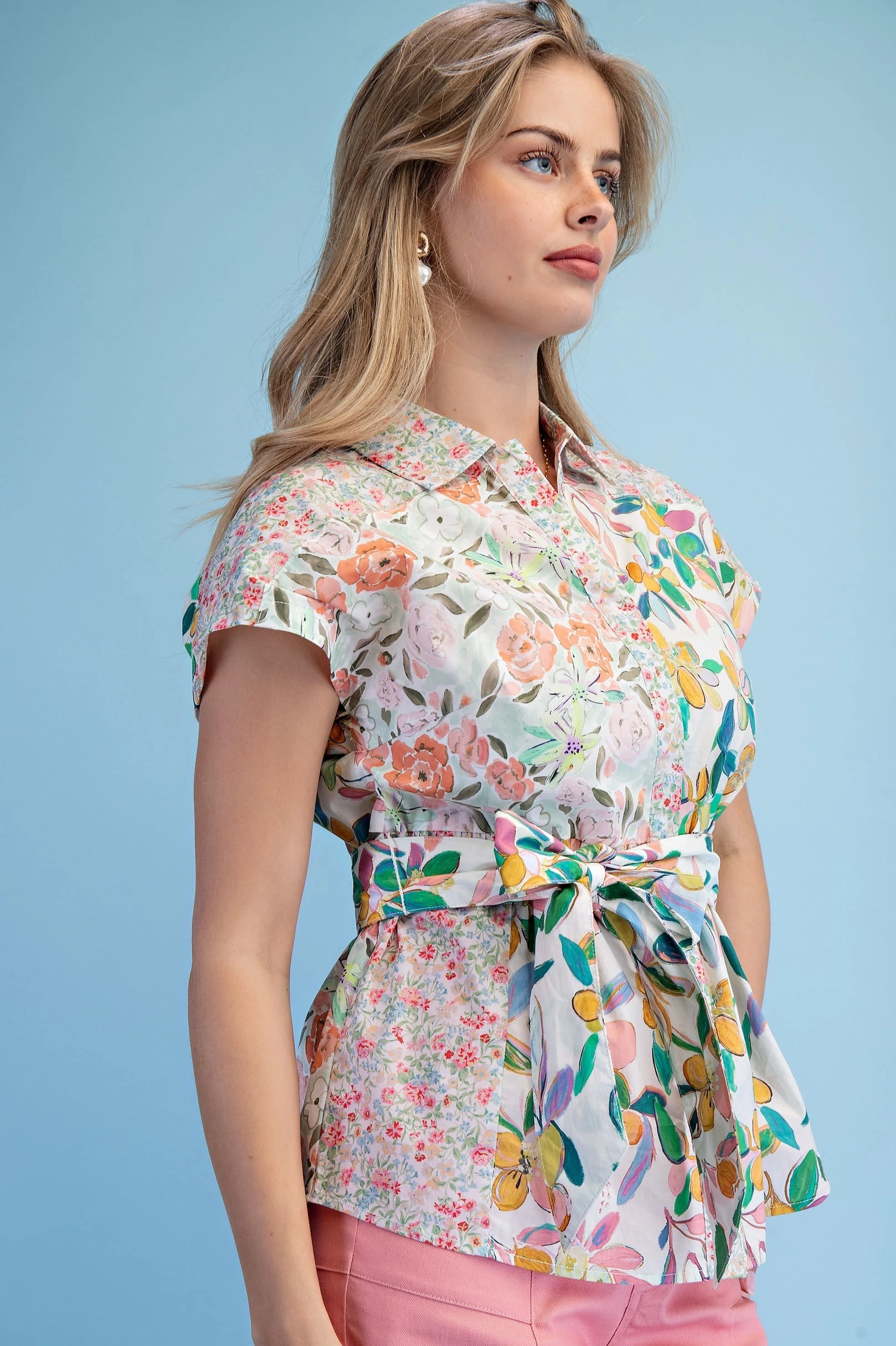 Floral Print Button Down Dress with a Covered Placket and Binding Details. The Dress is Lined