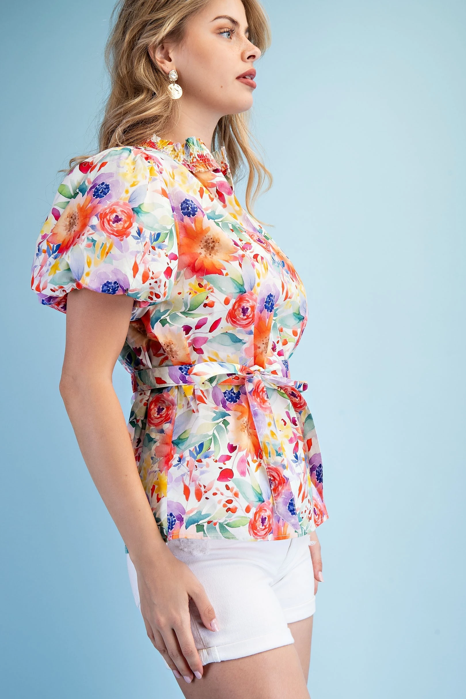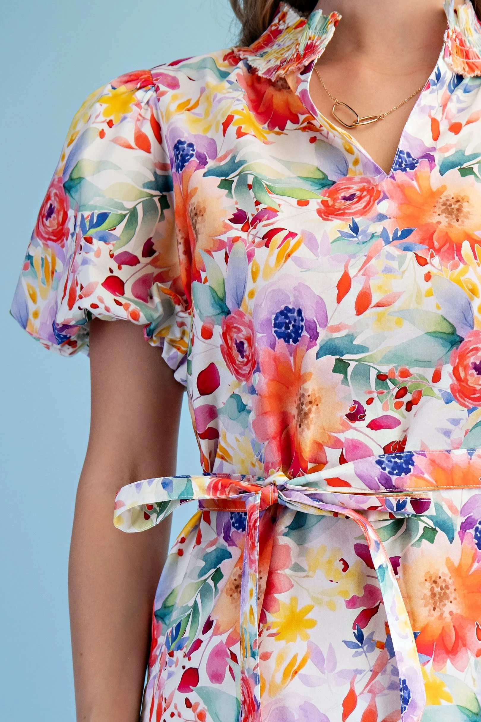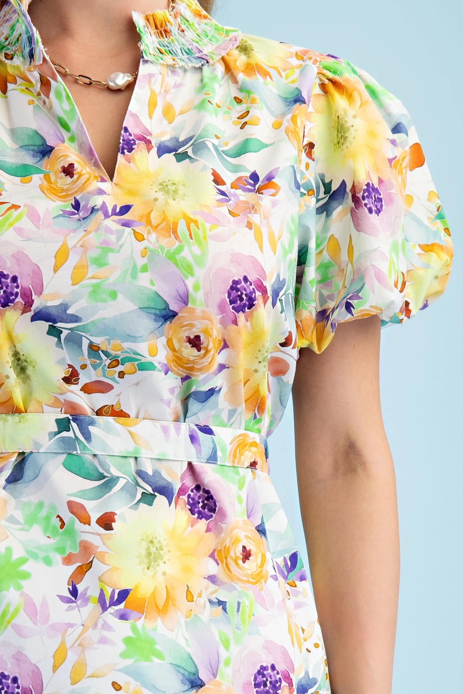 Floral Half Button Dress with a Smocked Neck and Trim Detail at Waist. The Dress is Lined