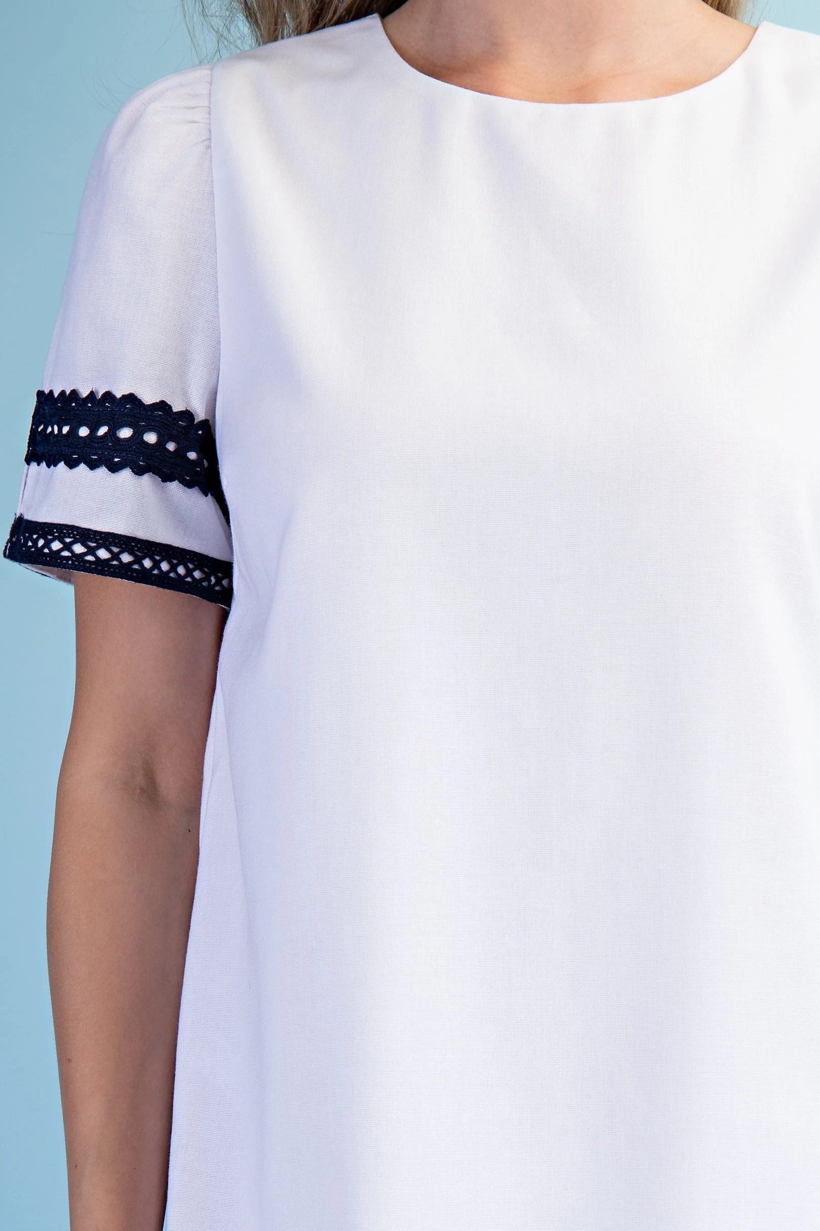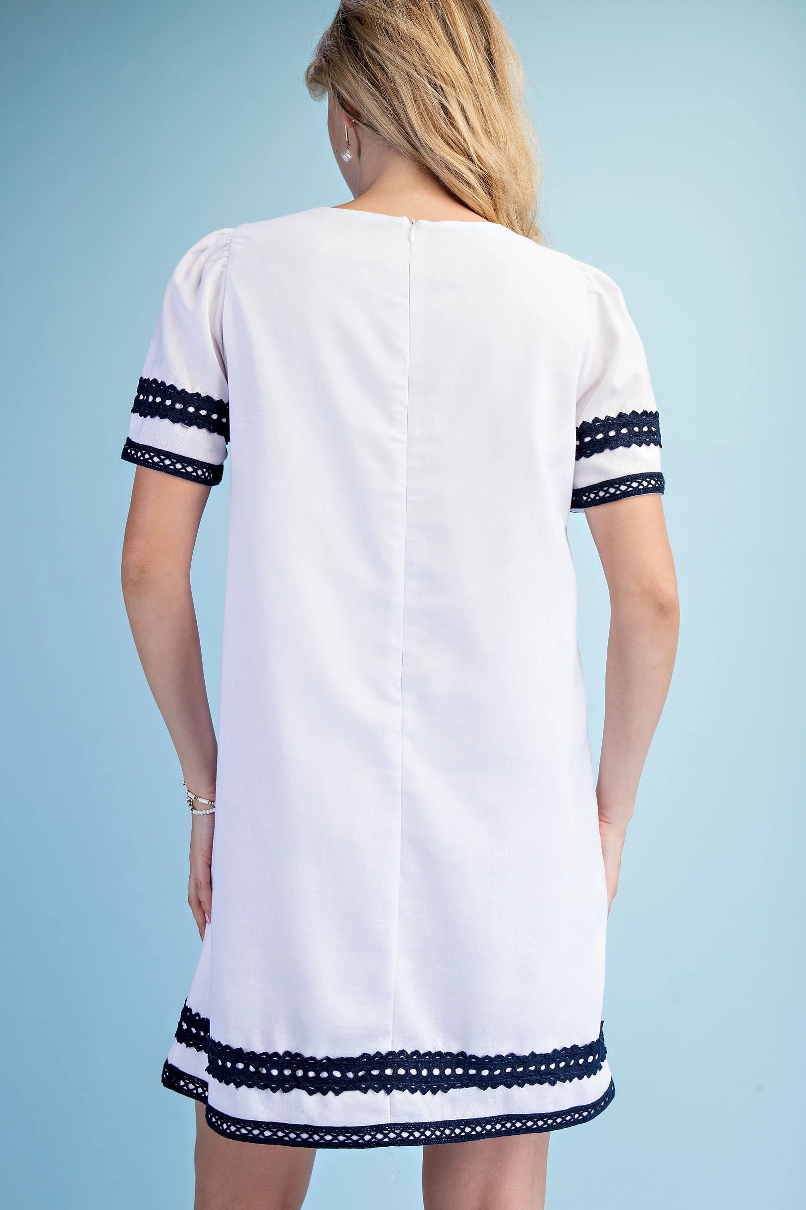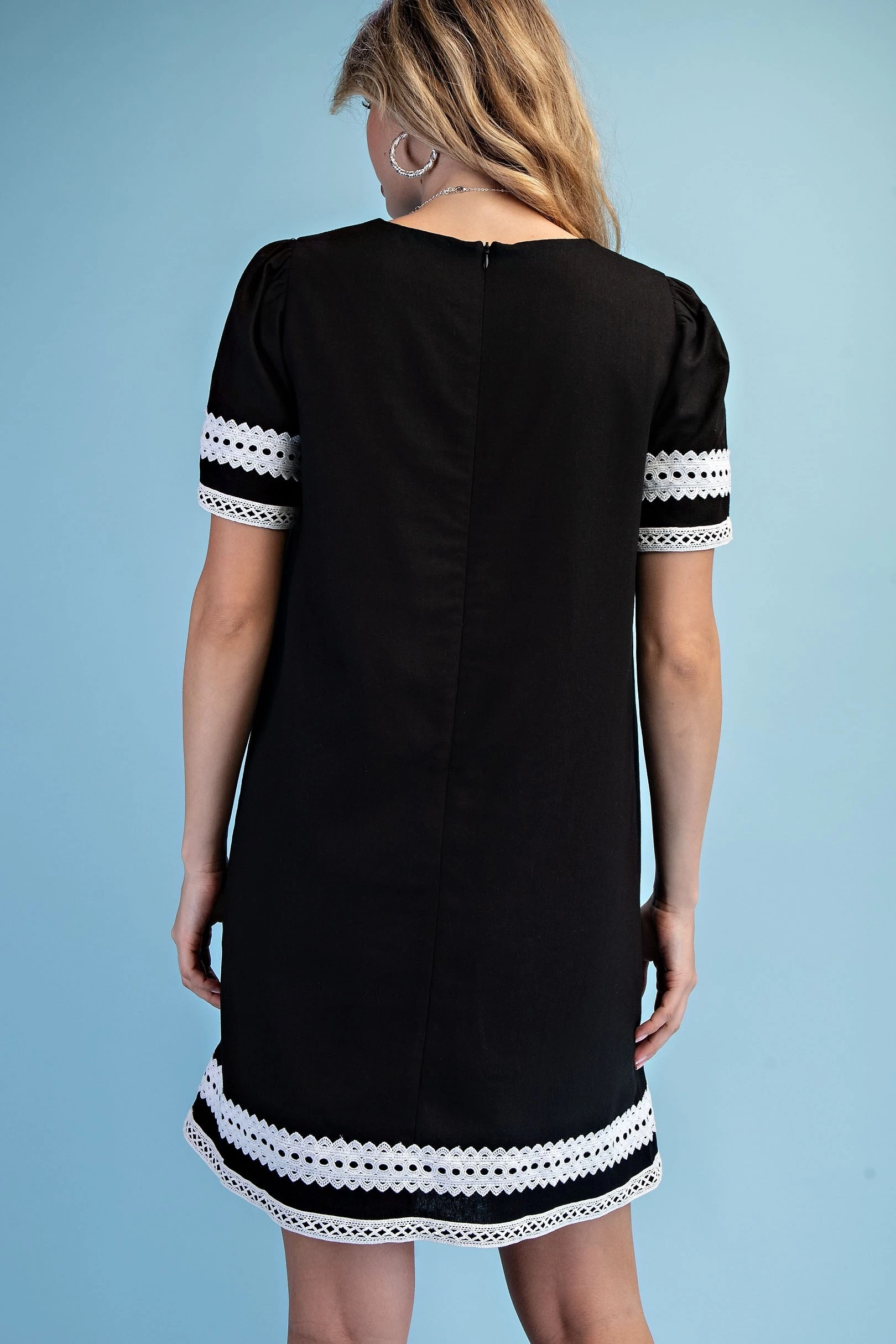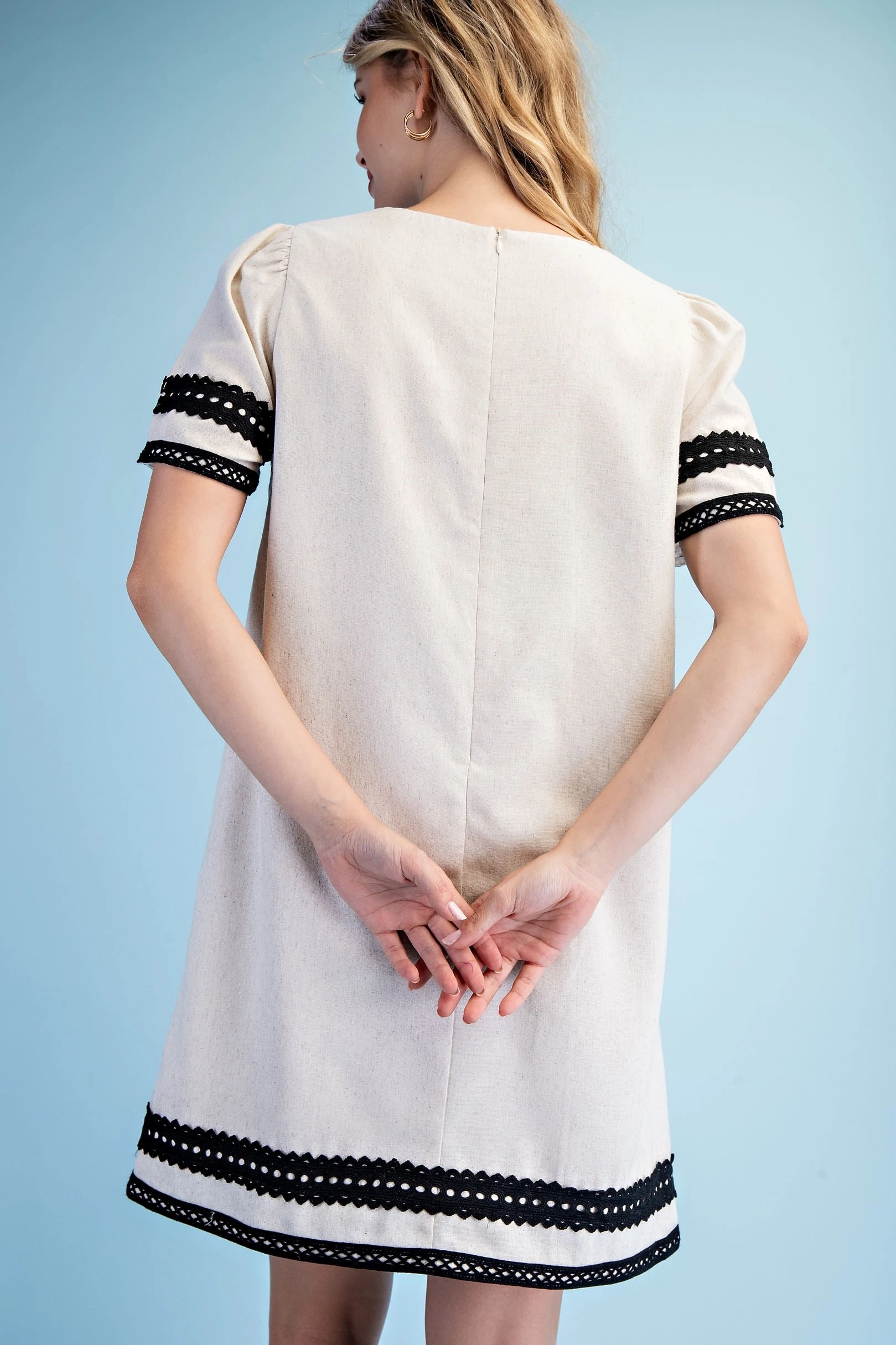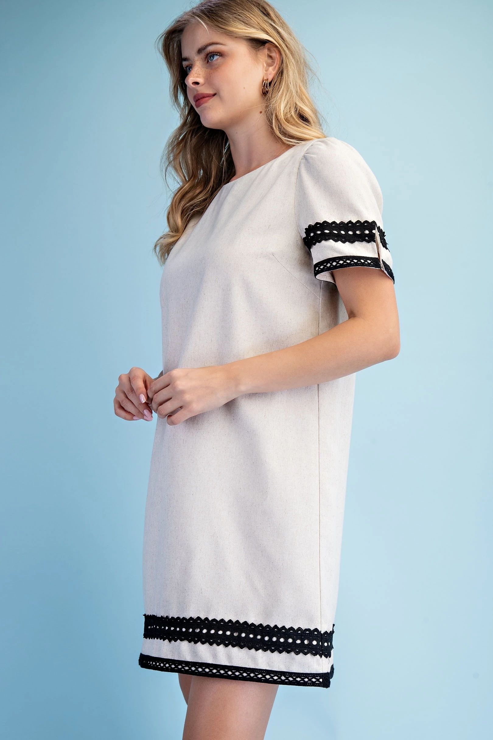 Linen Round Neck Dress with Contrasting Lace Trim Details and a Loop Button Closure on the Arms. The Dress is Lined