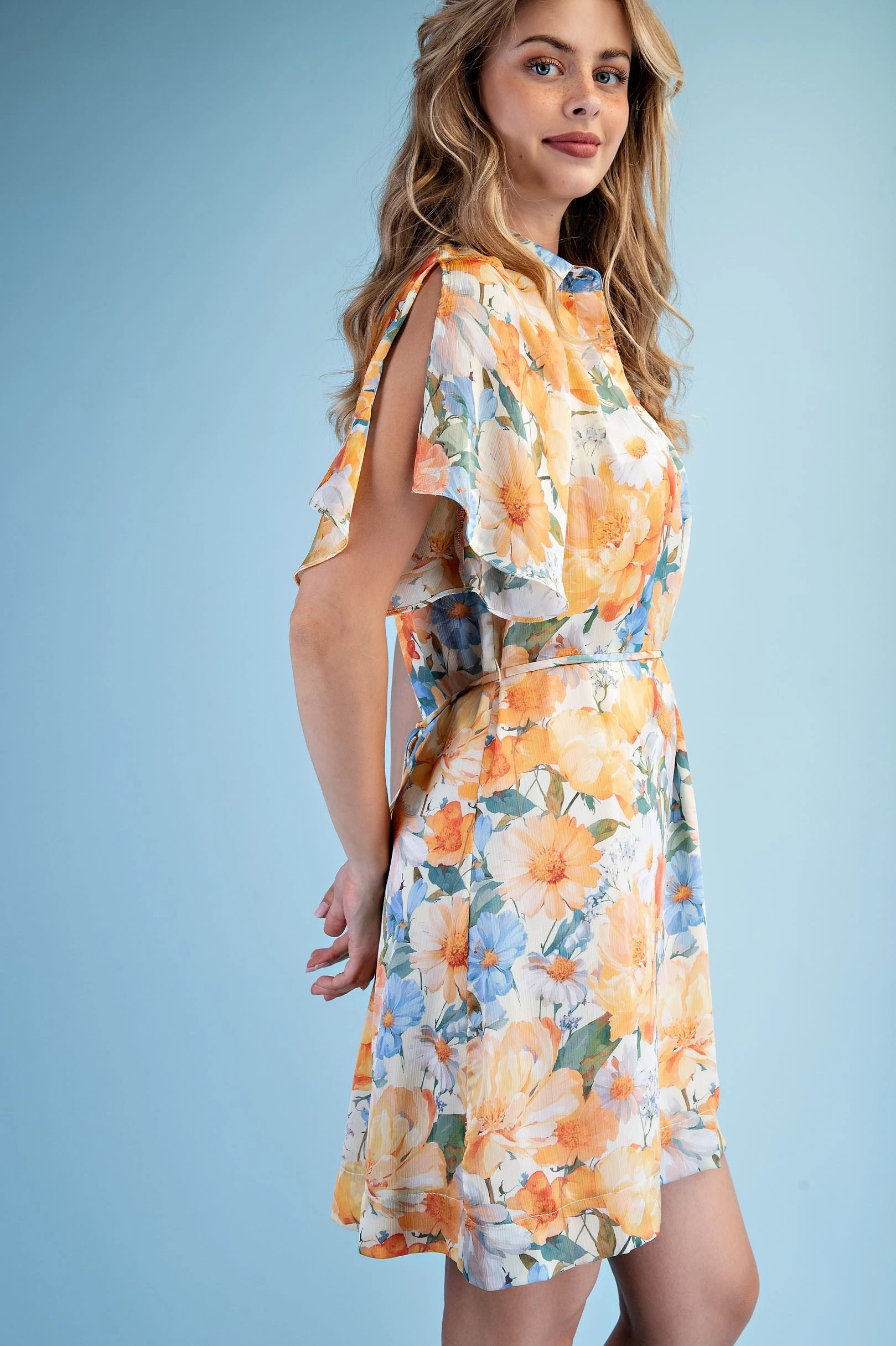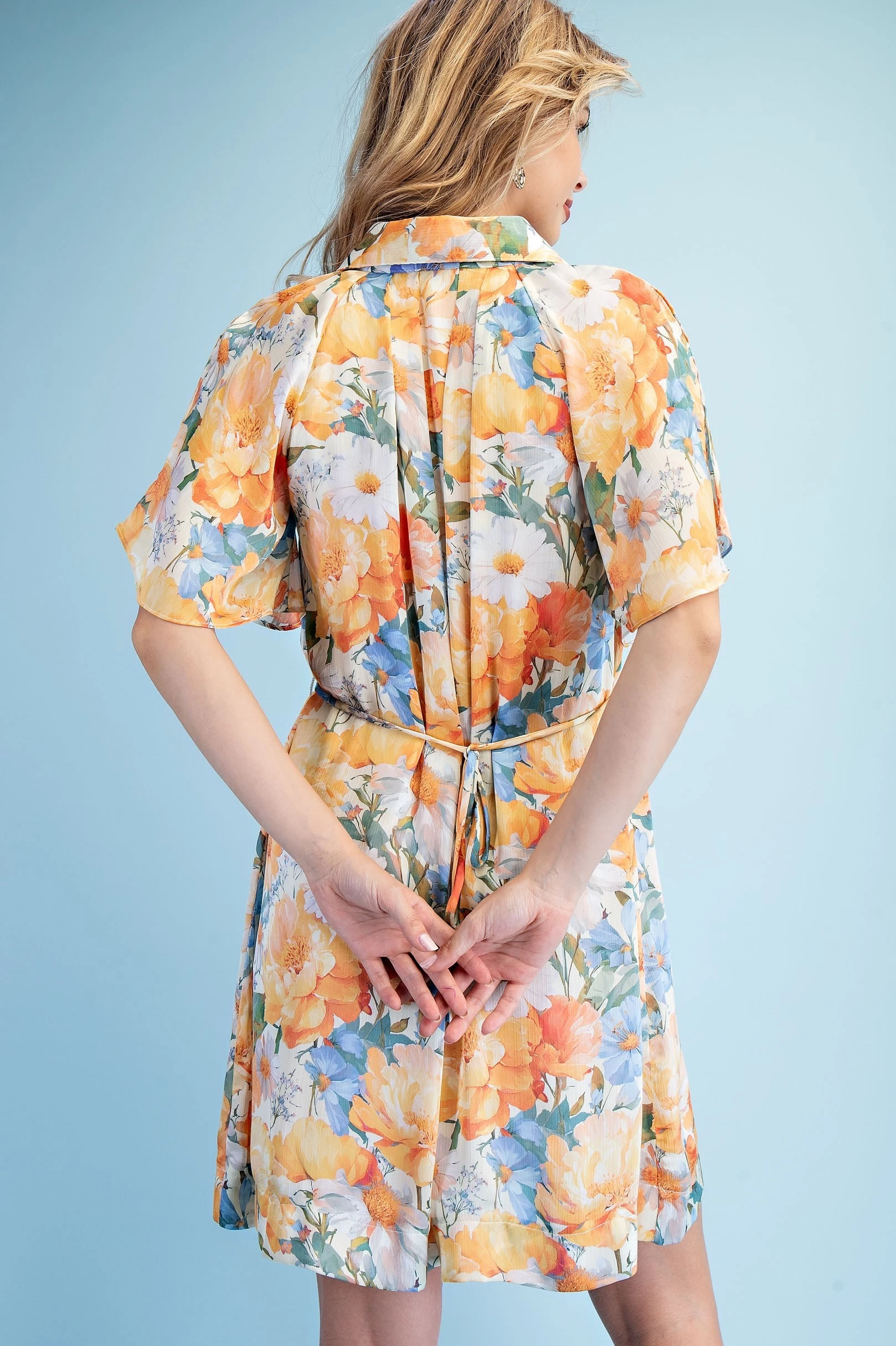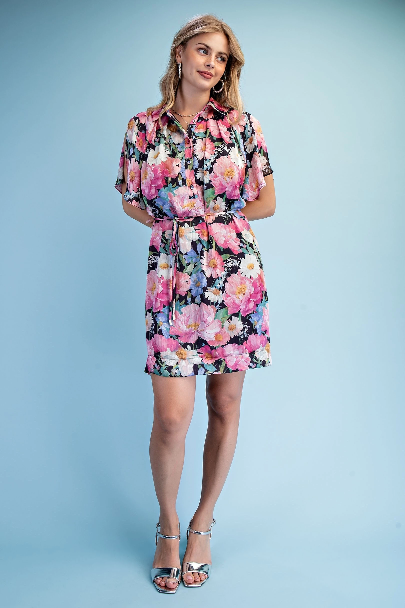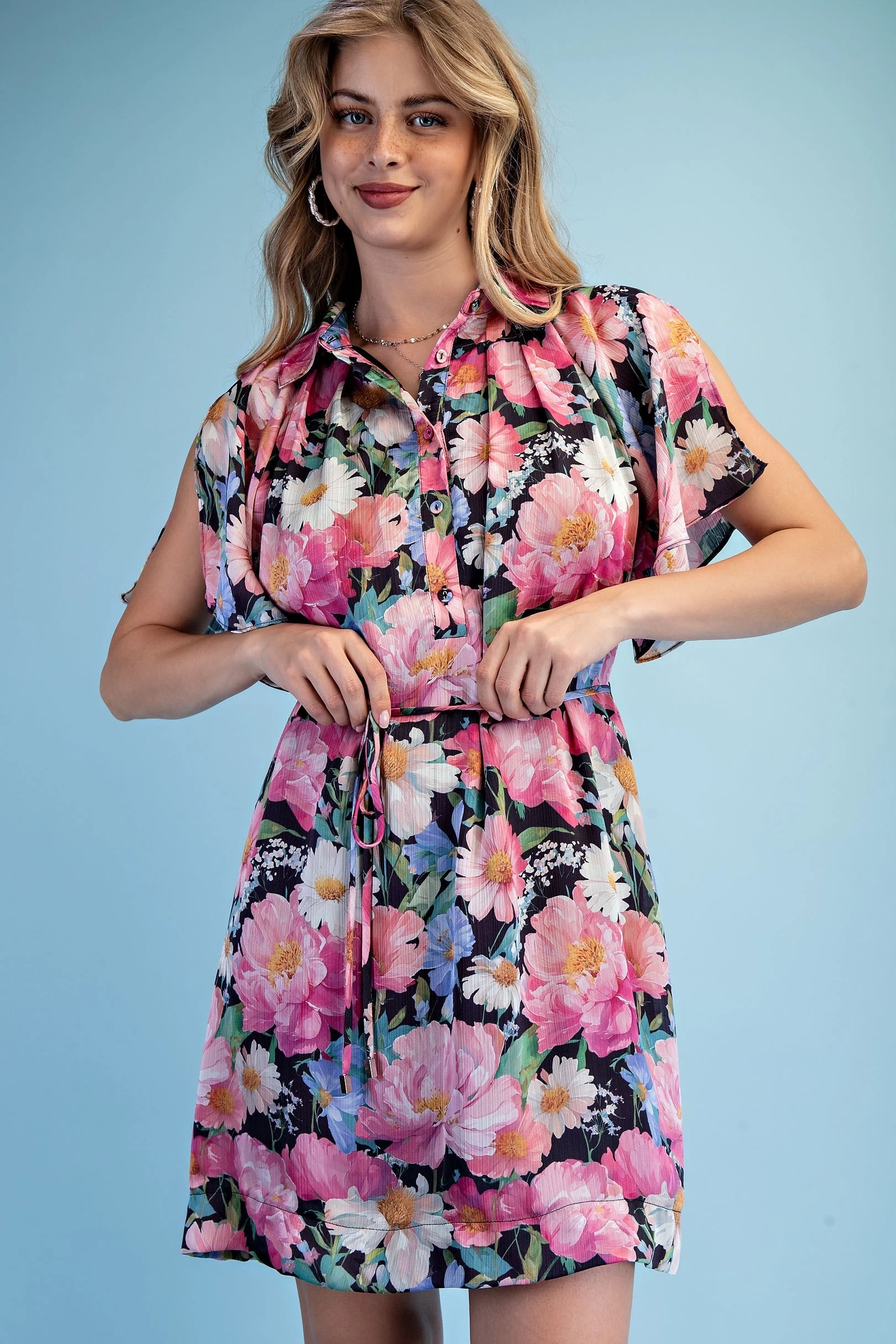 Floral Half Button Mini Shirt Dress with a Split Flutter Sleeve and Waist Tie. The Dress is Lined