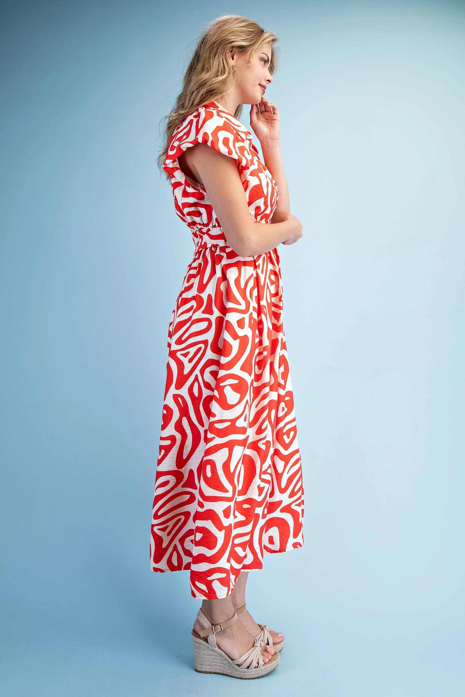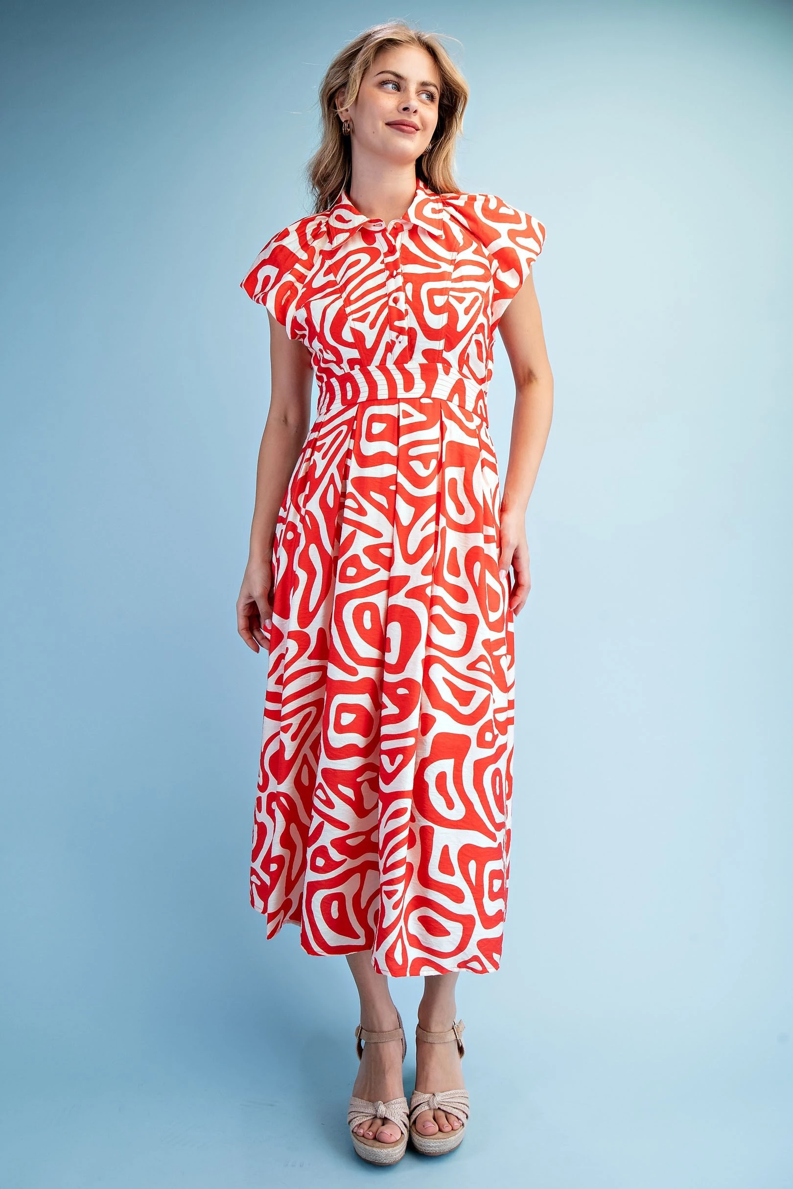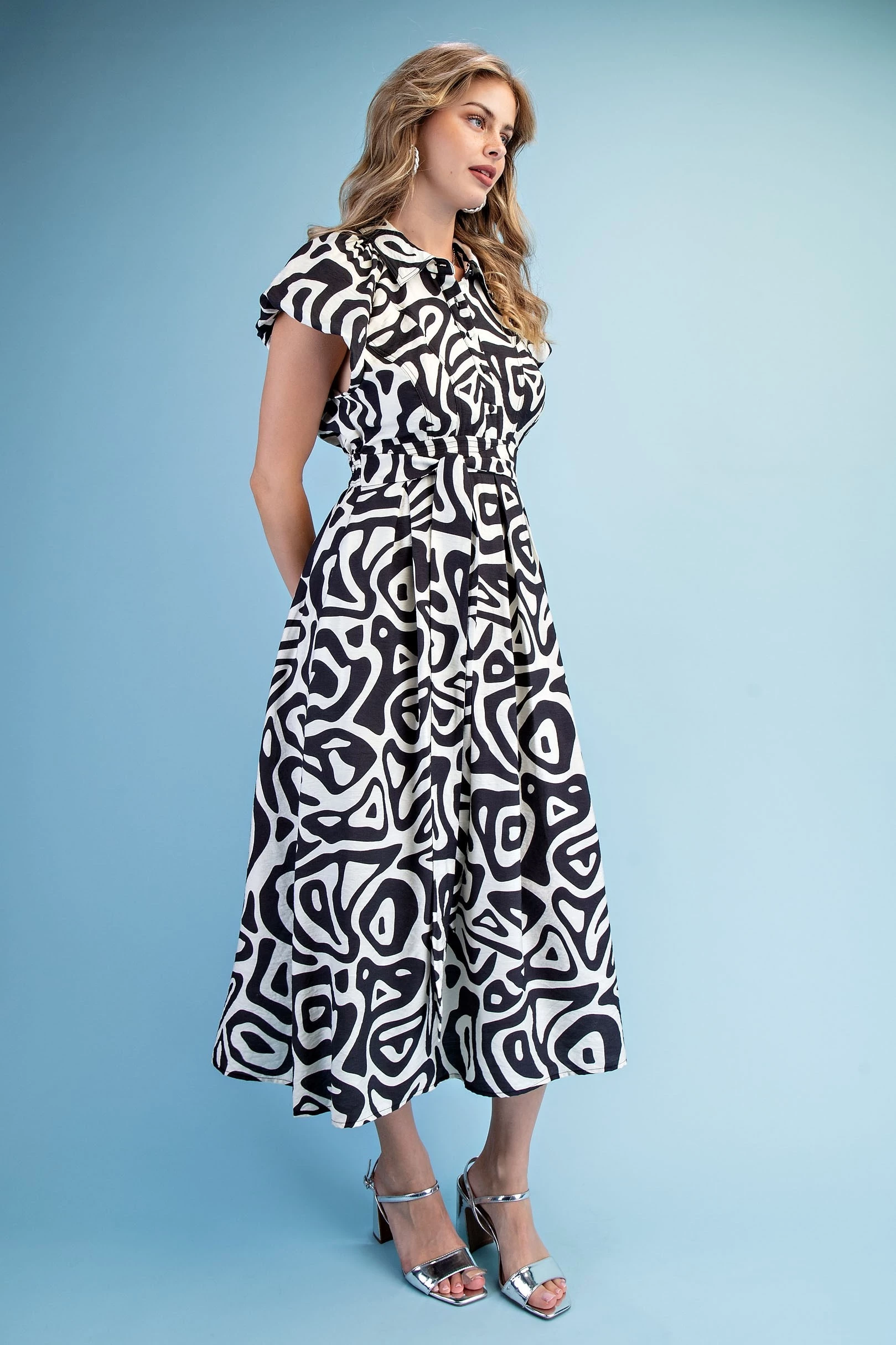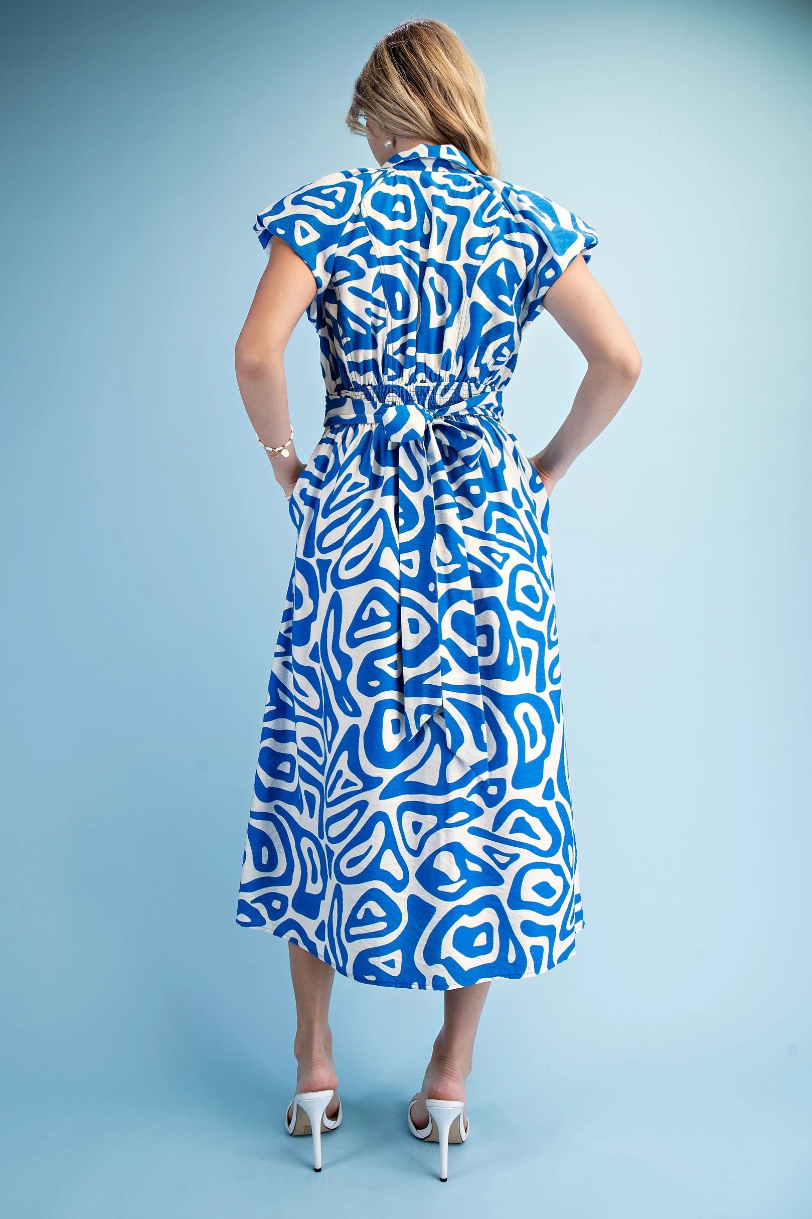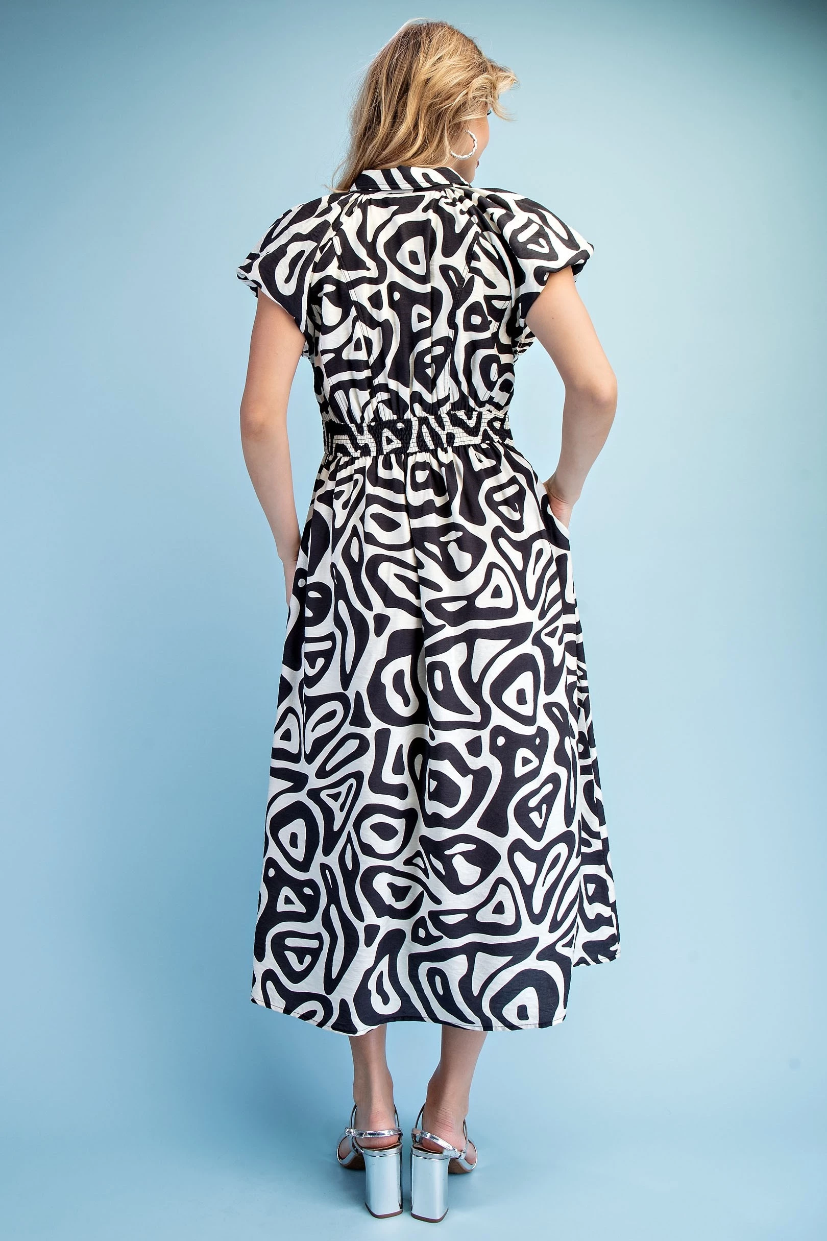Printed Half Button Midi Shirt Dress with Trapunto Stitching and Back Elastic Waist. The Dress is Lined
