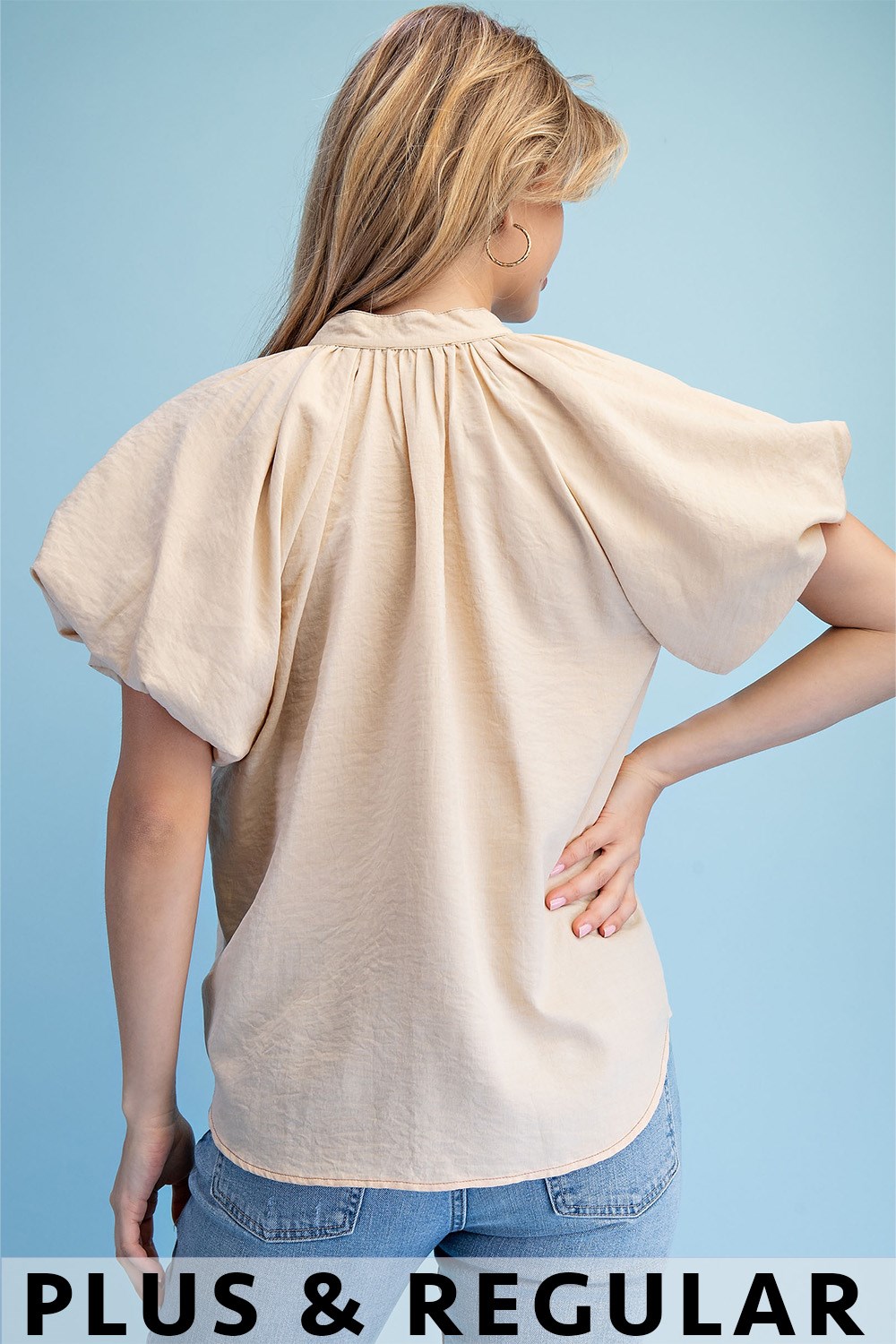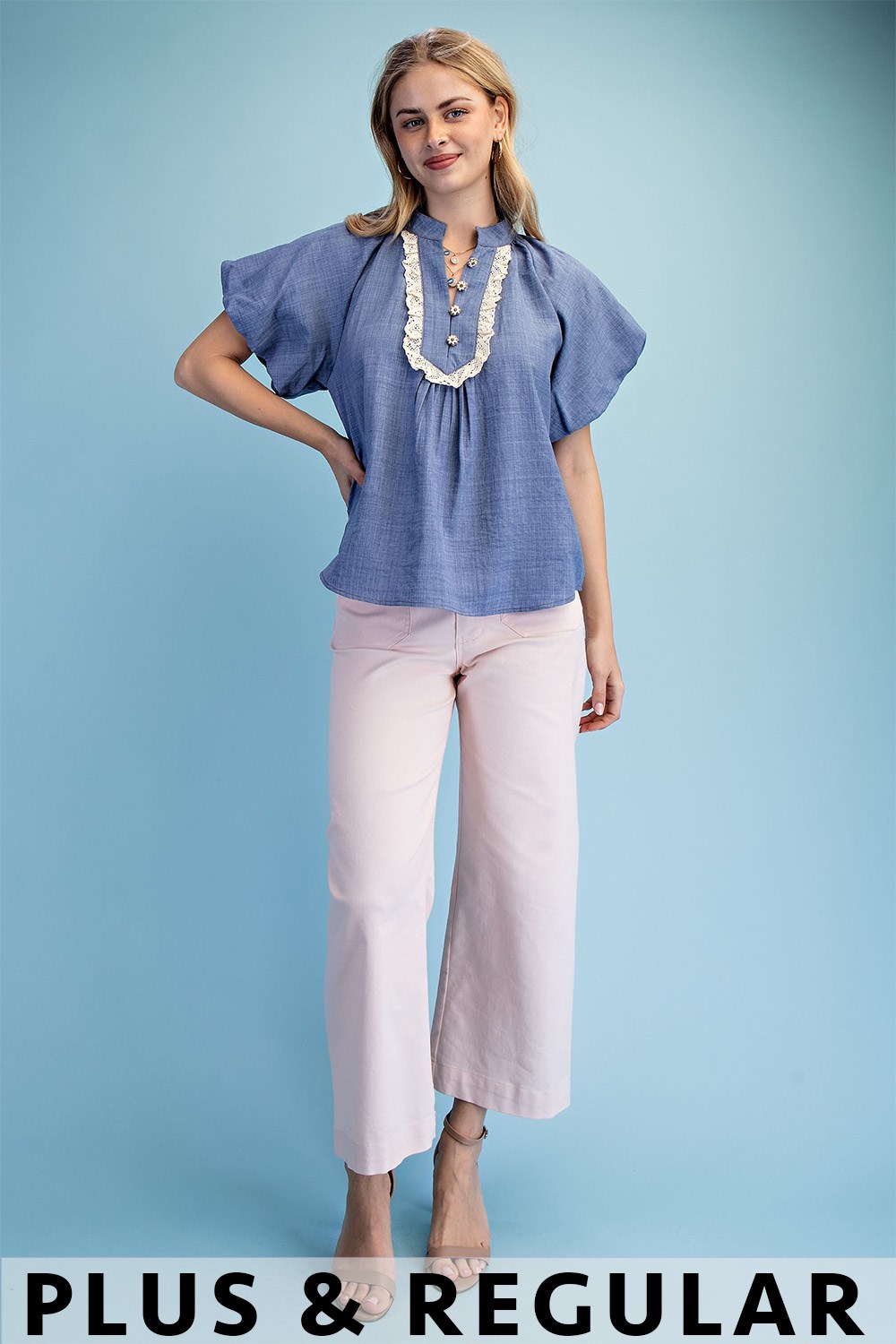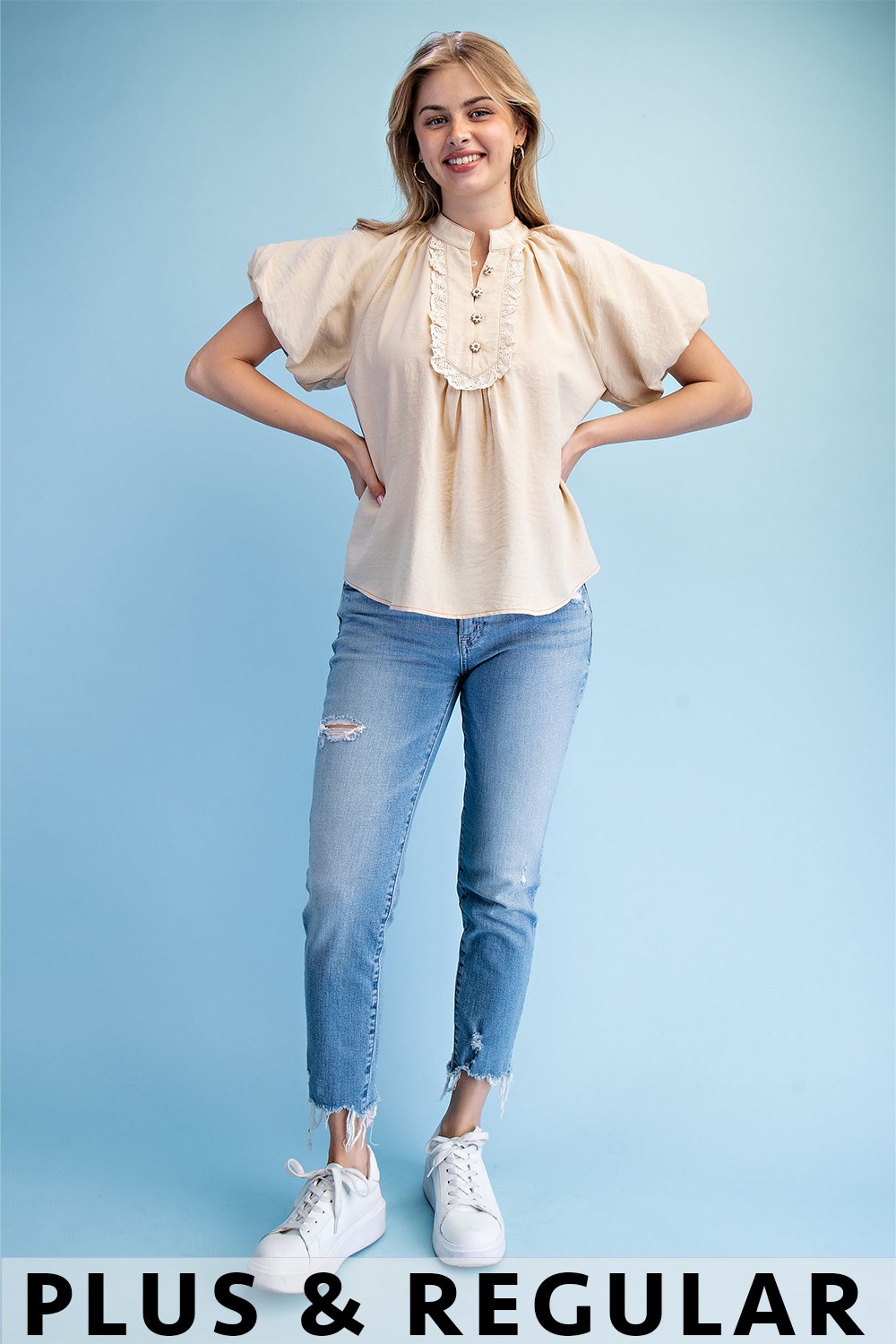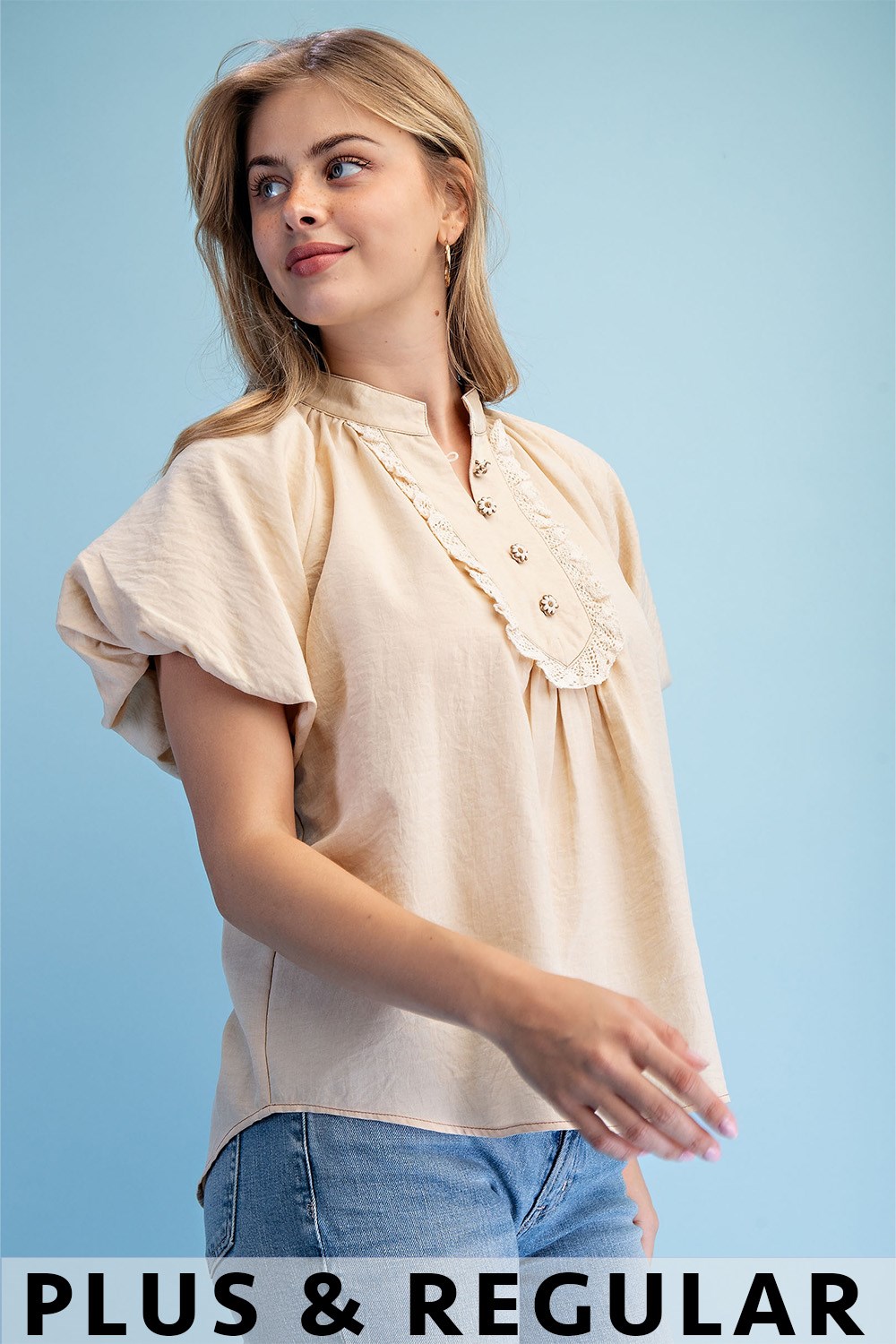 Half Button Short Puff Sleeve Top with a Lace Trim and Thread-Covered Flower Buttons