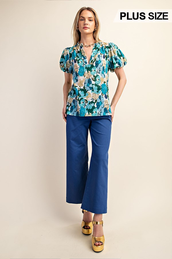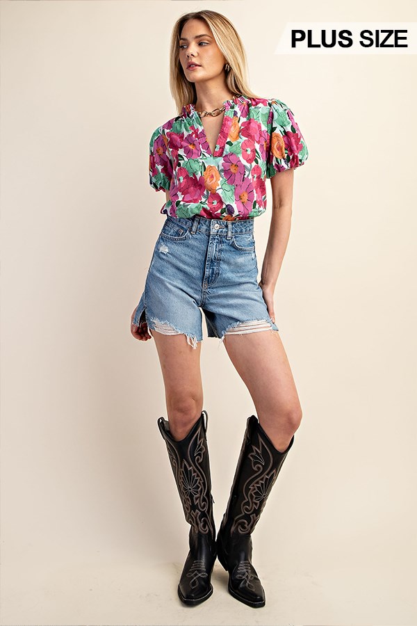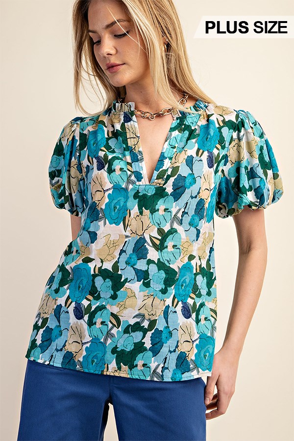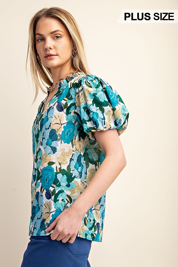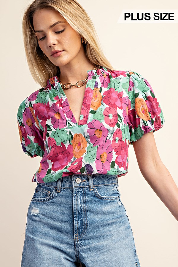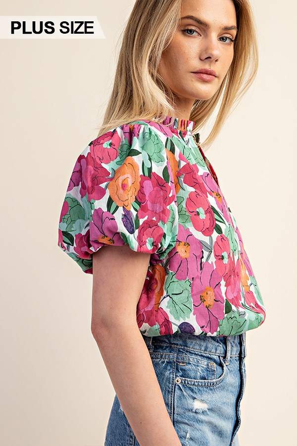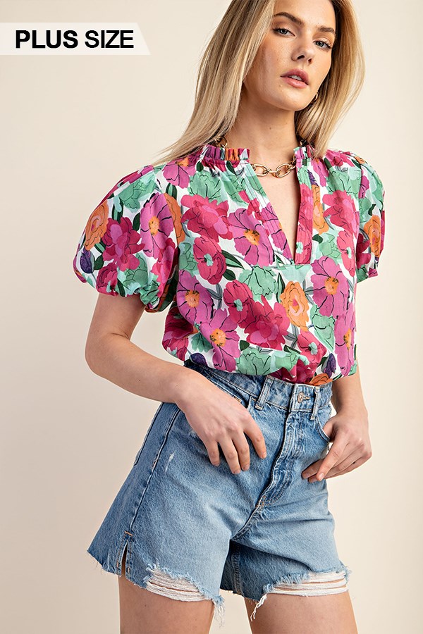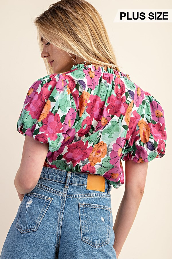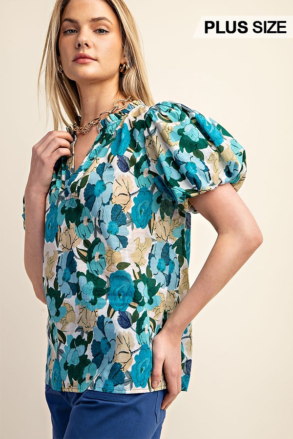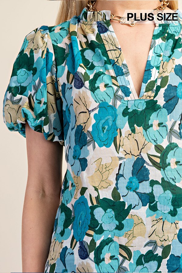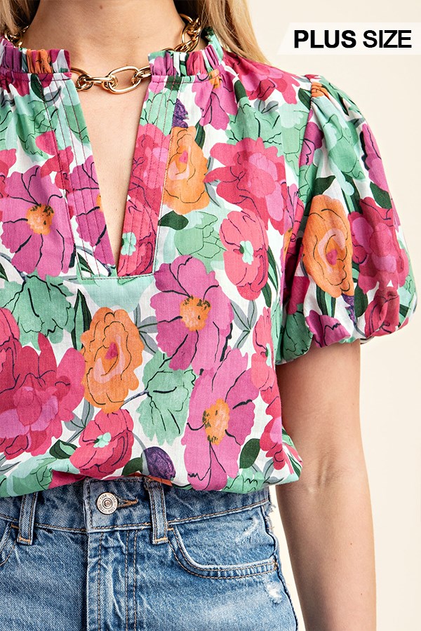 Floral Printed Button Down Top with 3/4 Length Gathered Balloon Sleeves