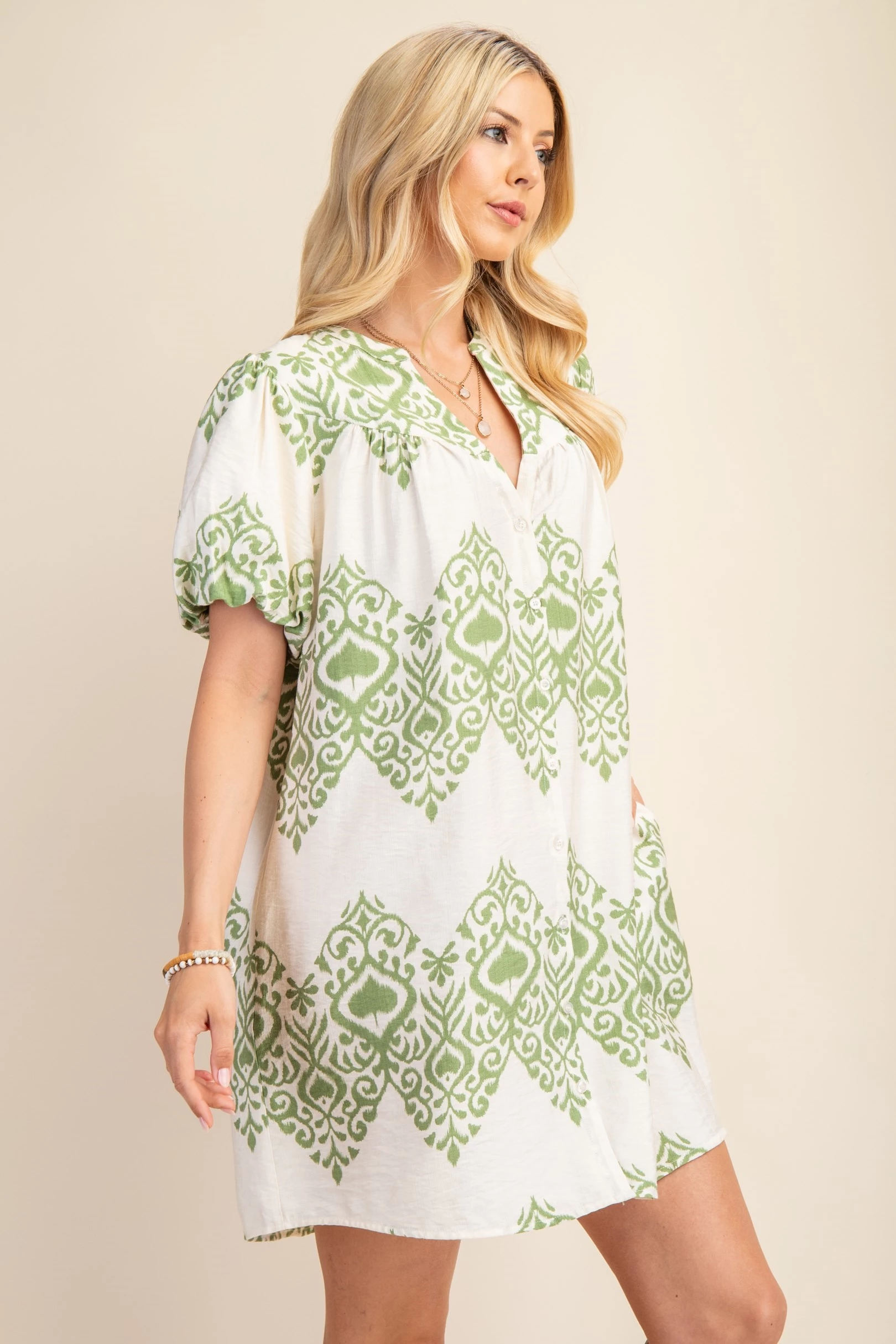 Printed Button Down Mini Dress with Puff Short Sleeves and Side Pockets